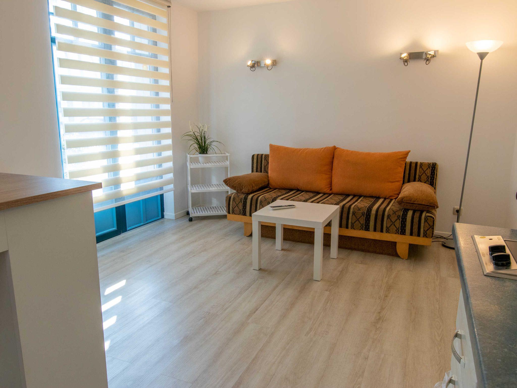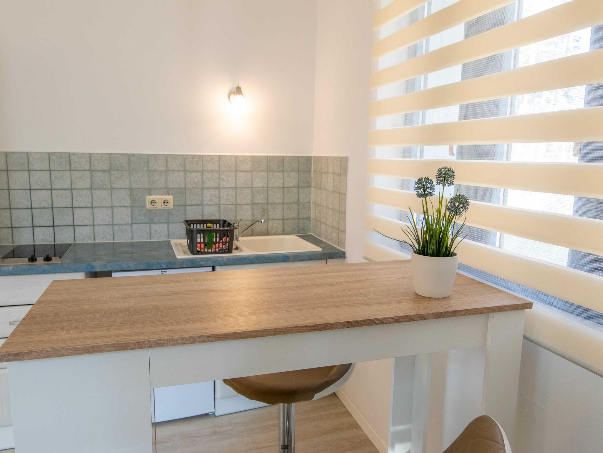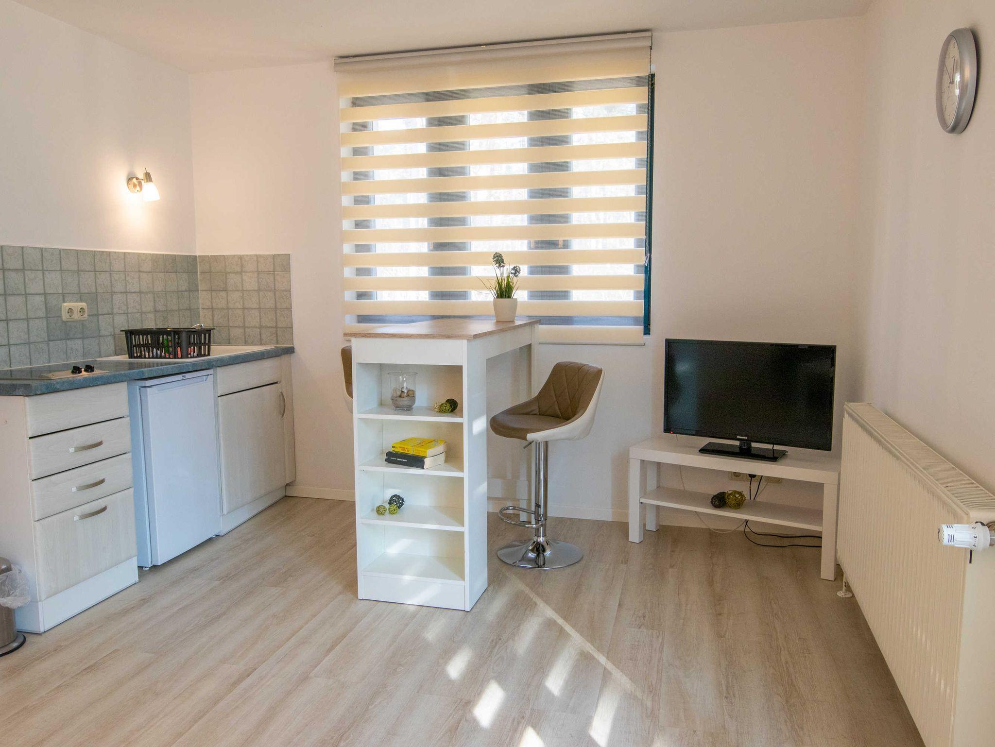 Das Wohnzimmer ist mit einer modernen Schlafcouch (Aufbettung für 2 Personen), TV, einem Esstisch und einer Miniküche mit Kühlschrank eingerichtet. Im Schlafzimmer befindet sich ein gemütliches Doppelbett mit Kleiderschrank. Das freundliche Tageslichtbad hat eine Dusche und ein WC. Zum Entspannen und Sonne tanken lädt die Gemeinschaftsterrasse ein.
