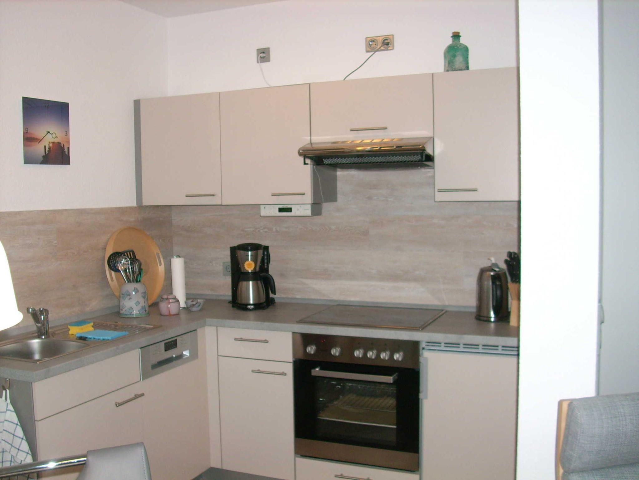 mit offener Wohnküche, Einbauküche mit Kühlschrank/Gefrierfach, Herd mit Ceran- Kochfeld und Backofen, Umlufthaube, kleine Spülmaschine, Mikrowelle, Kaffeemaschine, Wasserkocher, Toaster