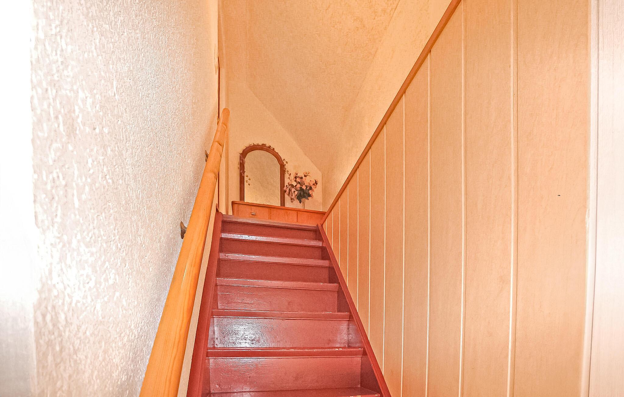 Das ca. 70 qm große, familienfreundliche Nichtraucher-Ferienhaus erstreckt sich über zwei Etagen. Im Erdgeschoss befinden sich eine große Küche (Essecke, E-Kocher, Kühlschrank mit Gefriermöglichkeit, Mikrowelle, div. Küchenkleingeräte) und das Bad (Dusche, WC, Fön), jeweils mit Ausgang zur Terrasse. Im Obergeschoss (relativ steile Treppe!) liegt das große Wohnzimmer (Schlafcouch - Aufbettung für zwei Personen, Esstisch, Flachbild-TV, Schrankbett - Aufbettung für ein Kind) und das Schlafzimmer (Doppelbett, ein Einzelbett). Zusätzlich stehen eine große Terrasse, eine Holz-Sitzgruppe direkt vor dem Haus, eine weitere Sitzecke mit Spielgeräten im Garten, Grill und Feuerschale, Parkplatz, Fahrrad-Unterstellmöglichkeiten, Kinderbett- und Hochstuhl sowie elektrische Heizkörper zur Verfügung.
