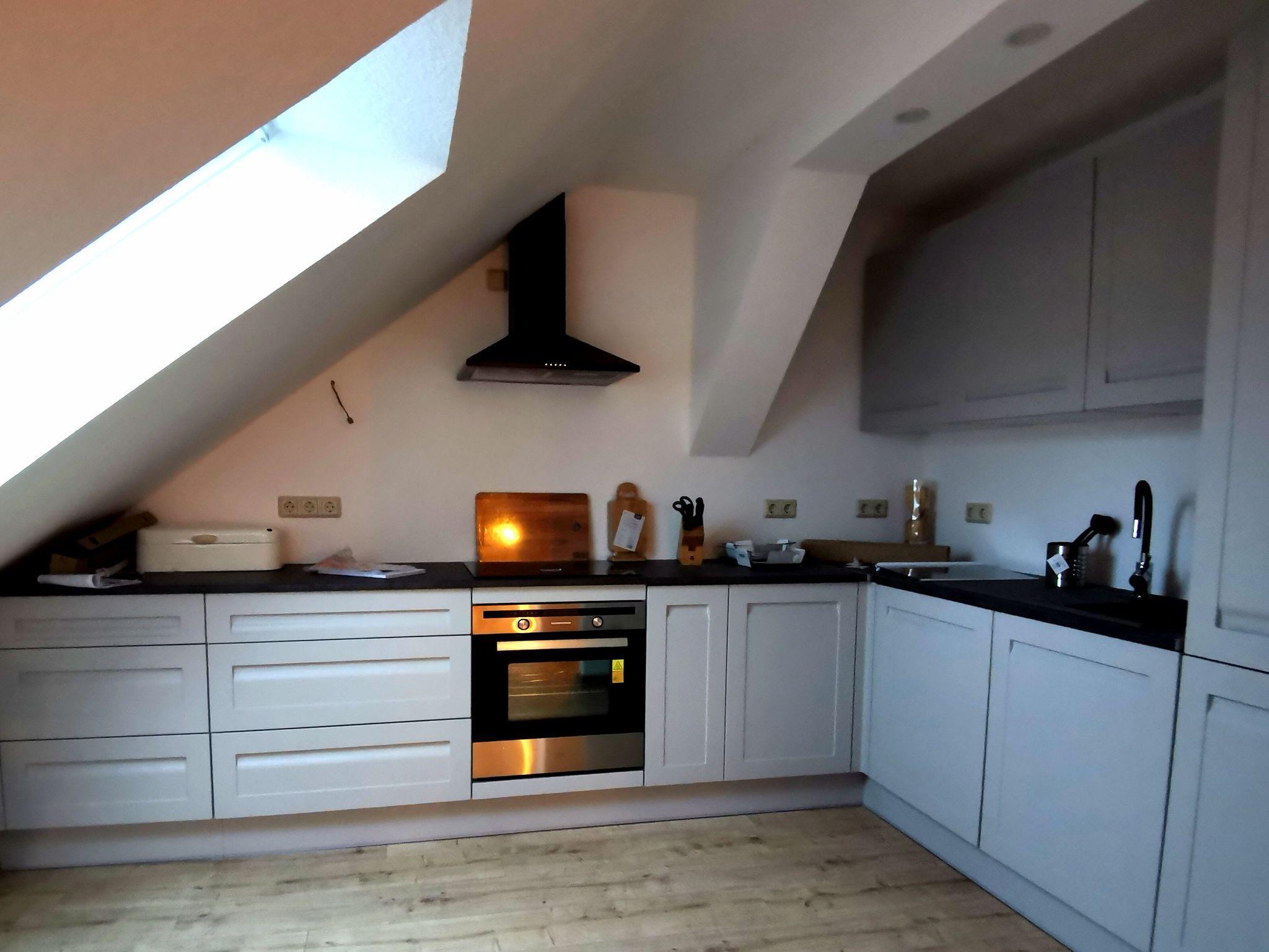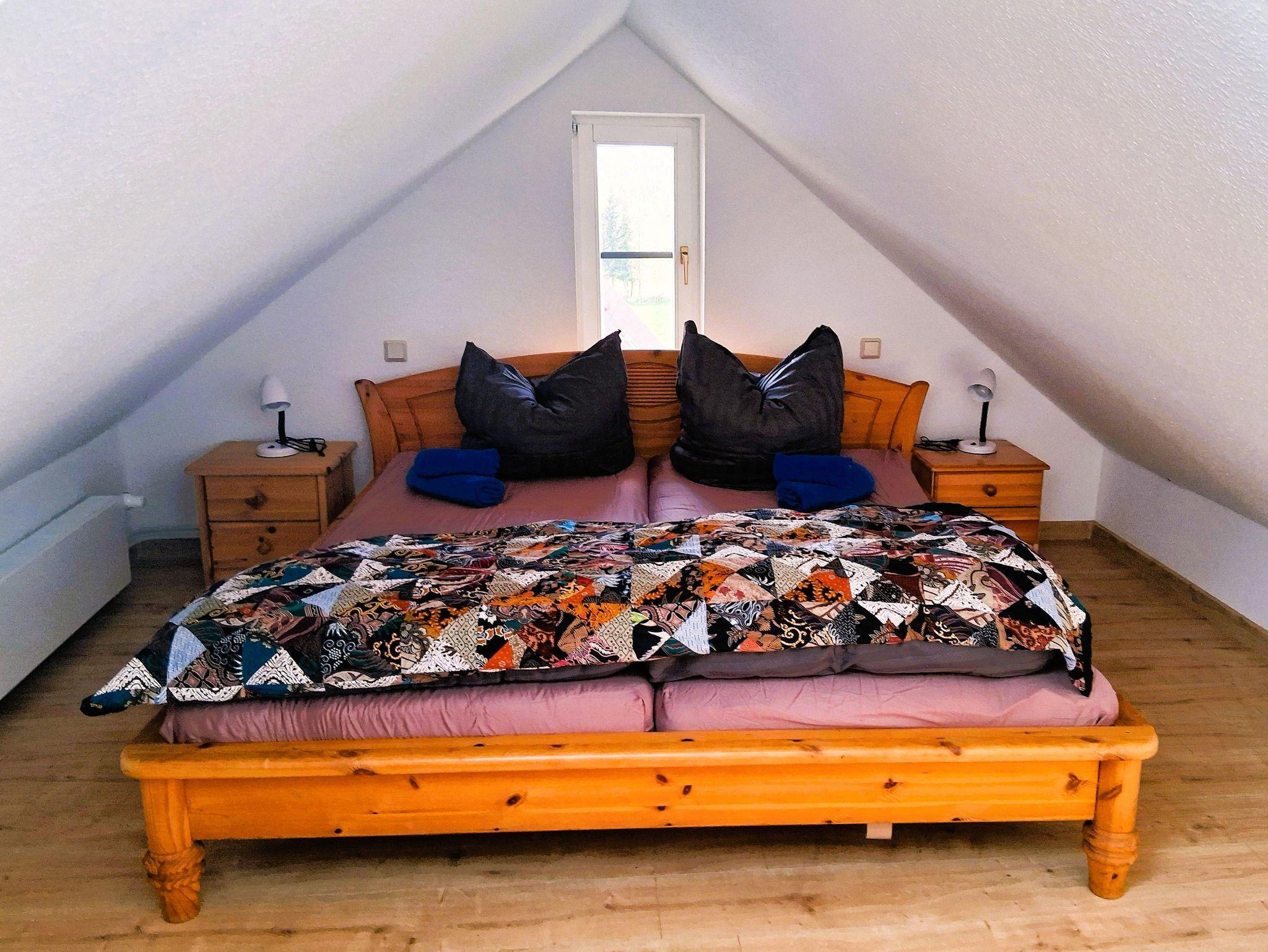 Die Wohnung im Obergeschoss verfügt über eine große, gemütliche Wohndiele, einen großräumigen Wohn-Essbereich in Verbindung mit einer voll ausgestatteten Küche, 2 Schlafzimmer sowie ein modernes Bad und eine weitere große Toilette. Über eine Innentreppe erreichen Sie den Spitzboden mit zwei weiteren großen Schlafzimmern. Im Schutz zweier stattlicher Eichen haben Sie von der Terrasse aus einen weiten Blick in die Umgebung und auf das Gelände.