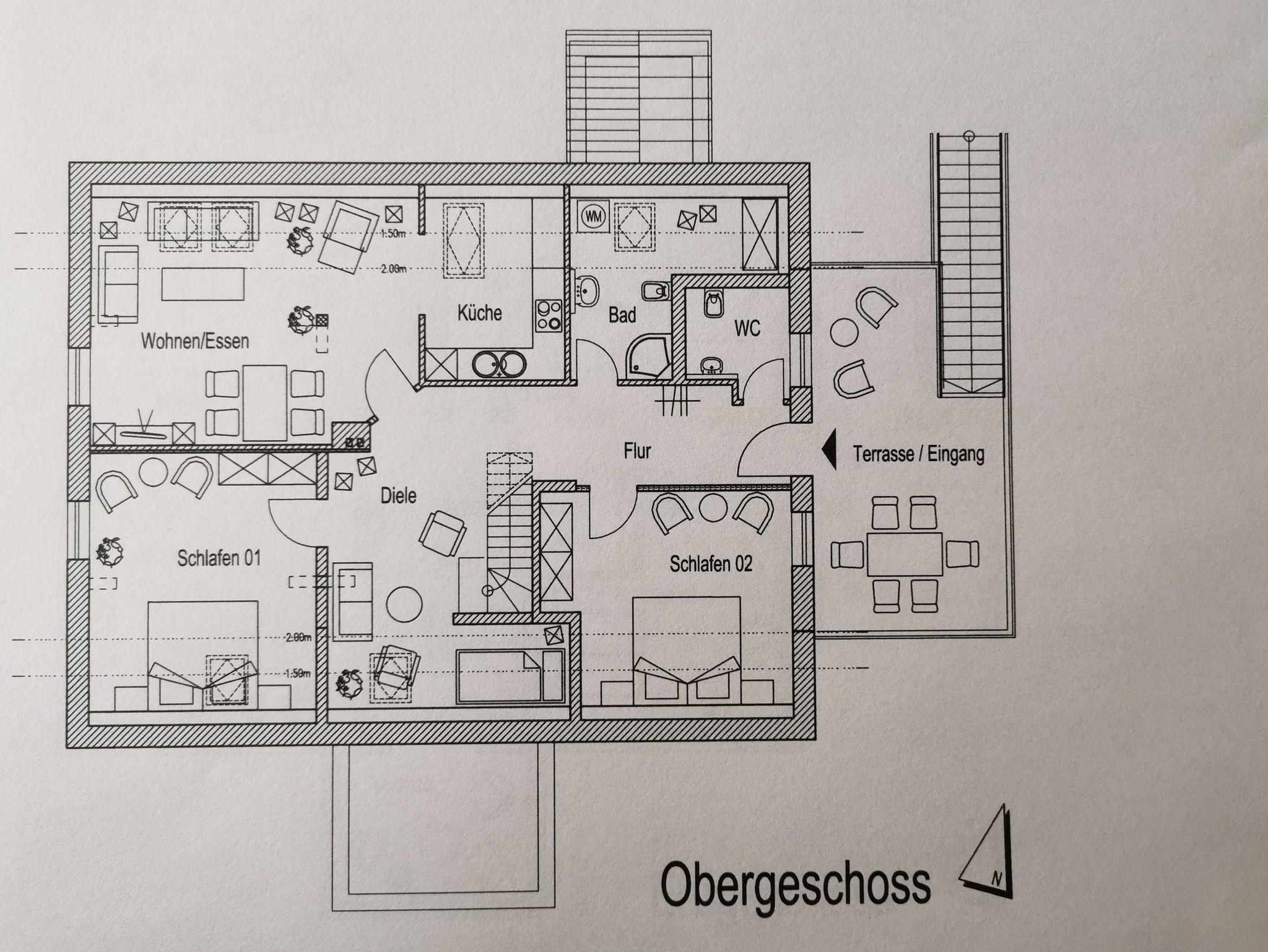 Beide Wohnungen verfügen über große Terrassen, jeweils mit Esstisch, Liegen und Grill. Auf der Terrasse im OG (17 m²), kann in der Sonne gefrühstückt werden, später bieten zwei Eichen wohltuenden Schatten. Auf der Terrasse im EG (25 m²) scheint die Sonne ab dem frühen Nachmittag.
