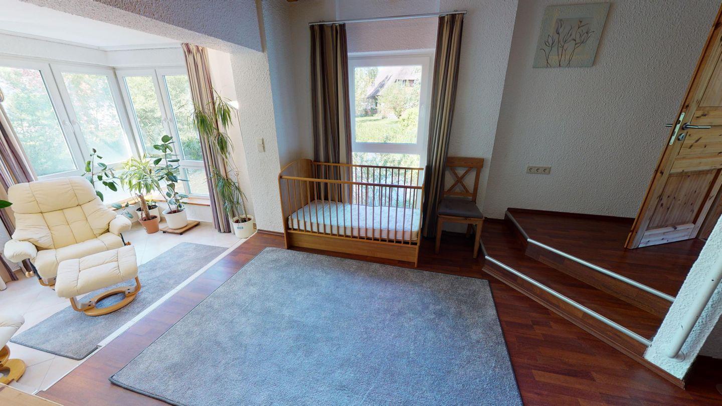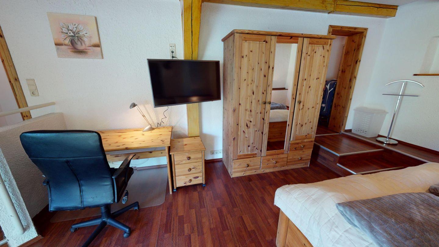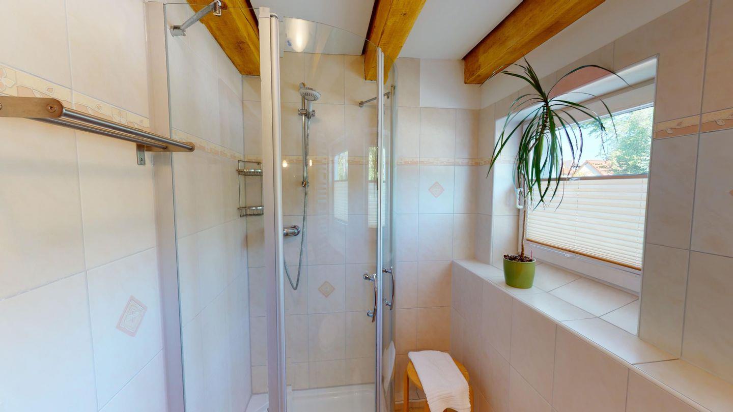 Im Erdgeschoss erwarten dich zwei gemütliche Schlafzimmer, jeweils mit einem Doppelbett ausgestattet. In einem davon steht zusätzlich ein Gitterbett für die Kleinsten bereit. Ein besonderes Highlight ist die kleine Sitzecke mit Fensterfront – von dort aus blickst du direkt auf das Wasser, das aus dem alten Mühlkanal unter den Fenstern hindurchfließt. Das Badezimmer auf dieser Etage verfügt über eine Dusche und ein WC.