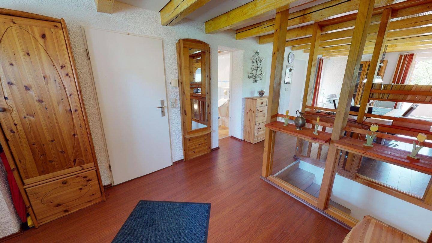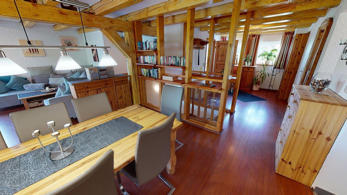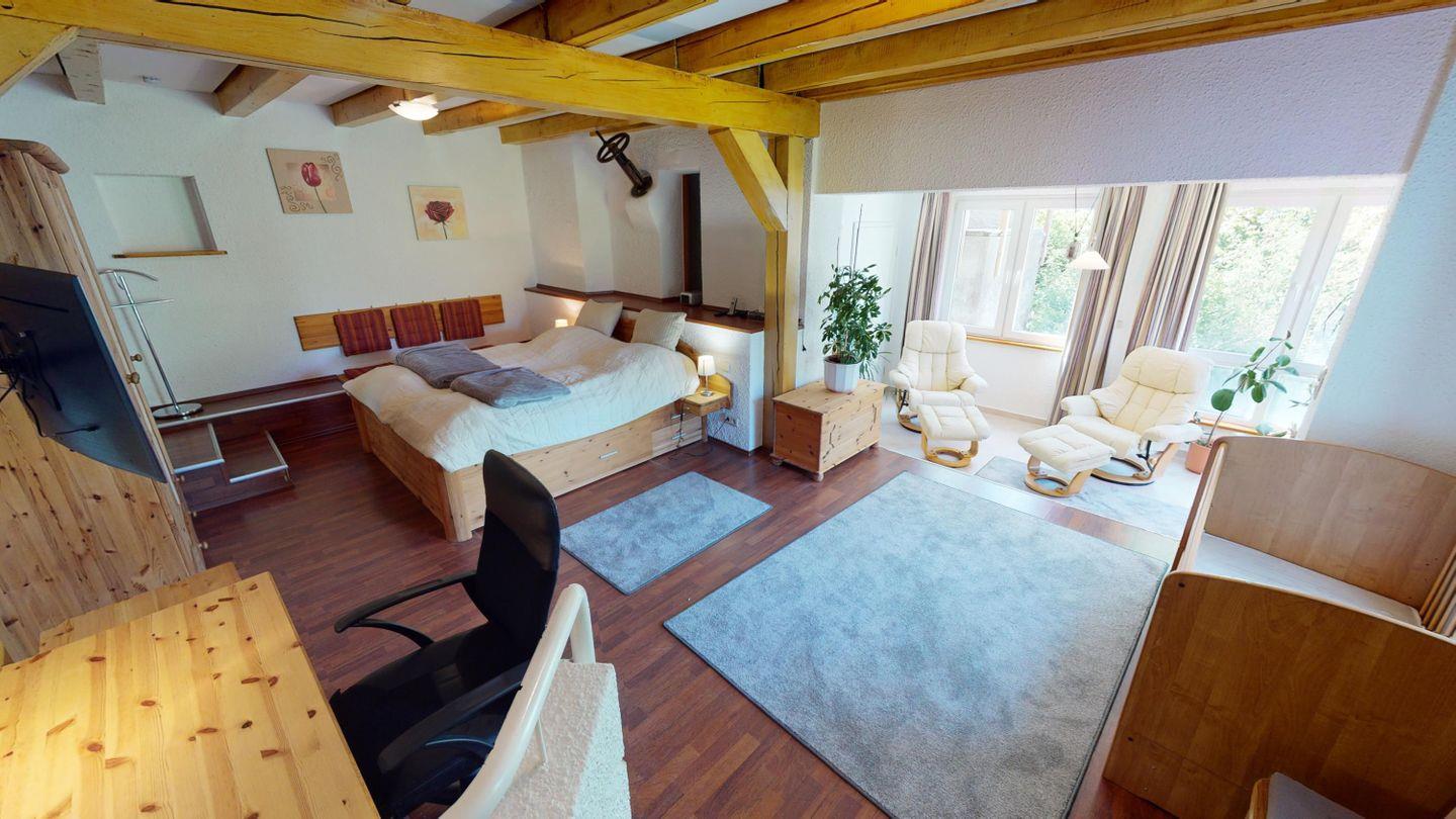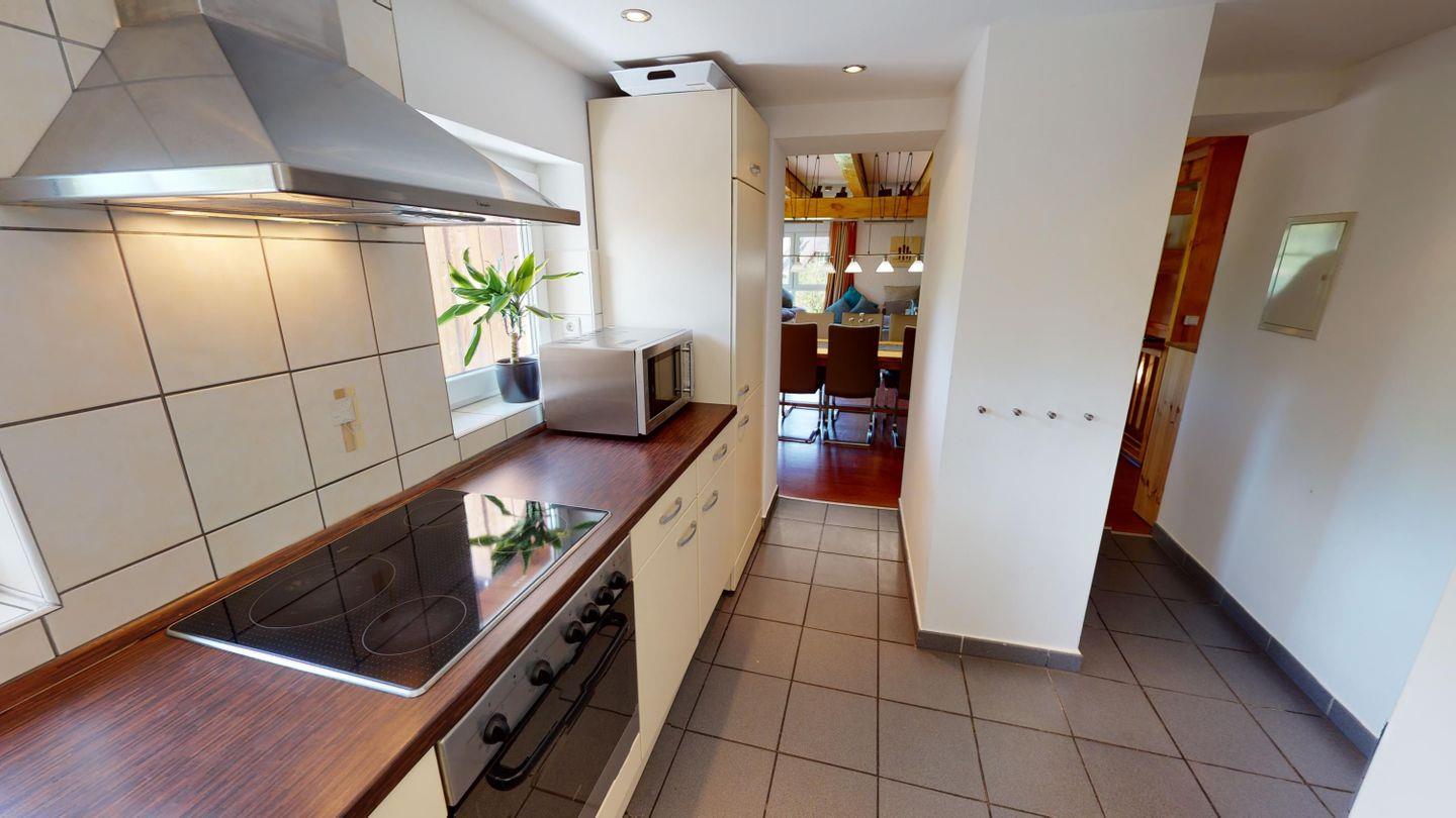Oben, im Obergeschoss, öffnet sich ein großzügiger Wohnbereich mit viel Licht, einer großen Couchecke und einem langen Esstisch für gemeinsame Mahlzeiten. Die angeschlossene Küche ist voll ausgestattet und lädt zum Kochen und Genießen ein. Von hier aus gelangst du auch auf die überdachte Terrasse – mit direktem Blick auf den Bachlauf und Platz für lange Abende im Freien, bei jedem Wetter. Das Badezimmer auf dieser Ebene ist besonders komfortabel: mit Whirlpoolwanne, Doppelwaschbecken, WC und Urinal. Wenn zwischendurch mal etwas gewaschen werden muss: Im Haus steht ein separater Raum mit Waschmaschine und Trockner zur Verfügung, den sich beide Wohnungen teilen. Ganz praktisch, gerade bei längeren Aufenthalten oder mit Kindern.