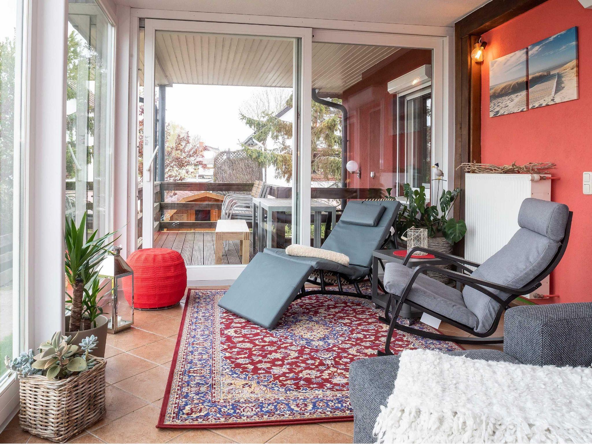 Das absolute “Highlight” des Hauses ist der Wintergarten. Man fühlt sich wie in freier Natur. Auch bei nicht so tollem Wetter ist es ein Genuss von hier aus, natürlich geschützt, die Vögel oder den Sonnenuntergang über dem Peene-Strom zu beobachten. Durch die Großzügigkeit des Hauses kann man sich übrigens auch mal ohne Probleme aus dem Weg gehen. Für die kleinen Gäste steht Ihnen ein großer Sandkasten im Garten des Hauses zur Verfügung.