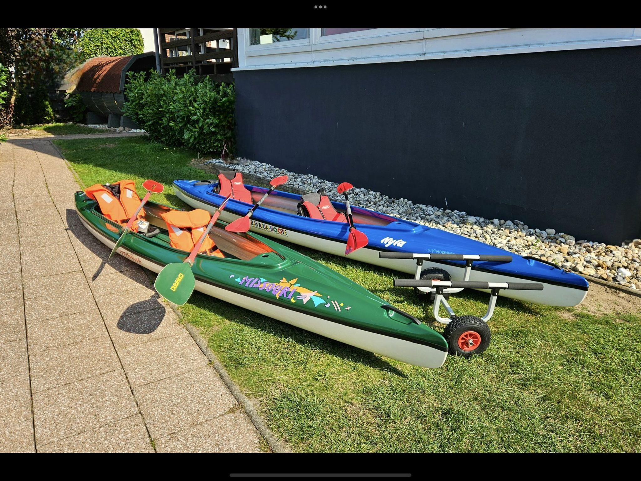 Es sind 2 Kajaks, inkl. Rettungswesten, Paddel und Transportwagen je für 89€ pro Woche zubuchbar.