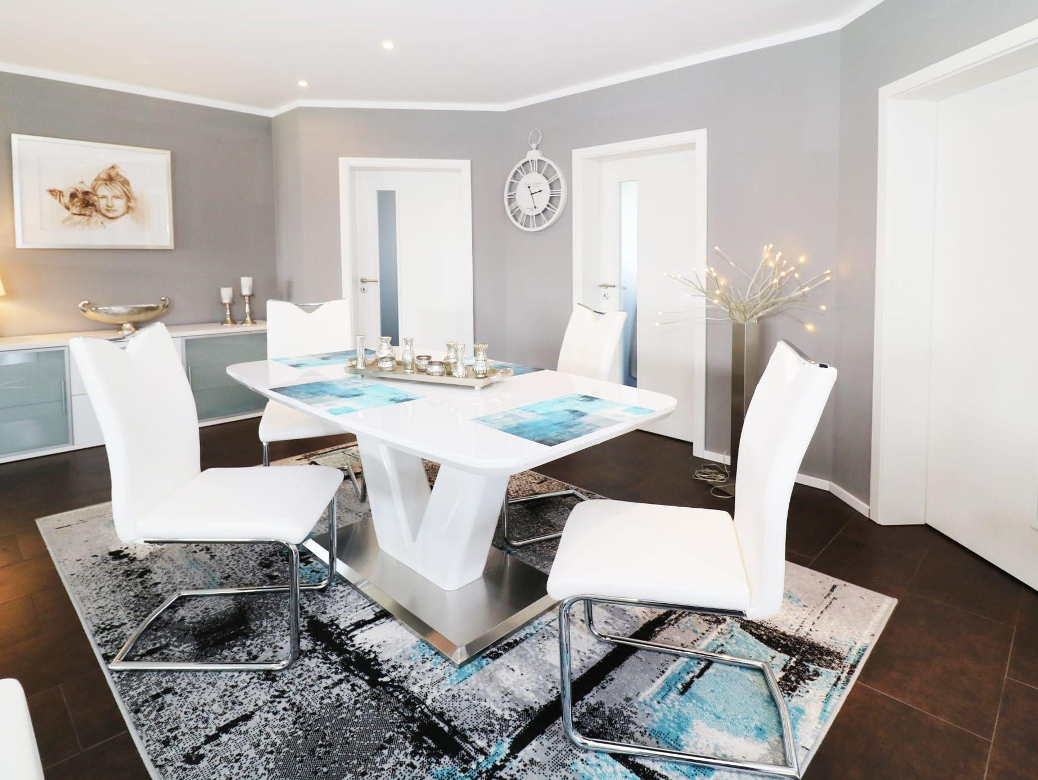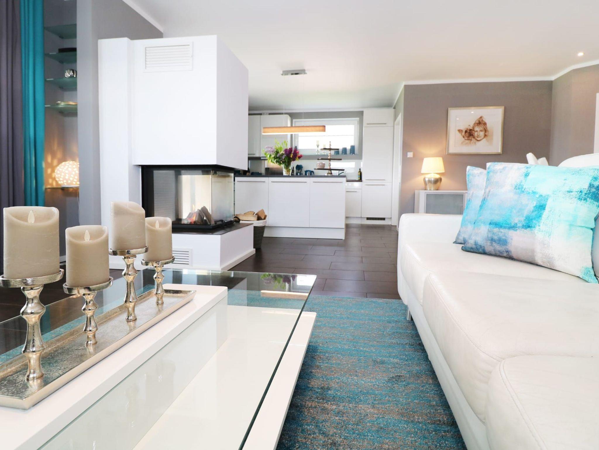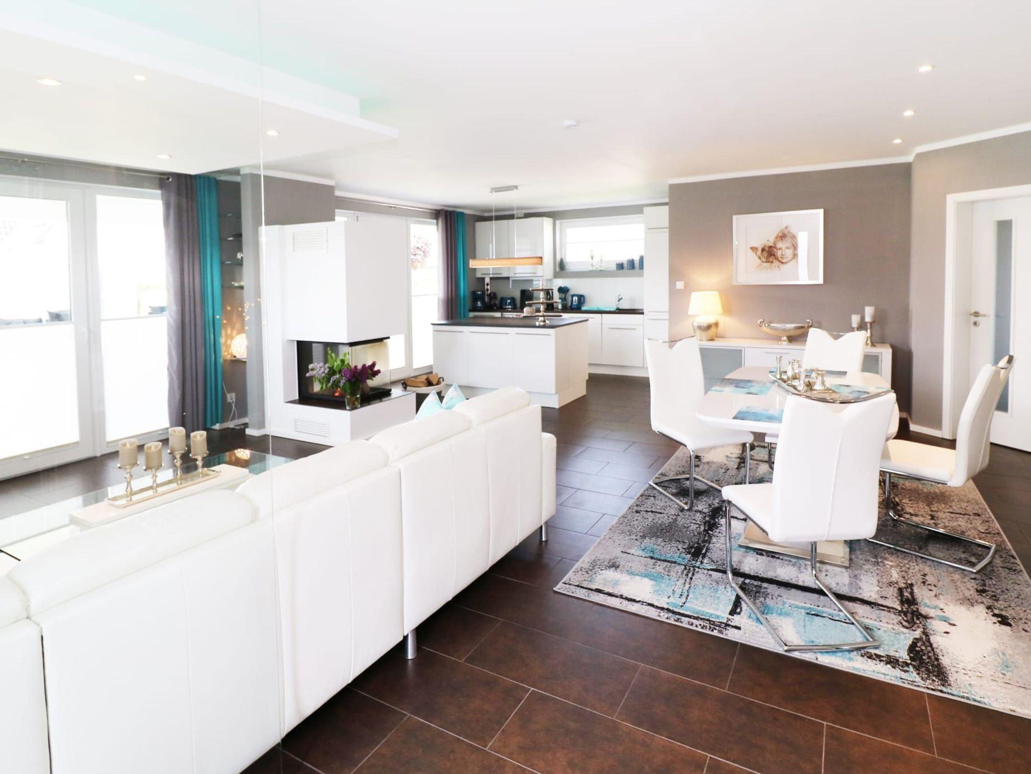 Der offene Wohn- und Essbereich mit Kamin bildet das Herzstück des Hauses. An kühleren Tagen genießen Sie gemütliche Abende vor dem Feuer oder entspannen auf dem großzügigen Sofa mit Smart-TV, Streaming-Möglichkeiten und WLAN.