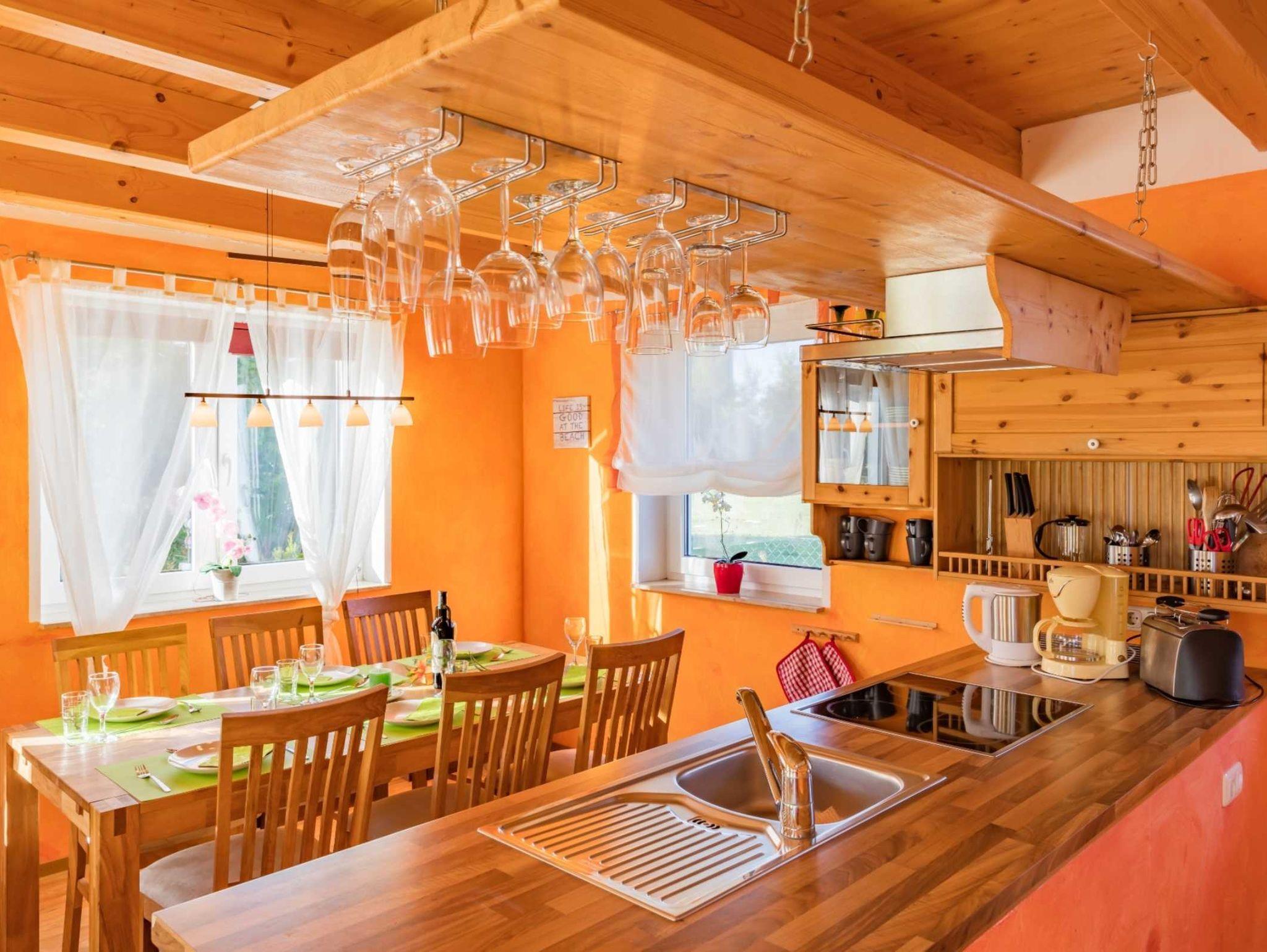 Im Erdgeschoss befinden sich der Wohn-/Essbereich mit einer vollständigen Küchenzeile mit Spülmaschine und Cerankochfeld mit Backofen, ein Bad mit Dusche und WC sowie ein Schlafzimmer (Doppelbett).