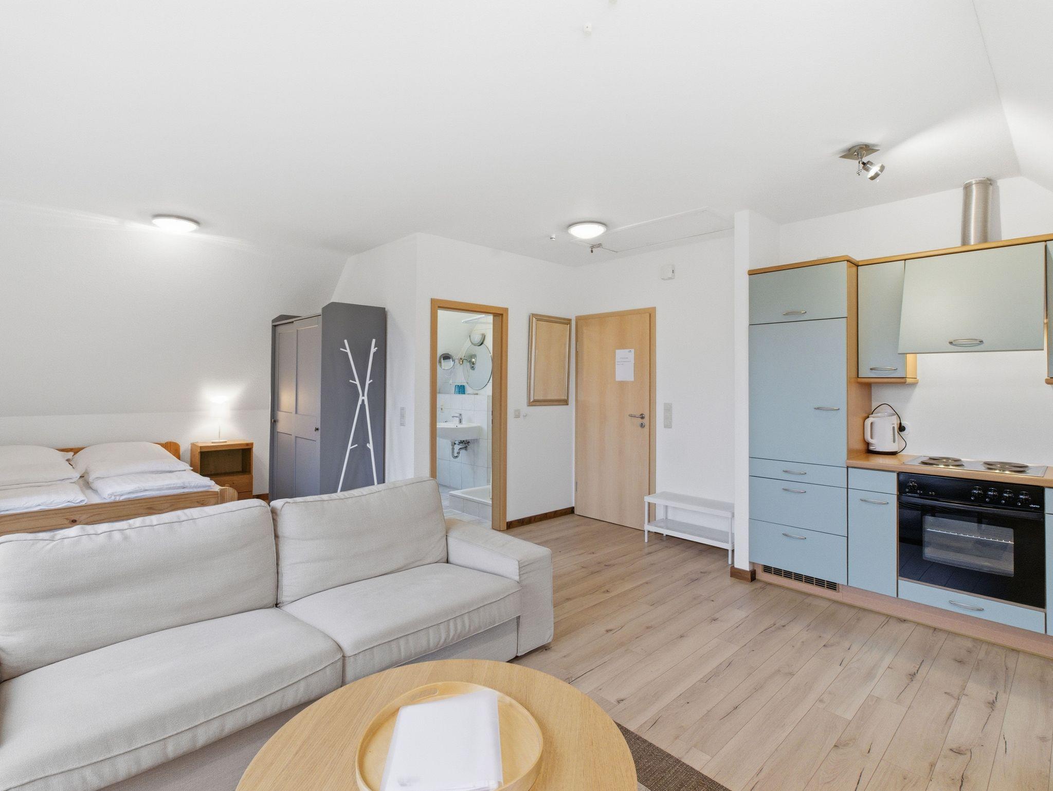 Das Apartment ist ausgestattet mit einer großen Sitzgruppe, Schränken, einem Bad mit Dusche, Küchenzeile, Esstisch und abgeteiltem Doppelbett. Die Ferienwohnung verfügt über einen geräumigern Balkon mit Sitzgruppe und Sonnenschirm. Der Garten mit Grillmöglichkeit kann gerne mitbenutzt werden.
