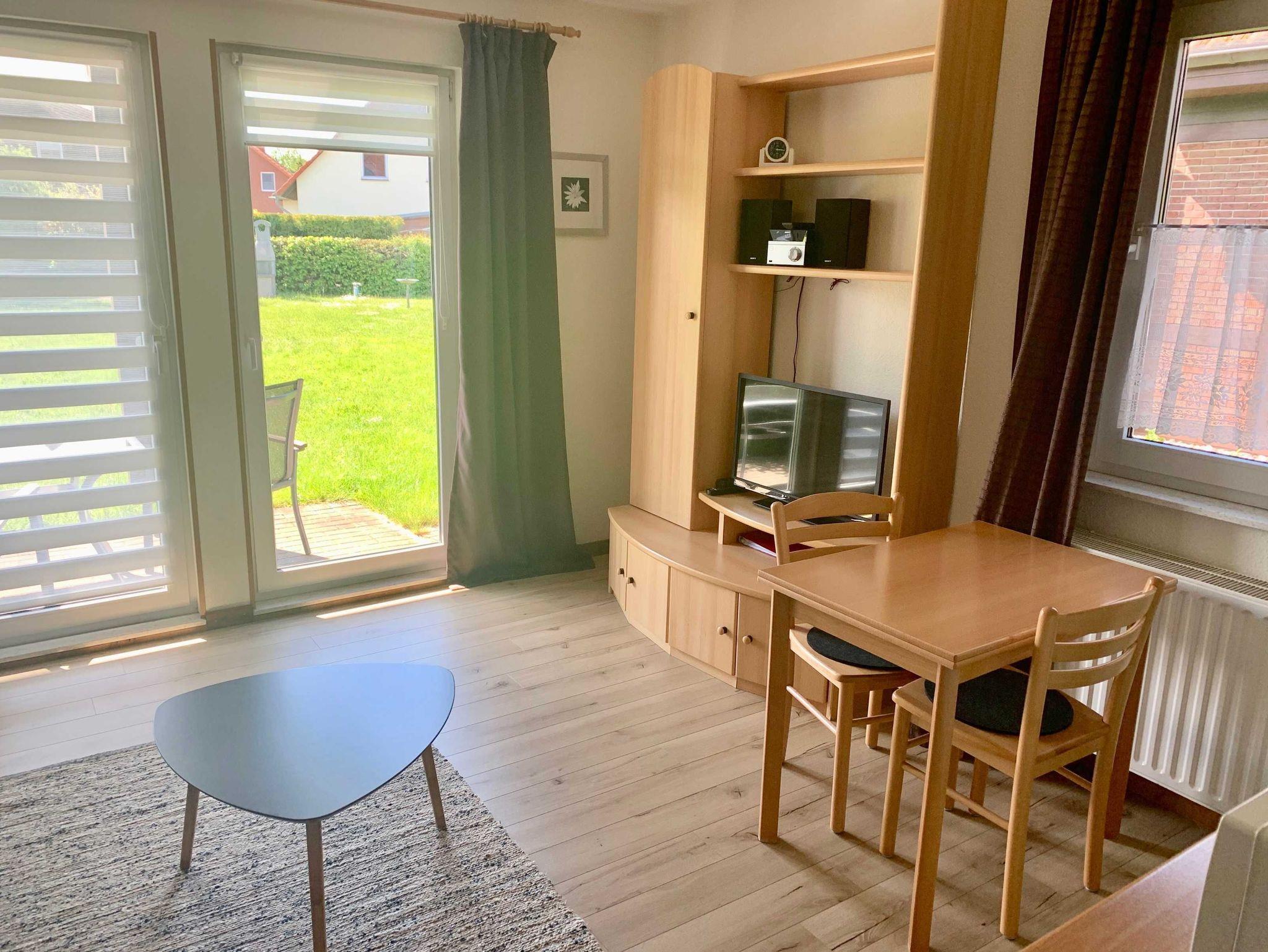 Die Ferienwohnung ist ausgestattet mit einem großen Wohn- und Schlafsofa, Sessel, Schränken, einem Bad mit Dusche, einer Küchenzeile und Esstisch. Der Zugang zum großen Garten bietet beste Erholung auch im Freien! Eine Sitzgruppe mit Sonnenschirm sorgt für Gemütlichkeit im Grünen. Im Garten finden Sie zudem Sonnenliegen sowie einen Grillplatz mit wetterfestem Unterstand.