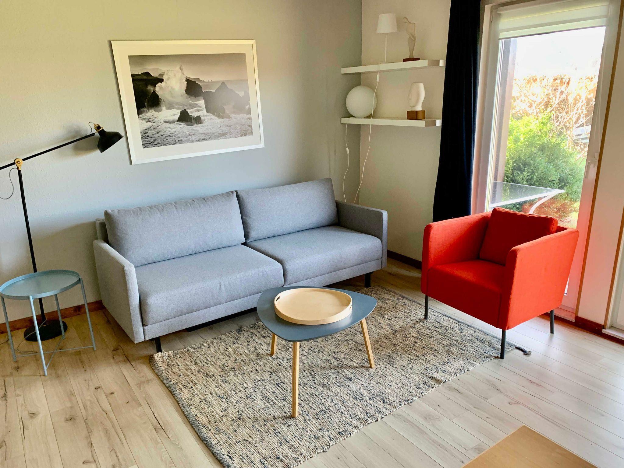 Die Ferienwohnung ist ausgestattet mit einem großen Wohn- und Schlafsofa, Sessel, Schränken, einem Duschbad, einer Küchenzeile und Esstisch.
