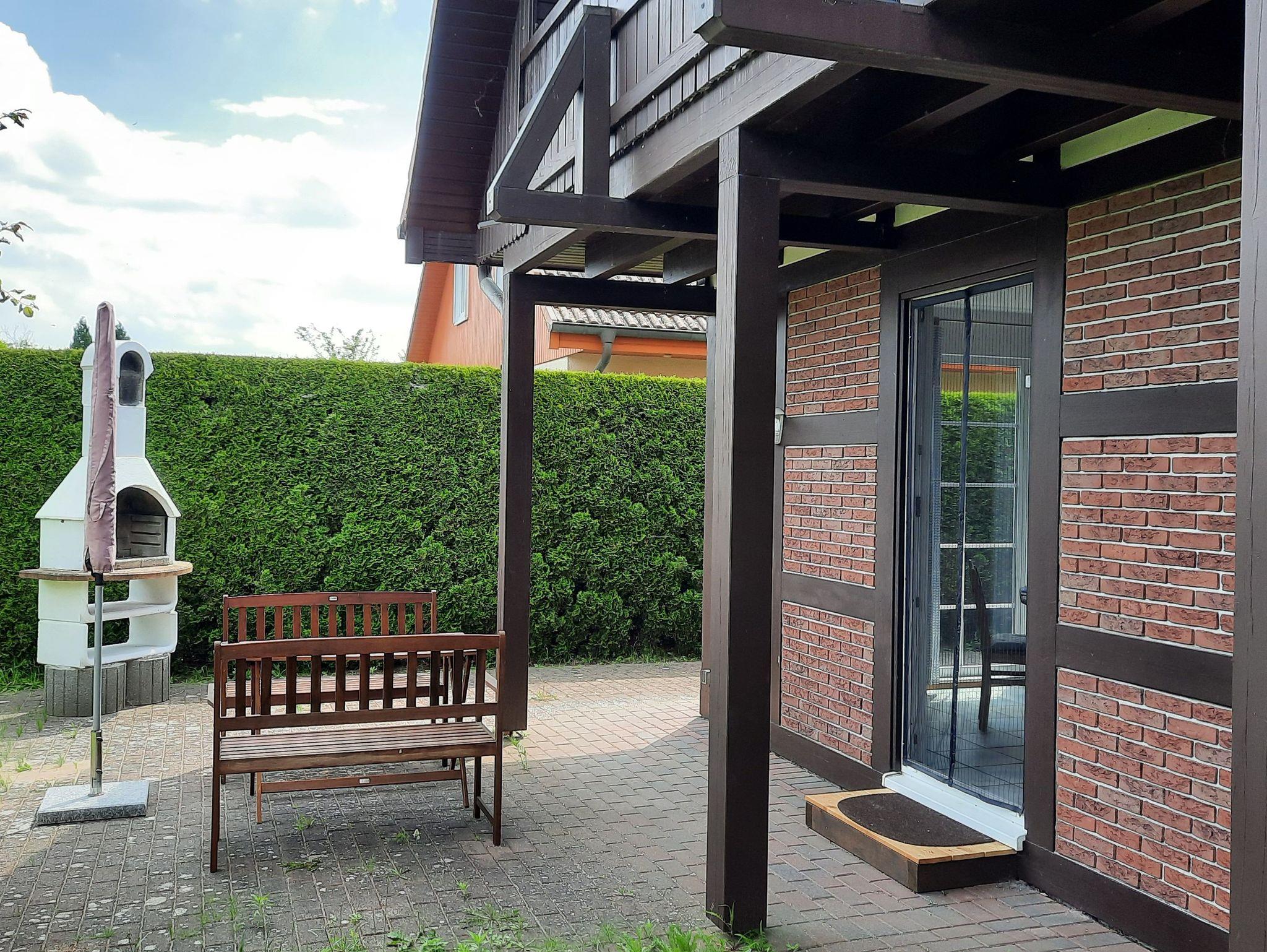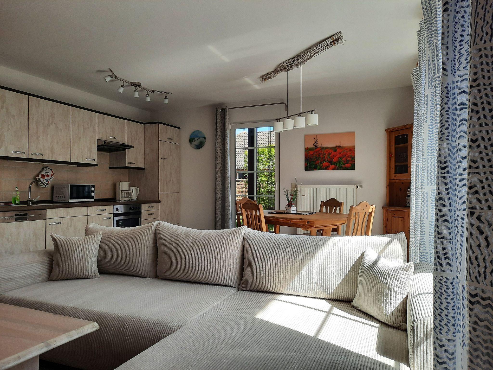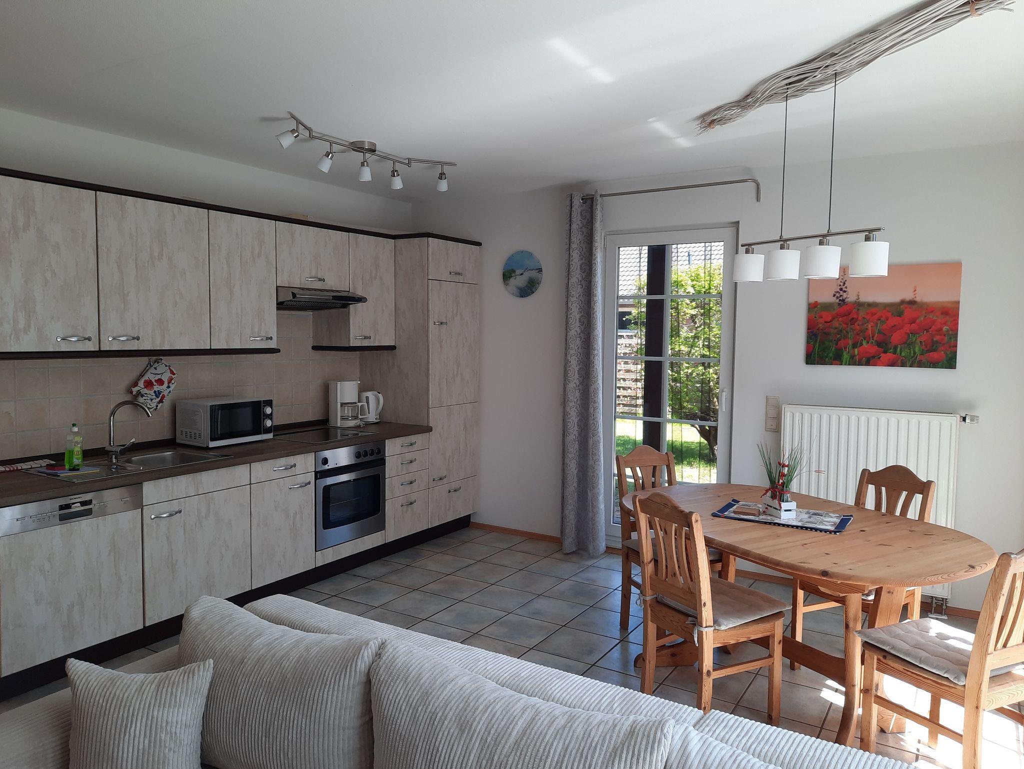 Erdgeschosswohnung: 64 m², 2 Schlafzimmer, WohnnEssbereich, Küche, Bad (Dusche + Badewanne), Terrasse + Garten mit Grill, WLAN, Parkplatz am Haus, 2 Hunde willkommen