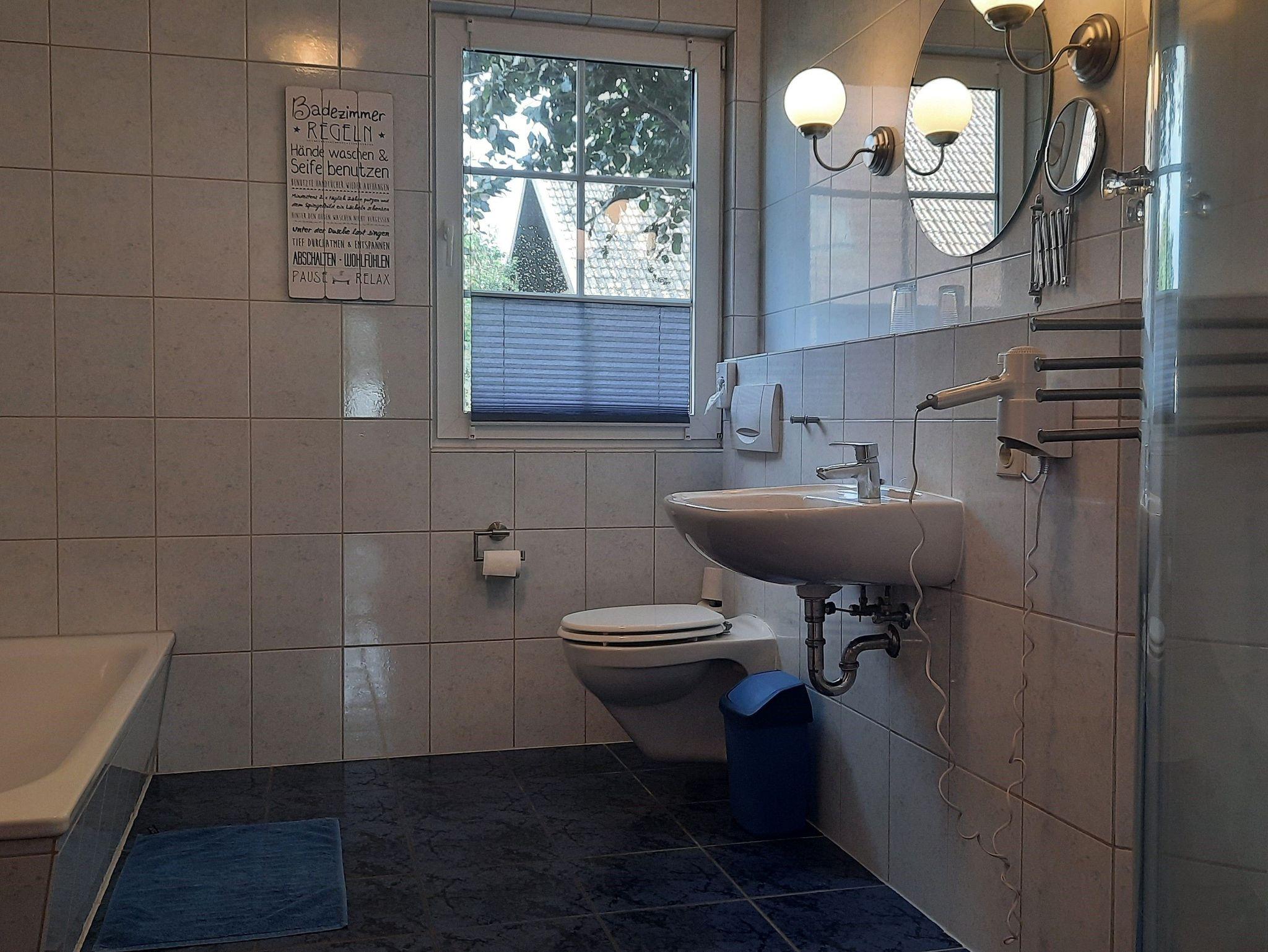 Das Tageslicht-Badezimmer verfügt sowohl über eine Dusche als auch eine Badewanne sowie aschbecken,Spiegel, WC, Ablagefläche und Haartrockner.