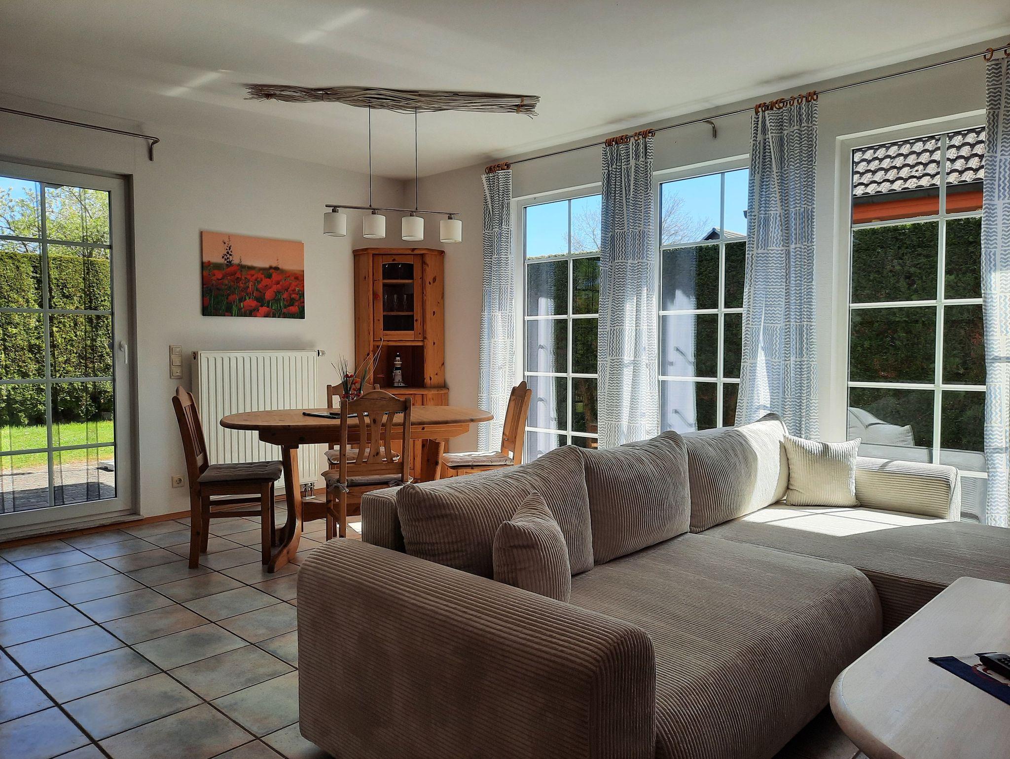 Der Wohn- und Essbereich ist gemütlich mit zwei Sofas, Couchtisch und Kommode eingerichtet. Flachbild-TV, Stereoanlage, CD-Player und WLAN bieten Ihnen Unterhaltungsmöglichkeiten. Der Essbereich lädt zu gemeinsamen Mahlzeiten und Spieleabenden ein. Von hier aus geht es auf die überdachte, möblierte Terrasse. Im eigenen umzäunten Garten steht ein Grill zur Verfügung.