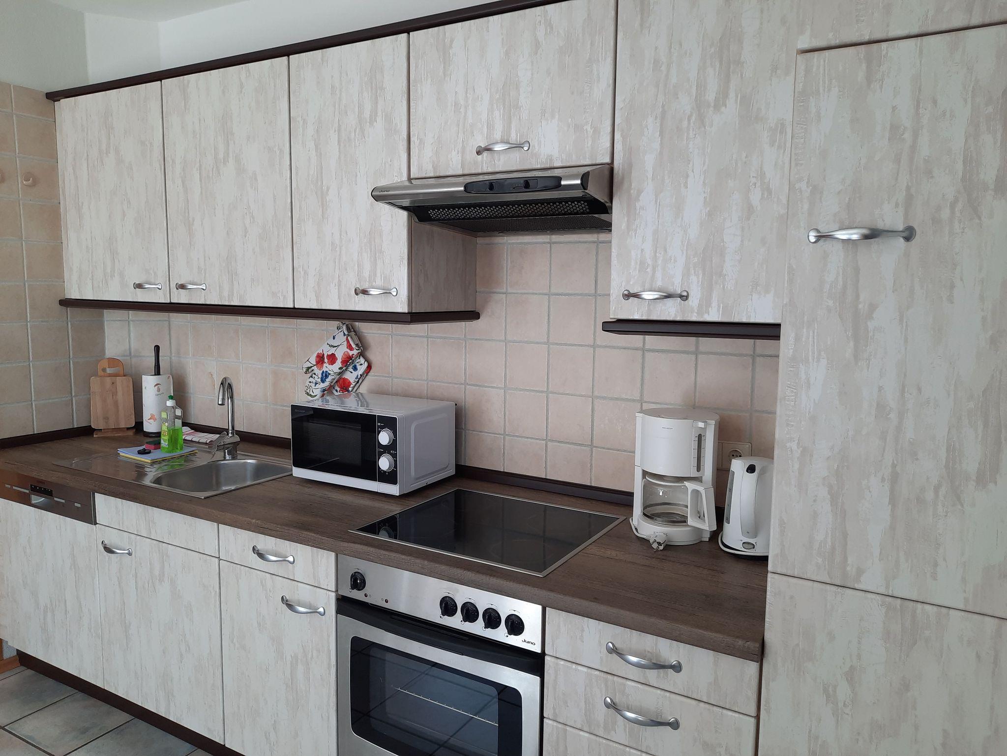 Die offene Küche ist mit einem Backofen und einem Cerankochfeld, Spülmaschine, Kühlschrank mit Gefrierfach, Kaffeemaschine, Wasserkocher, Toaster und vielen weiteren Kochutensilien ausgestattet.
