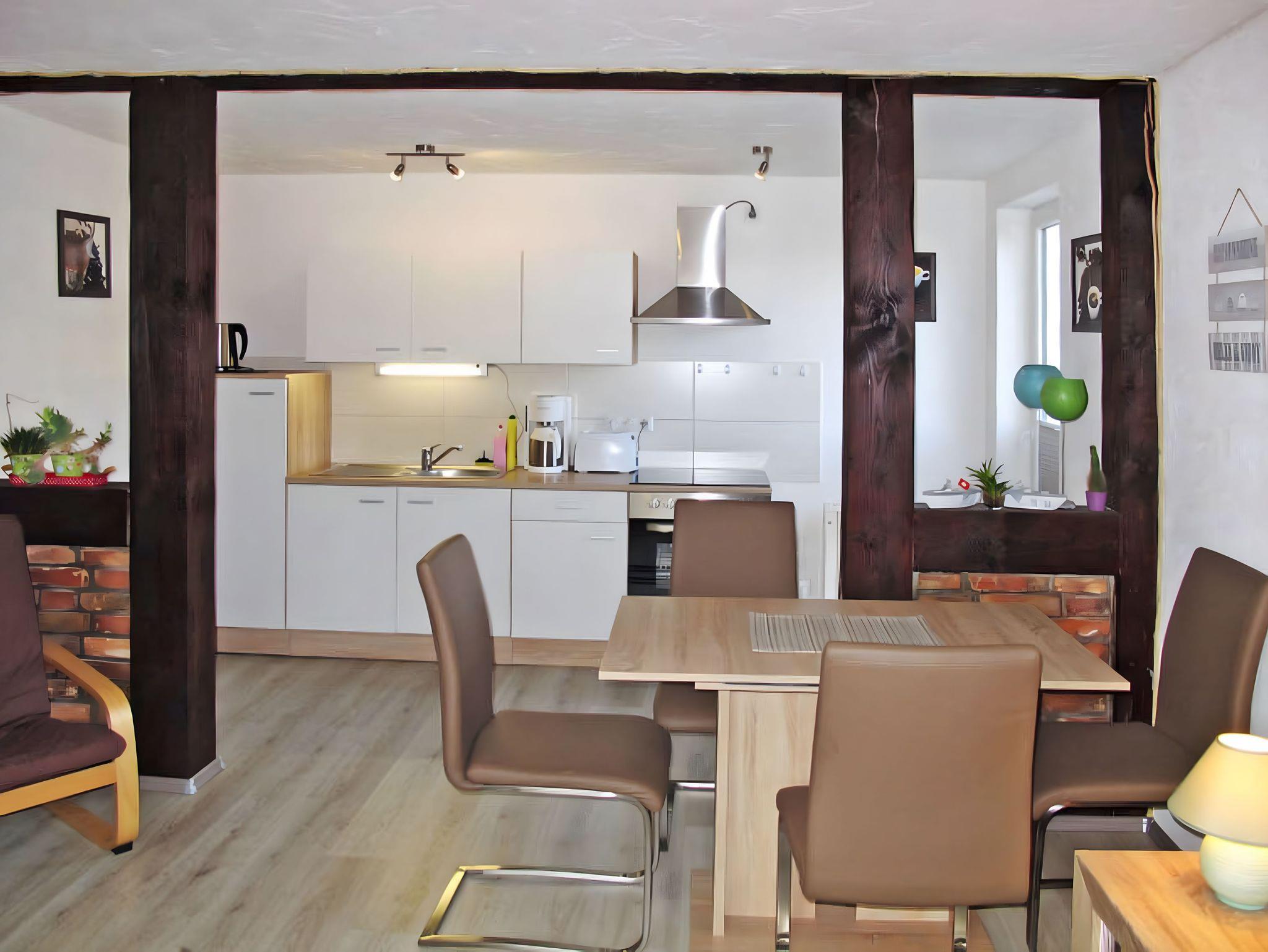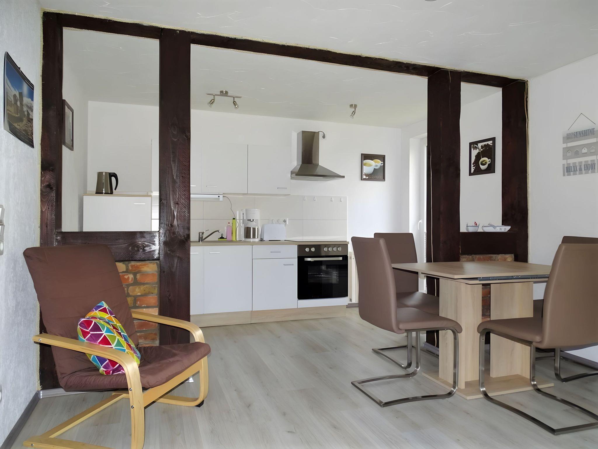 Unsere rustikal-gemütliche Erdgeschosswohnung ist 60 m² groß und eignet sich ideal für bis zu 4 Personen zzgl. 1 Kleinkind bis 2 Jahre. Der offene Wohnraum gliedert sich in den Wohnbereich mit Schlafcouch und eine vollwertig ausgestattete offene Küche mit Essplatz. Als Raumteiler dienen dunkle Holzbalken, die den Charakter des Dorfes Bannemin, lange Zeit durch traditionelle Architektur und Landwirtschaft geprägt, unterstreichen. In der Küchenzeile sind vom Kühlschrank über Herd mit Ceranfeld, Backofen, Mikrowelle, Geschirrspüler und Kleingeräte alle wichtigen Hilfsmittel vorhanden, mit denen Sie im Handumdrehen Ihre Lieblingsgerichte zaubern können. Im Schlafzimmer finden Sie ein bequemes Doppelbett - beste Voraussetzungen für eine erholsame Nachtruhe. Weiterhin gehört zur Wohnung ein Badezimmer mit Dusche und WC. Alle Räume sind komplett mit Fliesen- bzw. Laminatboden ausgelegt.