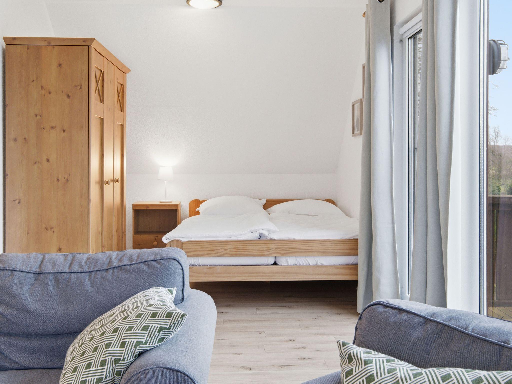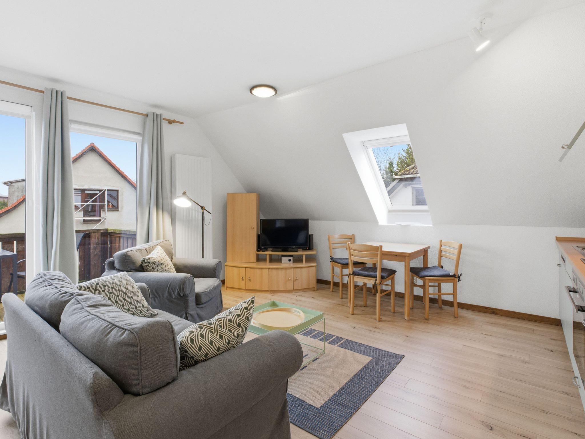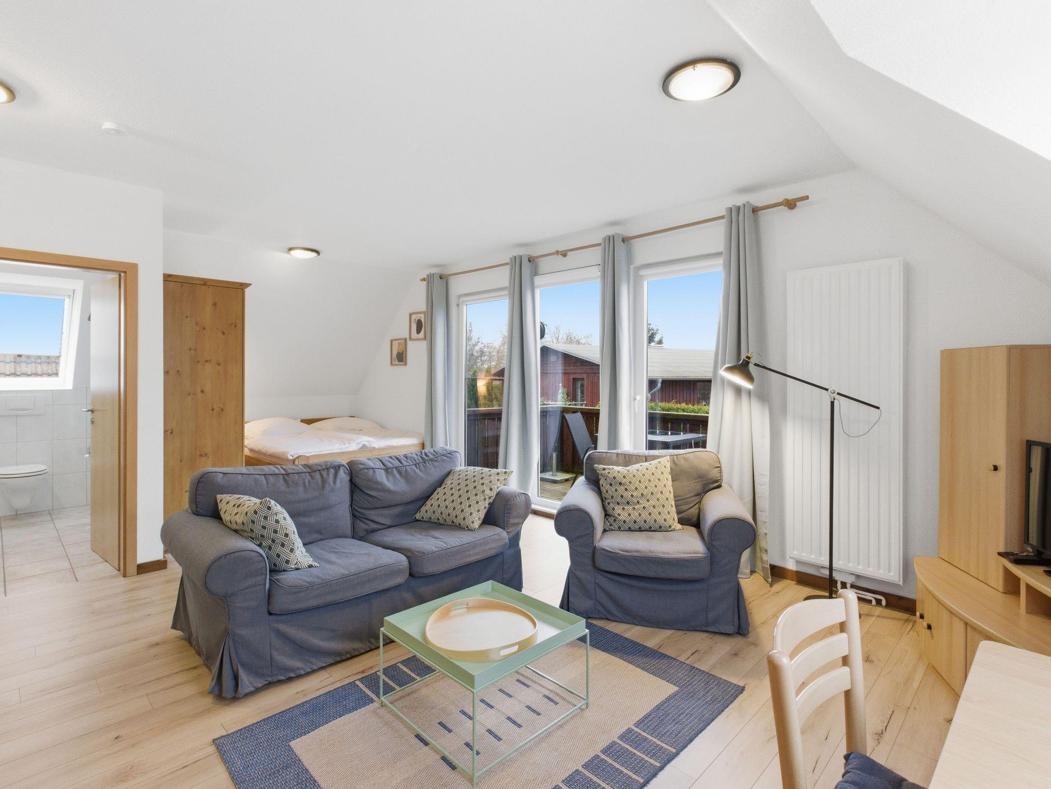 Das Apartment ist ausgestattet mit einer großen Sitzgruppe, Schränken, einem Bad mit Dusche, Küchenzeile, Esstisch und abgeteiltem Doppelbett. Die Ferienwohnung verfügt über einen geräumigern Balkon mit Sitzgruppe und Sonnenschirm. Der Garten mit Grillmöglichkeit kann gerne mitbenutzt werden.