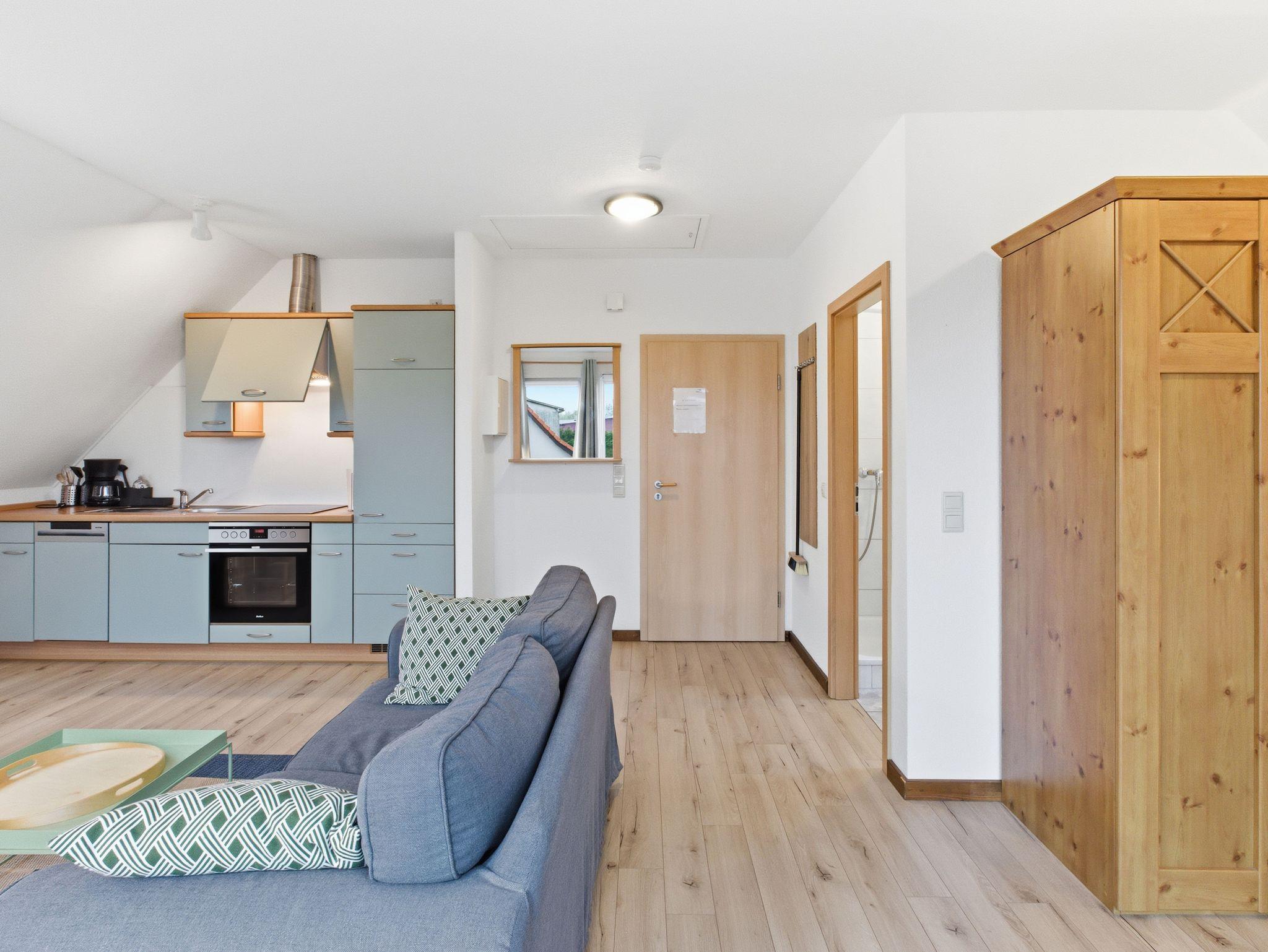 Das Apartment ist ausgestattet mit einer großen Sitzgruppe, Schränken, einem Duschbad, Küchenzeile, Esstisch und abgeteiltem Doppelbett. Die Ferienwohnung verfügt über einen geräumigen Balkon mit Sitzgruppe und Sonnenschirm.