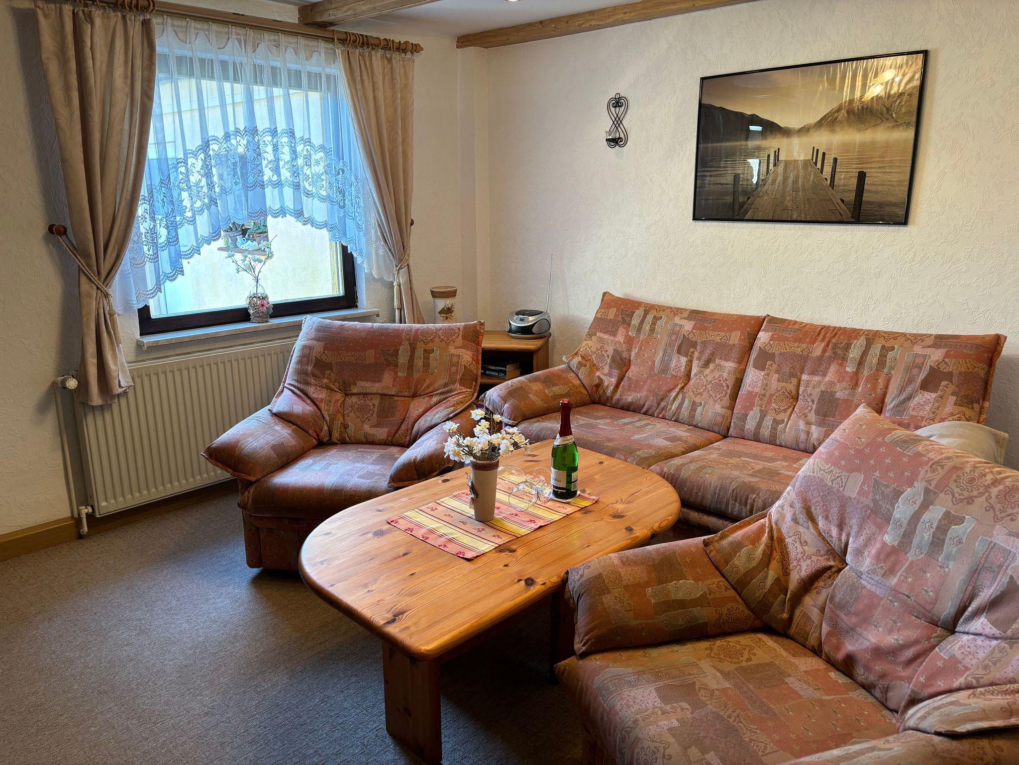 Die 46 qm große Ferienwohnung verfügt über ein Esszimmer mit Esstisch und 4 Stühlen, ein Wohnzimmer mit Sitzecke (die ausziehbare Couch bietet eine Aufbettung für 2 Personen) und TV. Die separate Küche ist ausgestattet mit einen 4-Platten-Herd, Backofen, Wasserkocher, Toaster etc. Das Schlafzimmer bietet neben einem Doppelbett, ein Einzelbett und einen Kleiderschrank. Das angrenzende Bad ist mit Dusche/WC ausgestattet.