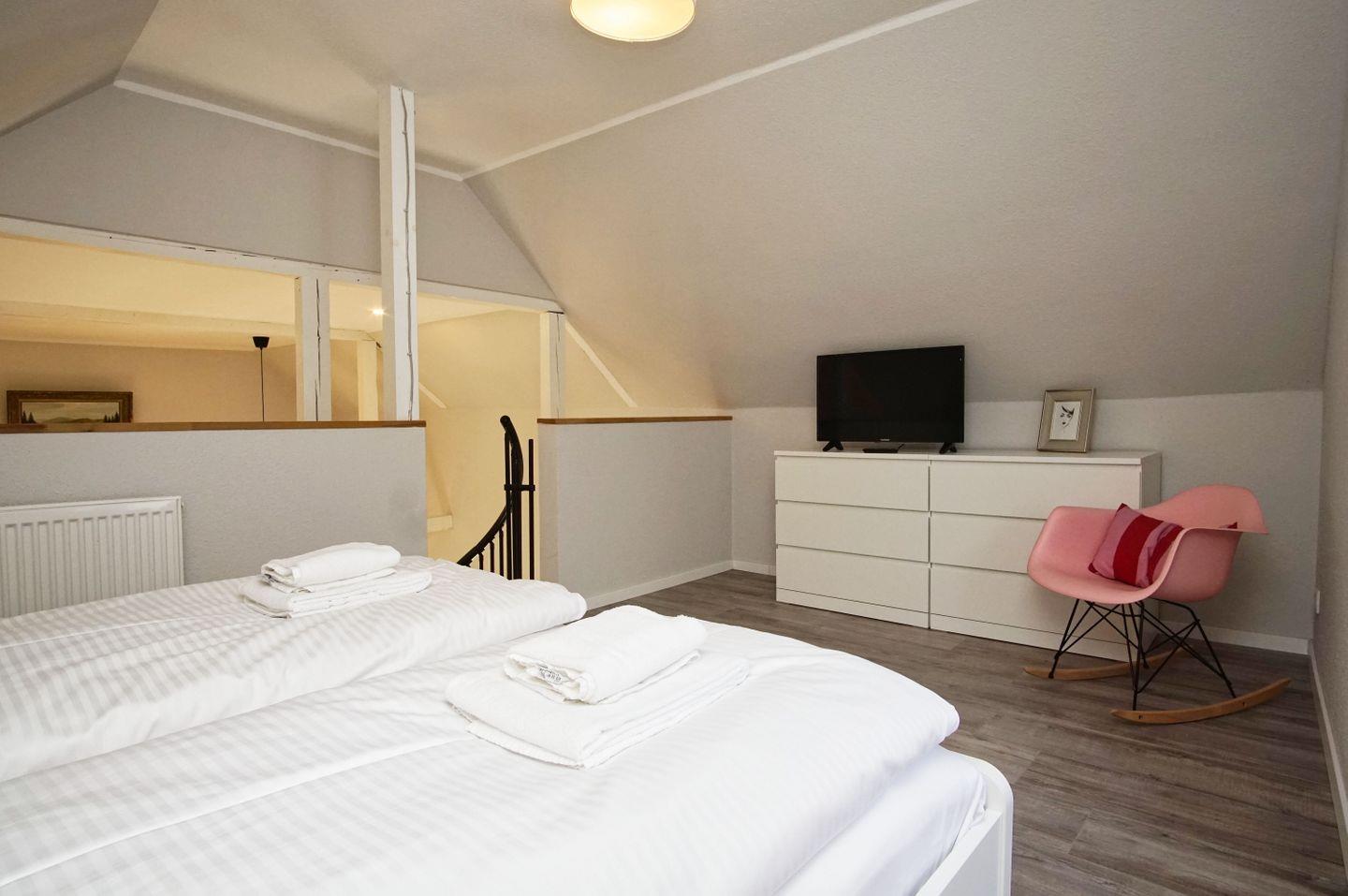 SCHLAFEN// drei separate und offene Schlafzimmer mit Flachbild-TV 2 im OG, welche über eine enge und etwas steile Wendeltreppe zu erreichen sind, eines mit Doppelbett und eines mit einem Tandembett, Schlafzimmer im EG mit Doppelbett ++