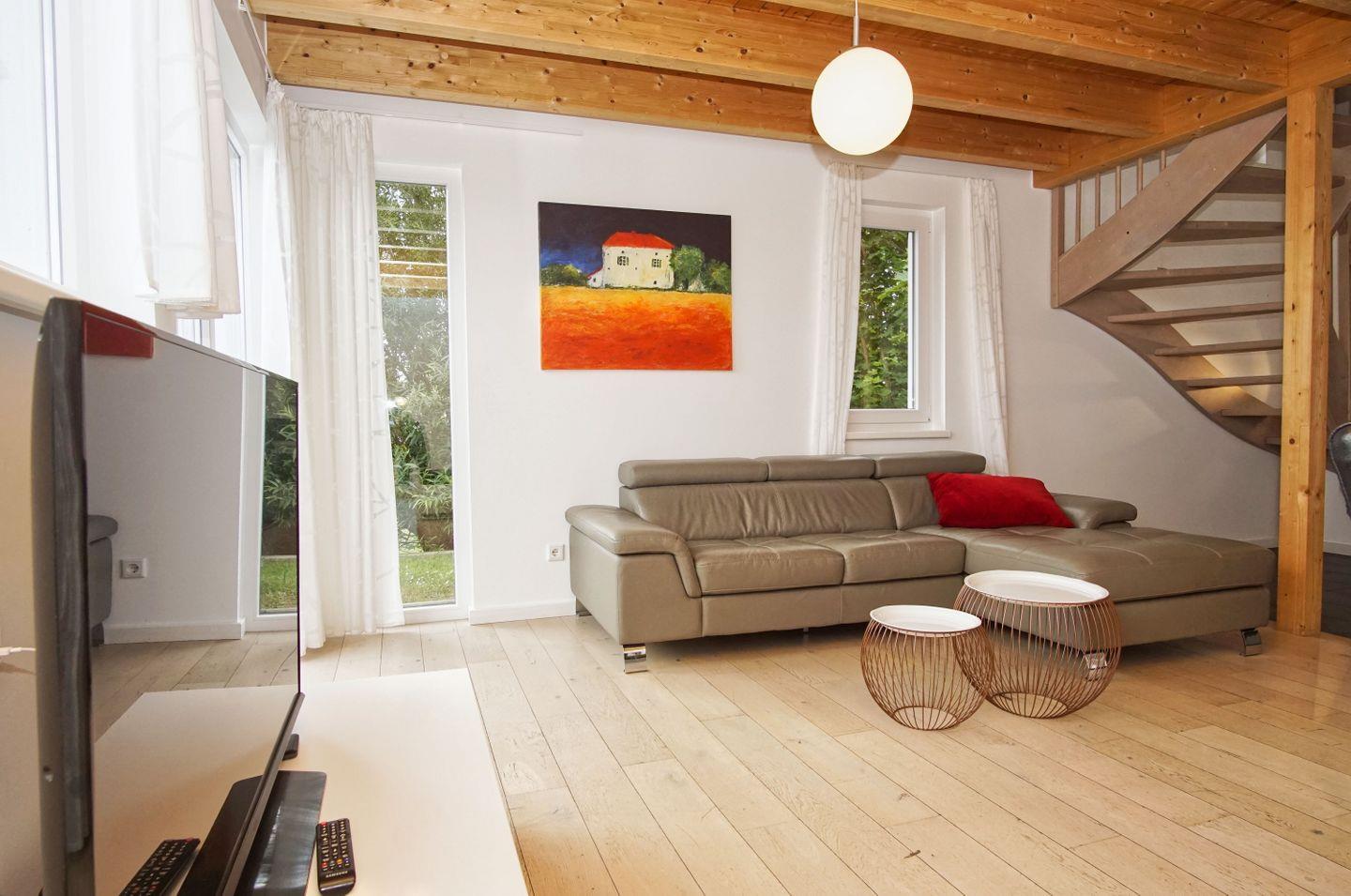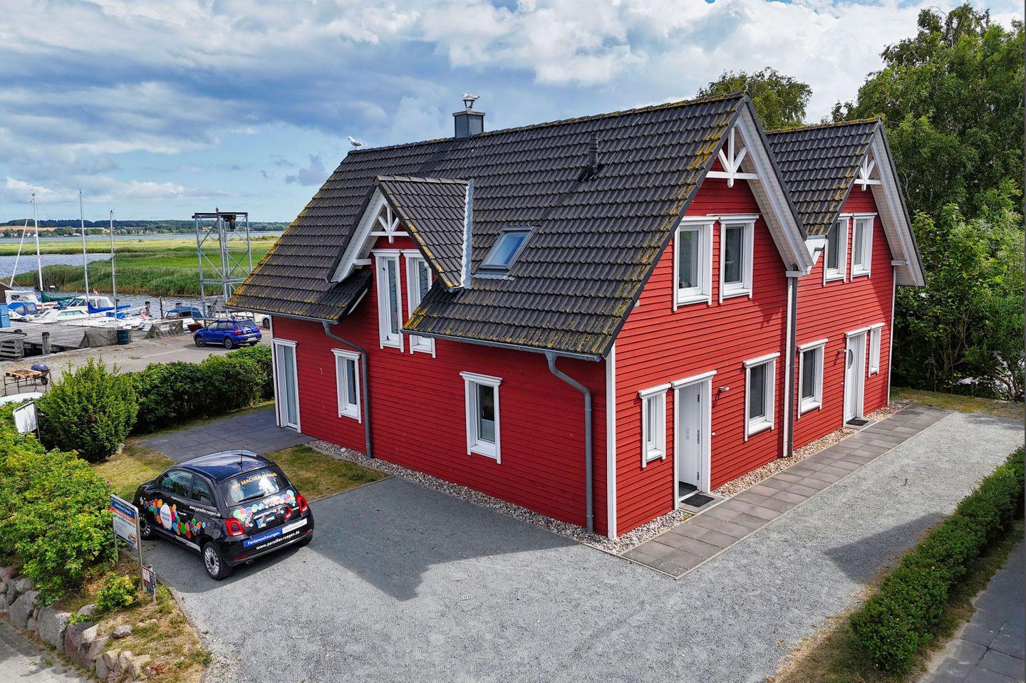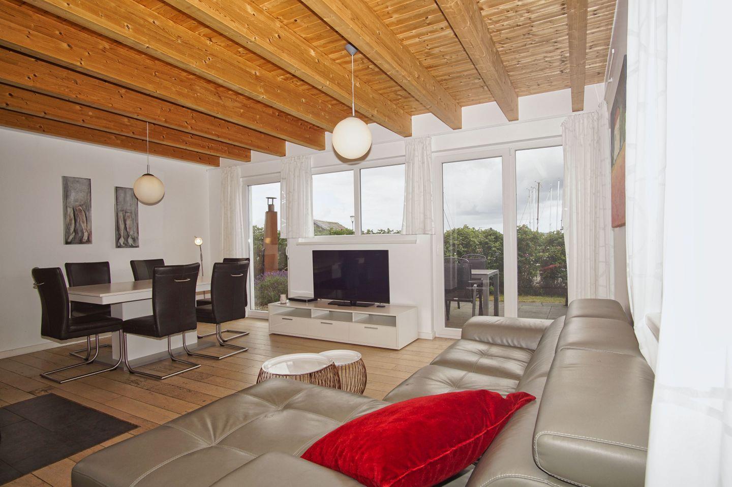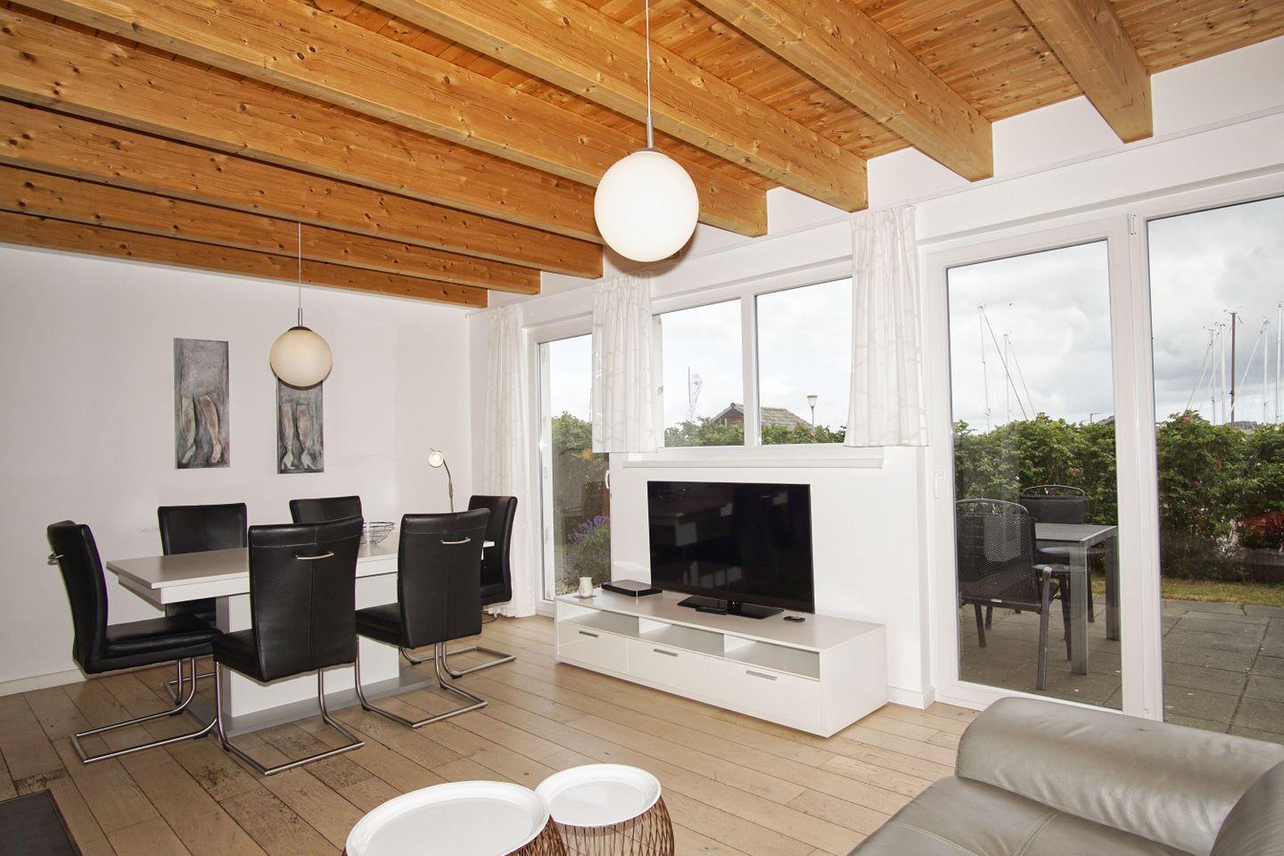 Die Haushälften sind top modern eingerichtet und komfortabel ausgestattet. Flachbild-TV im Wohnzimmer und in jedem Schlafzimmer, voll ausgestattete Küche, 2 Badezimmer, hauseigene Sauna, Terrasse mit Blick auf den Hafen und die Ostsee und vieles mehr versprechen einen traumhaften Urlaub auf Rügen.