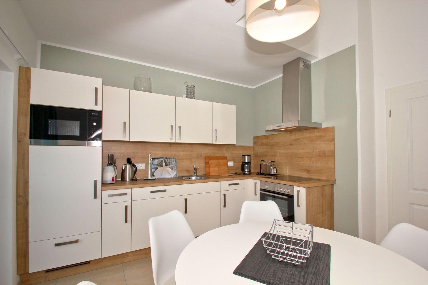 KÜCHE // Küchenzeile, 4-Platten Ceranherd, Spülmaschine, Kühlschrank mit Gefrierfach, Backofen, Mikrowelle, Toaster, Wasserkocher, Kaffeemaschine, reichlich Besteck, Geschirr und Küchenutensilien ++