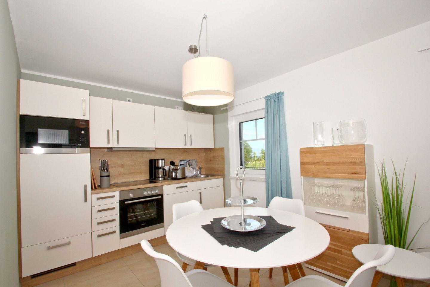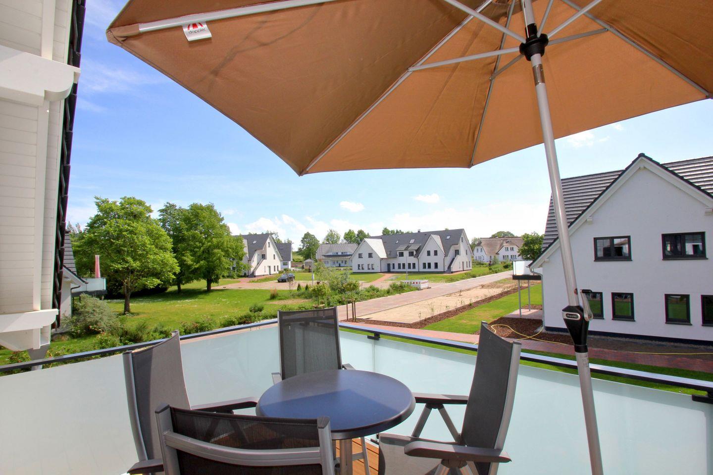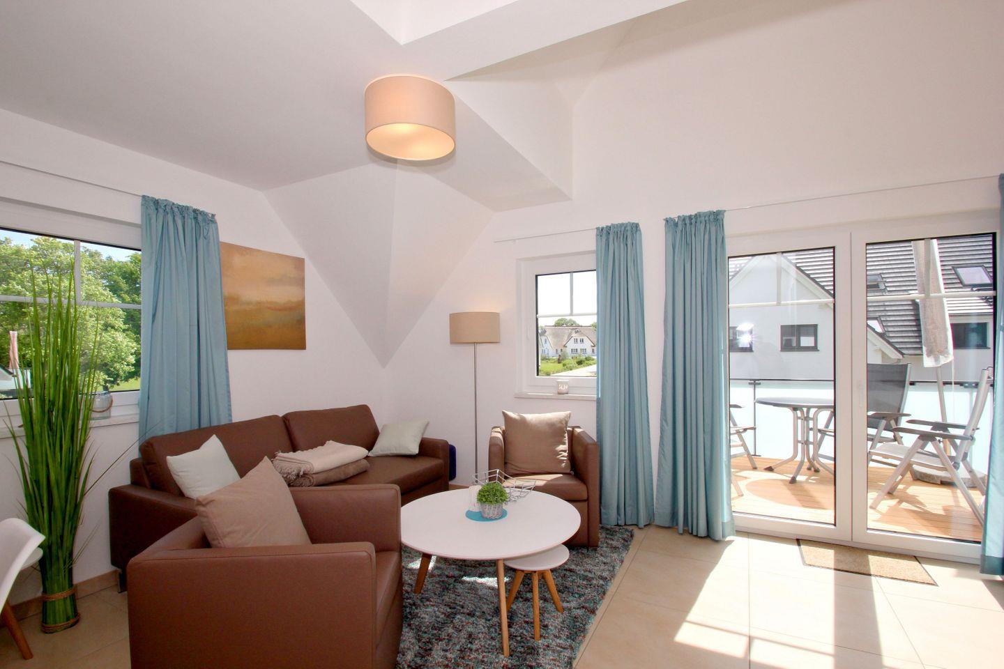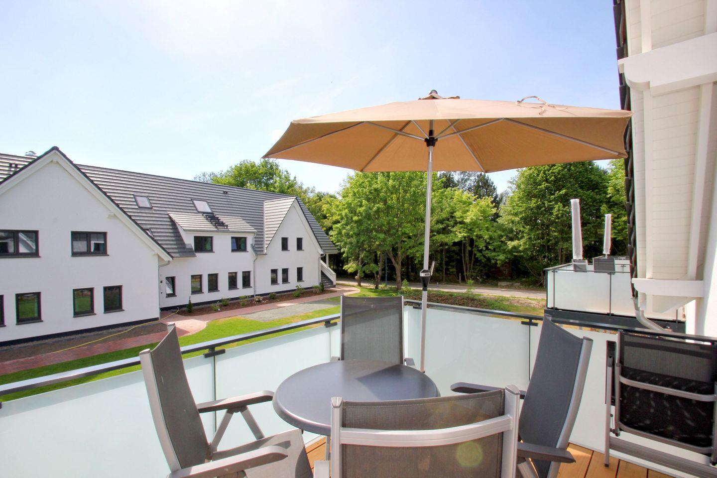 Strandnahe, moderne Ferienwohnung in Lobbe mit Balkon und kostenfreiem Zugang zu Schwimmbad und Sauna.
