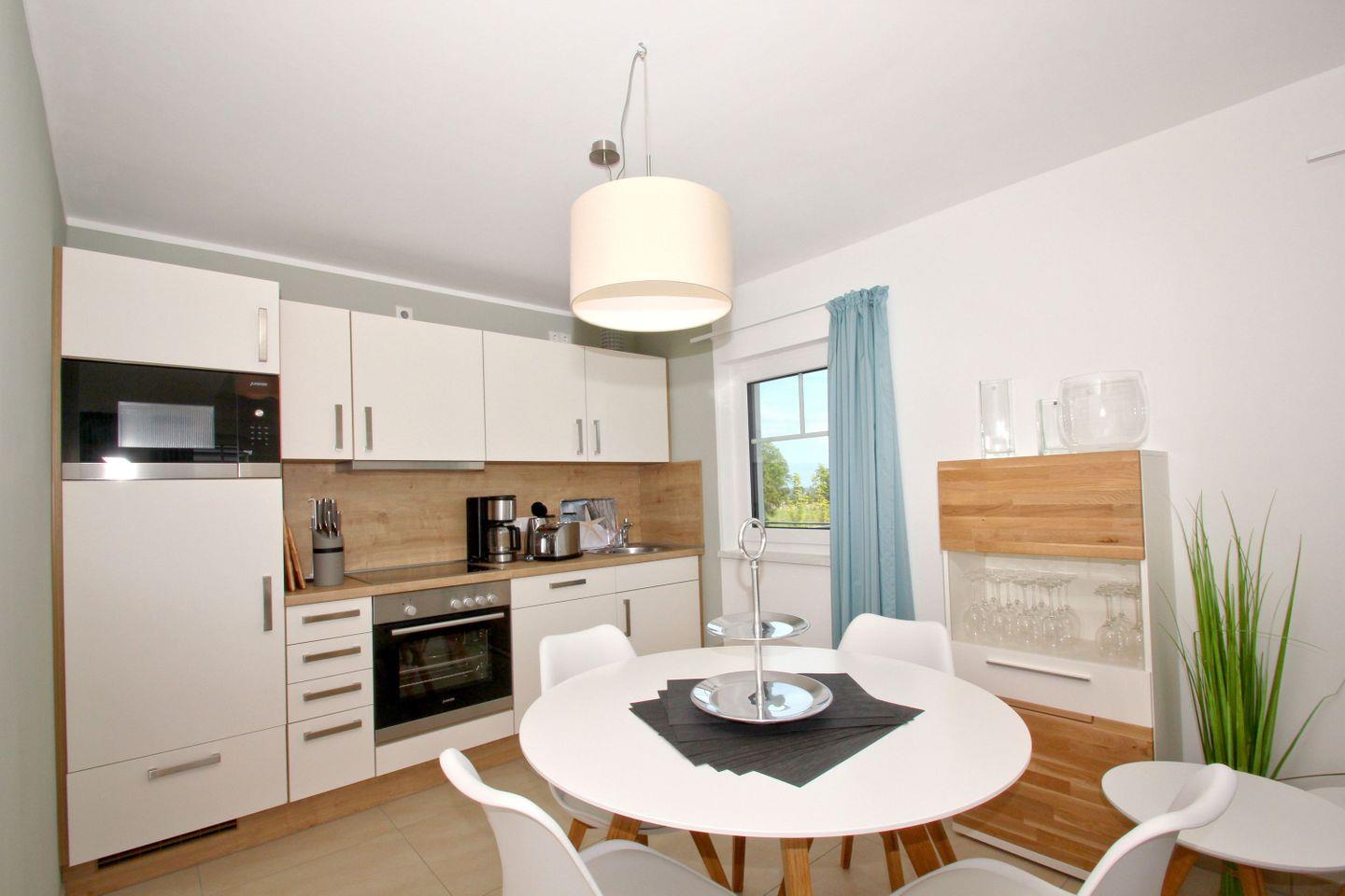 KÜCHE // Küchenzeile, 4-Platten Ceranherd, Spülmaschine, Kühlschrank mit Gefrierfach, Backofen, Mikrowelle, Toaster, Wasserkocher, Kaffeemaschine, reichlich Besteck, Geschirr und Küchenutensilien ++