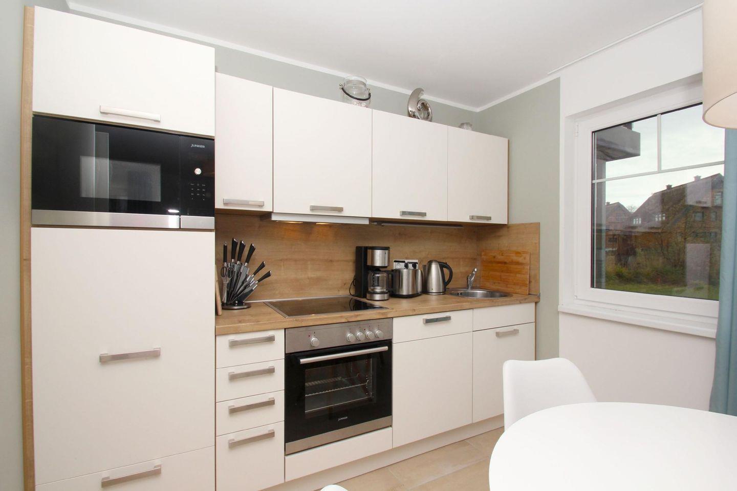 KÜCHE // Küchenzeile, 4-Platten Ceranherd, Spülmaschine, Kühlschrank mit Gefrierfach, Backofen, Mikrowelle, Toaster, Wasserkocher, Kaffeemaschine, reichlich Besteck, Geschirr und Küchenutensilien ++