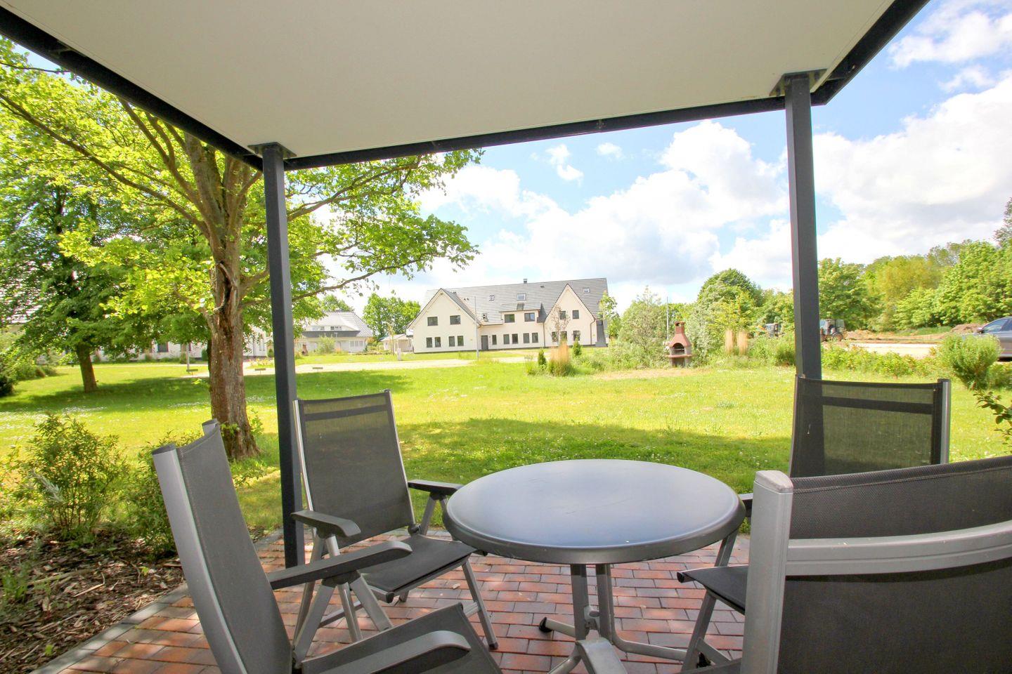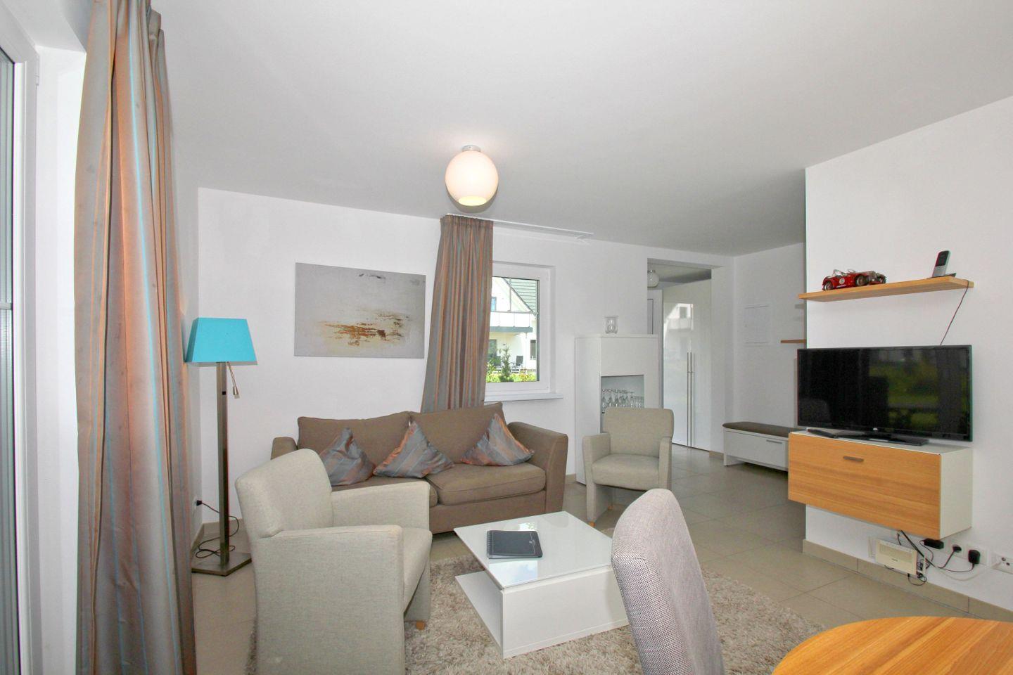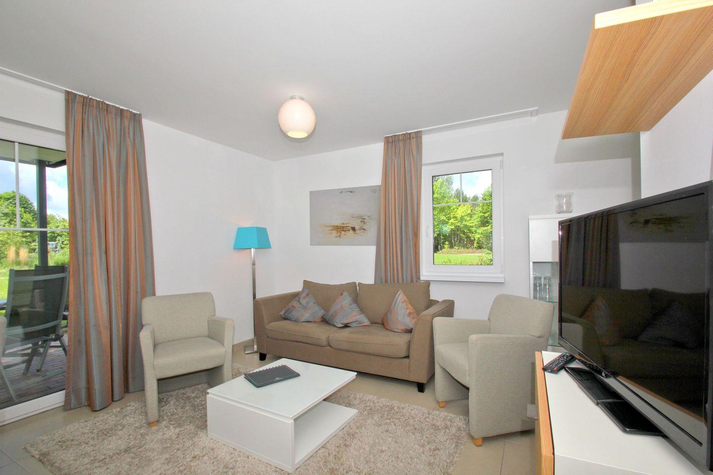 Modern eingerichtete Ferienwohnung mit Terrasse im Strandresort Rex Rugia, nah zum Strand und mit kostenfreiem Zugang zum Erlebnisbad und Sauna.
