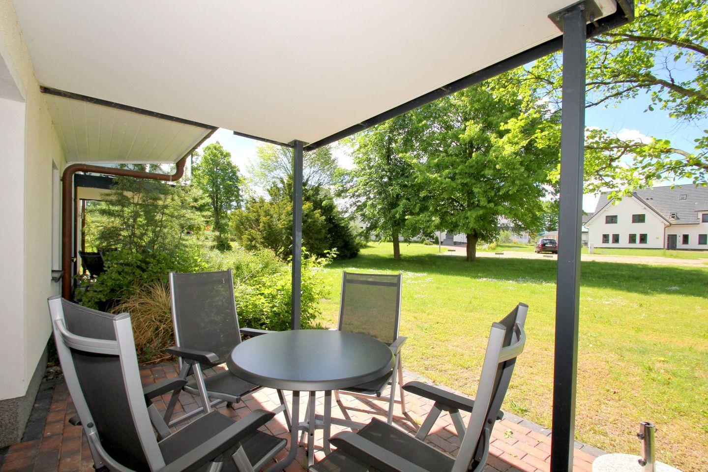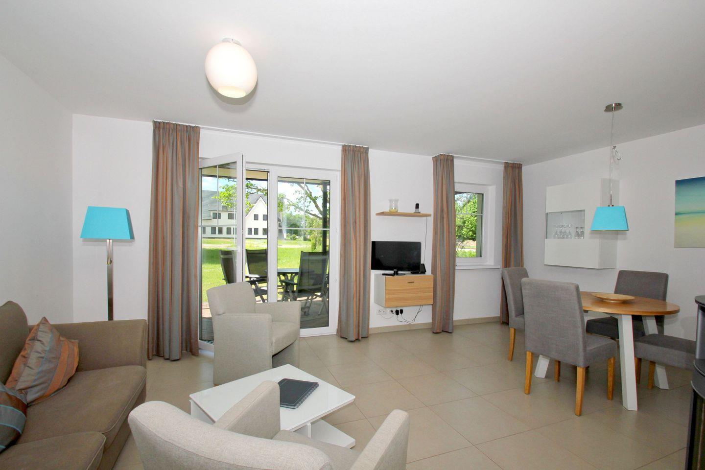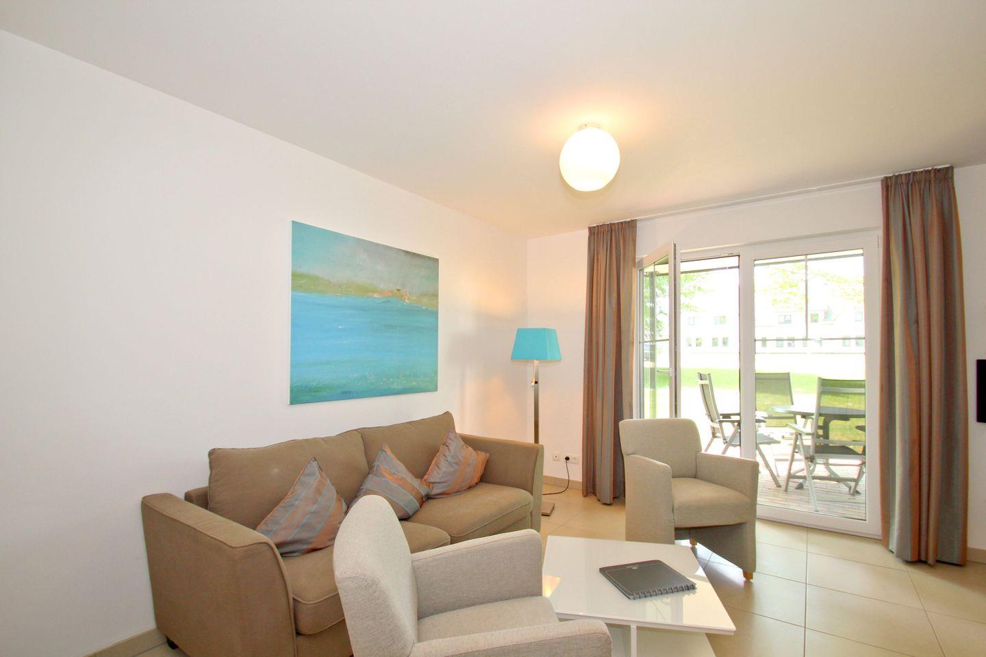Strandnahes Ferienapartment mit Terrasse und kostenfreiem Zugang zu Schwimmbad und Sauna im Rex Rugia Resort.