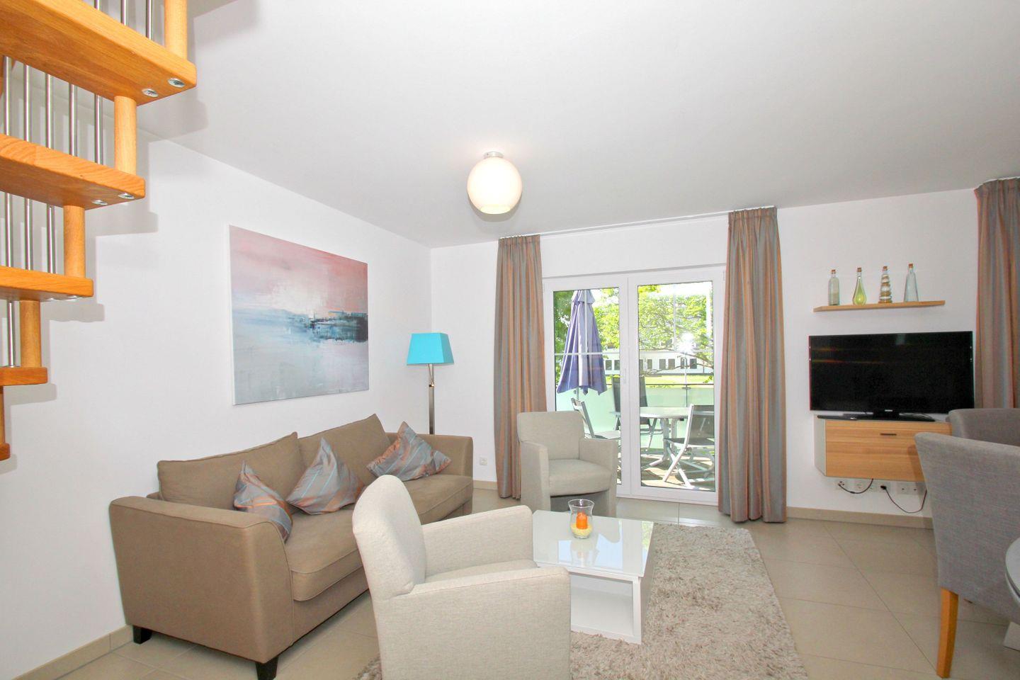 Charmante Ferienwohnung in Lobbe mit Balkon, Strandnähe und kostenfreiem Zugang zu Schwimmbad und Sauna.