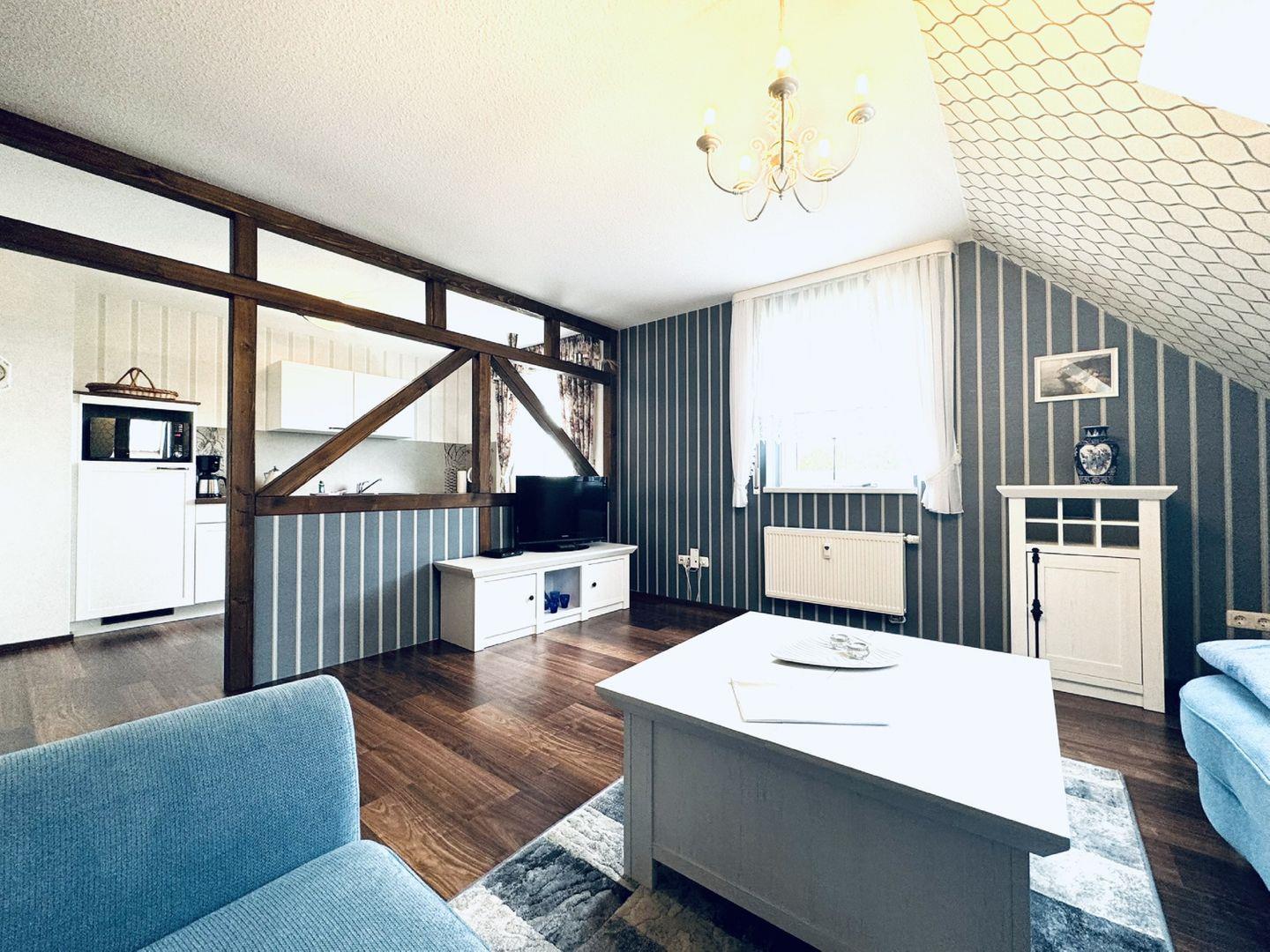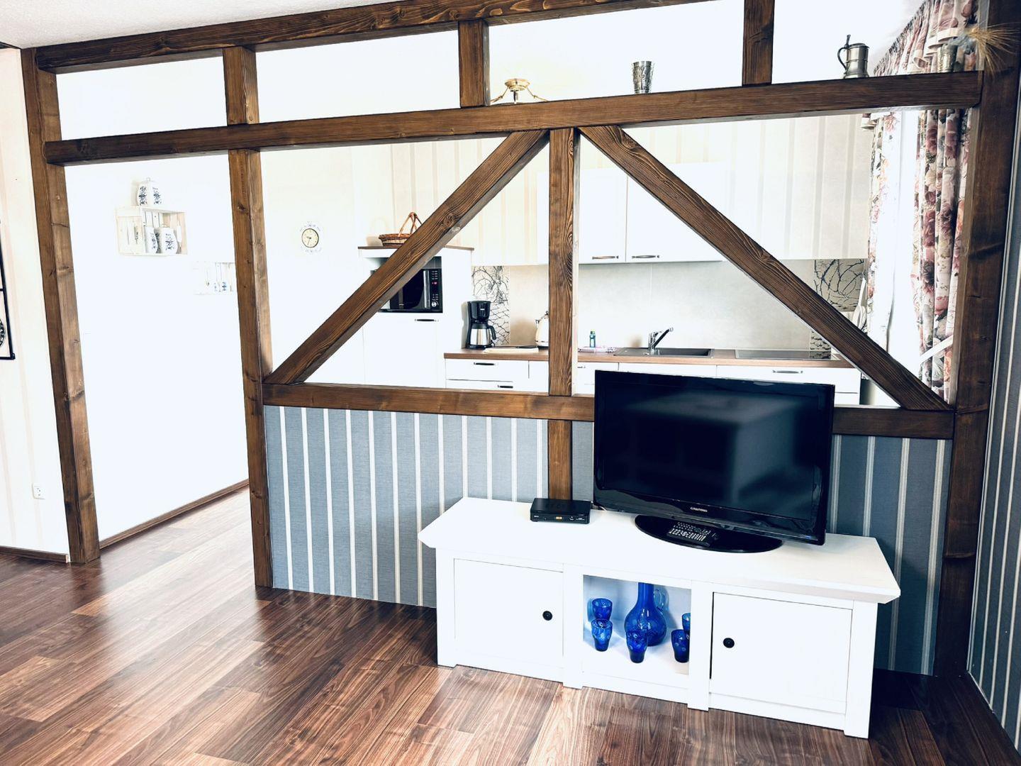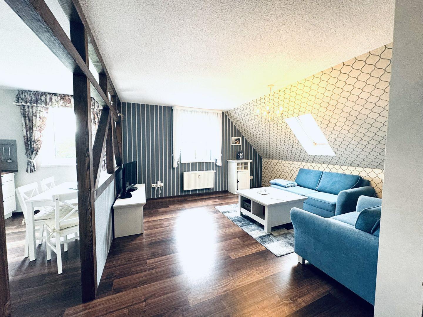 WOHNEN // Wohnraum mit Essbereich, bequeme Couch, Flachbild-TV, Radio ++