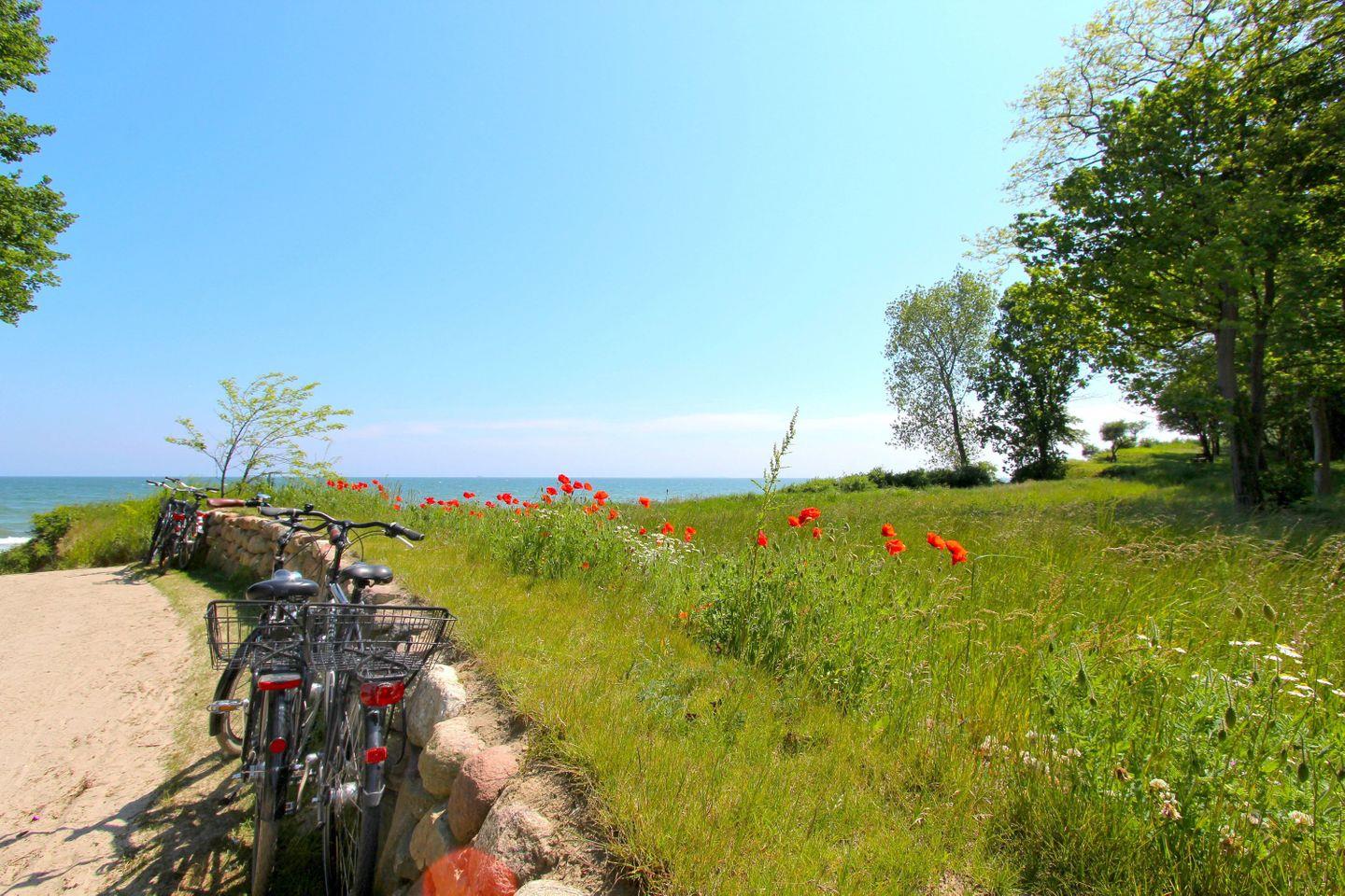 Der naturbelassene Sandstrand vor dem Resort erstreckt sich etwa 10 Kilometer von Göhren bis nach Thiessow. Die Anlage liegt ungefähr in der Mitte dieses Küstenabschnitts. Ein schmaler, bewaldeter Dünenstreifen trennt das Resort vom feinsandigen Badestrand, der über einen breiten Fußweg bequem erreichbar ist.