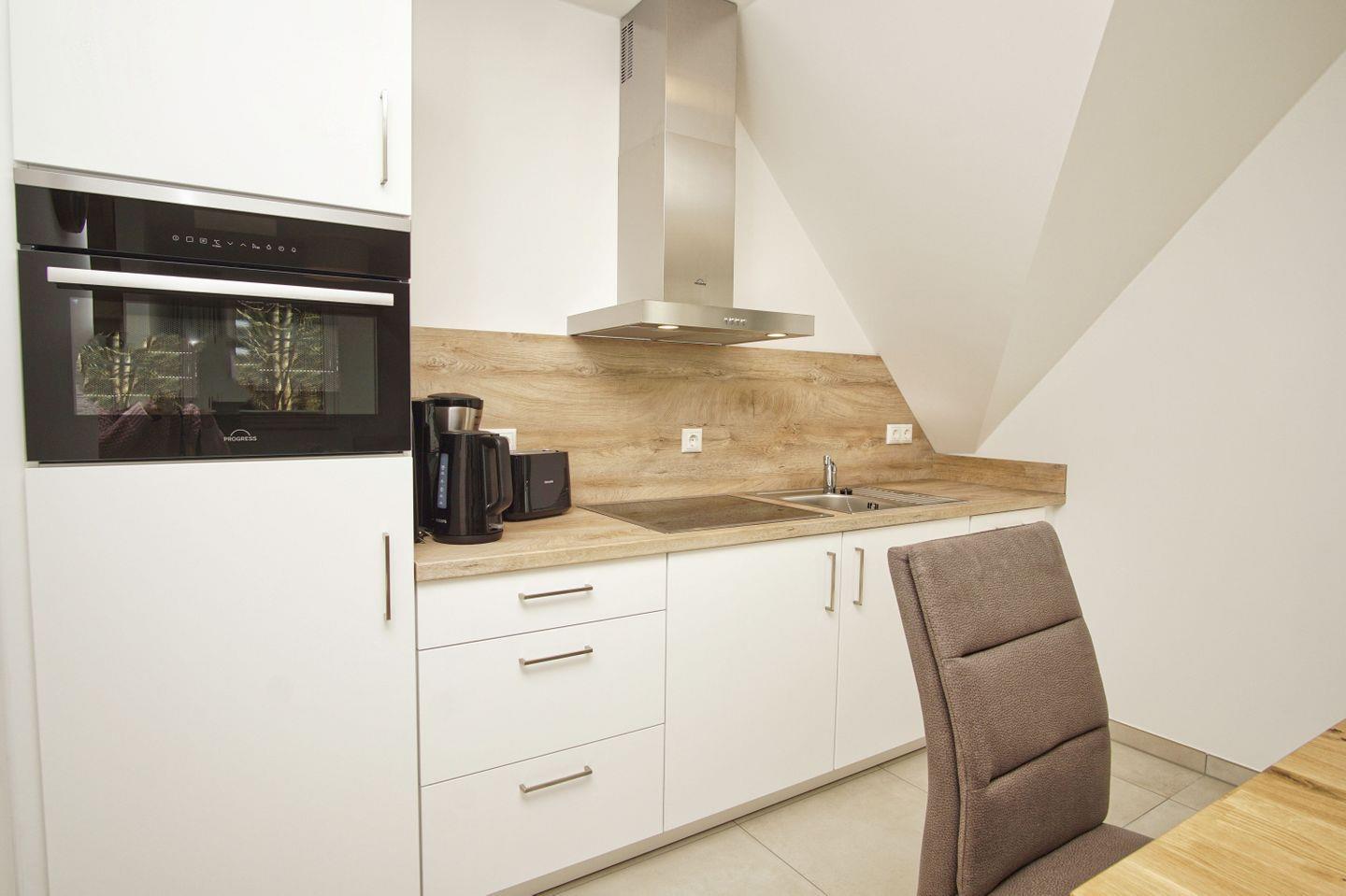 KÜCHE // Küchenzeile, 4-Platten Ceranfeld, Spülmaschine, Kühlschrank mit Gefrierfach, Backofen, Toaster, Wasserkocher, Kaffeemaschine, reichlich Besteck, Geschirr und Küchenutensilien ++