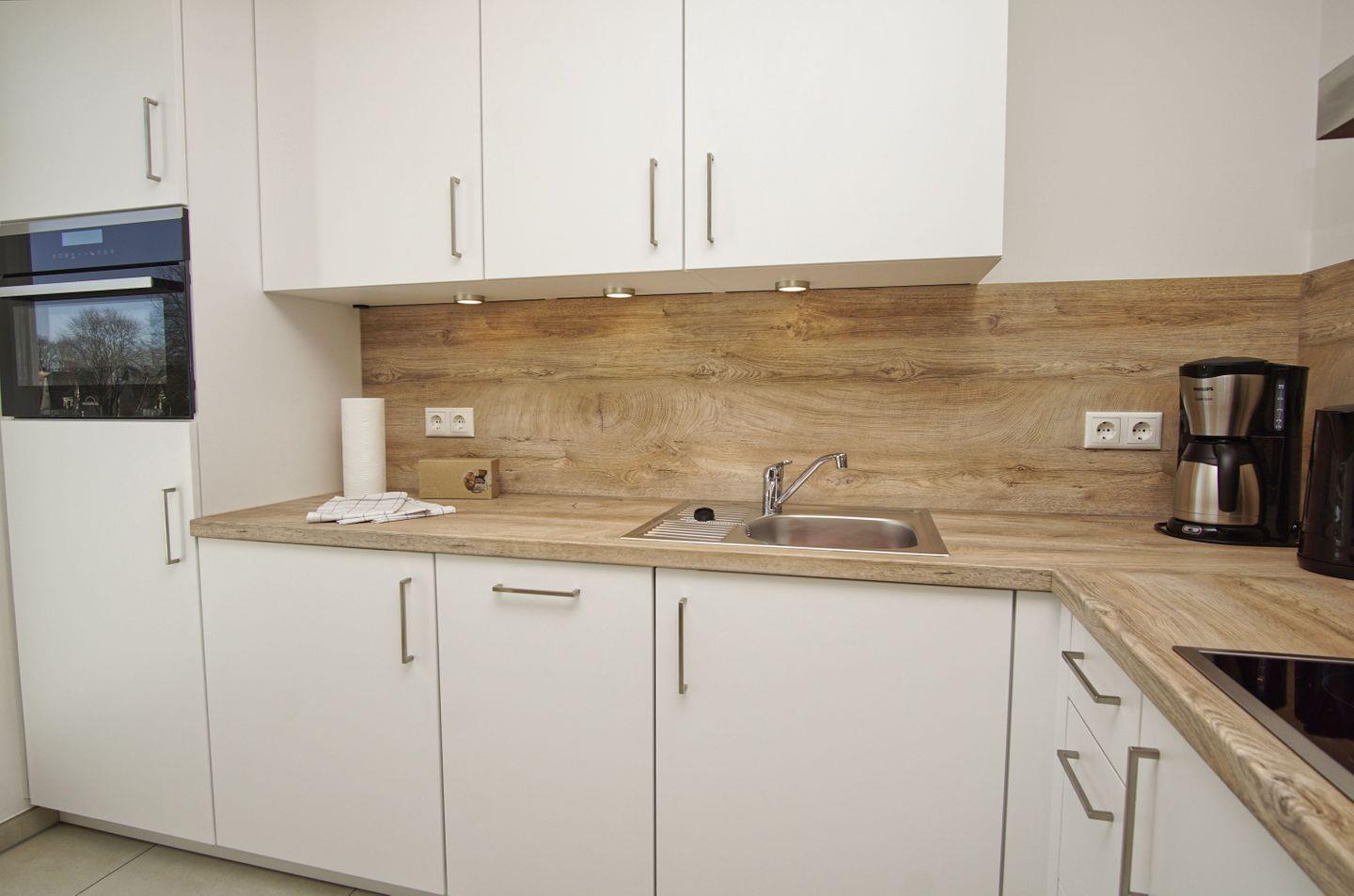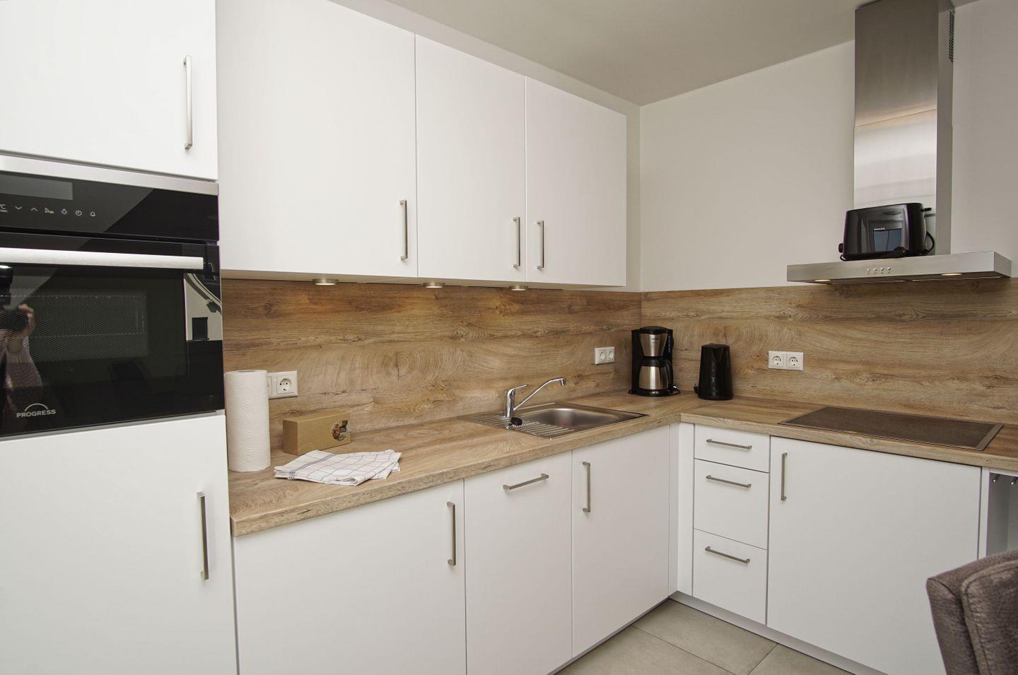 KÜCHE // Küchenzeile, 4-Platten Ceranfeld, Spülmaschine, Kühlschrank mit Gefrierfach, Backofen, Toaster, Wasserkocher, Kaffeemaschine, reichlich Besteck, Geschirr und Küchenutensilien ++