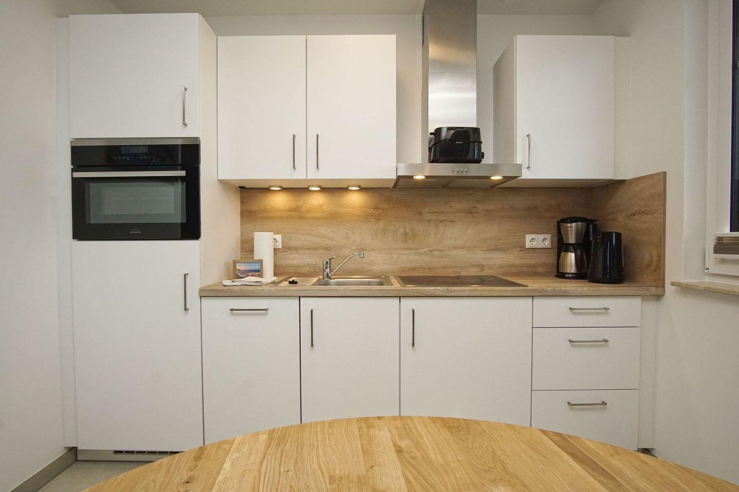 KÜCHE // Küchenzeile, 4-Platten Ceranfeld, Spülmaschine, Kühlschrank mit Gefrierfach, Backofen, Toaster, Wasserkocher, Kaffeemaschine, reichlich Besteck, Geschirr und Küchenutensilien ++