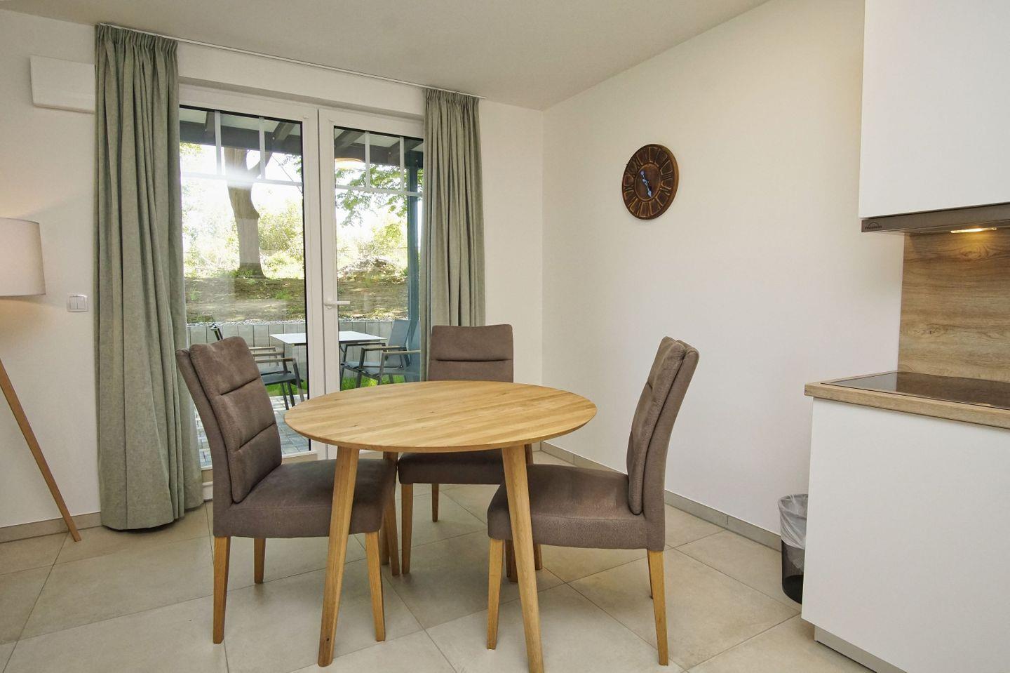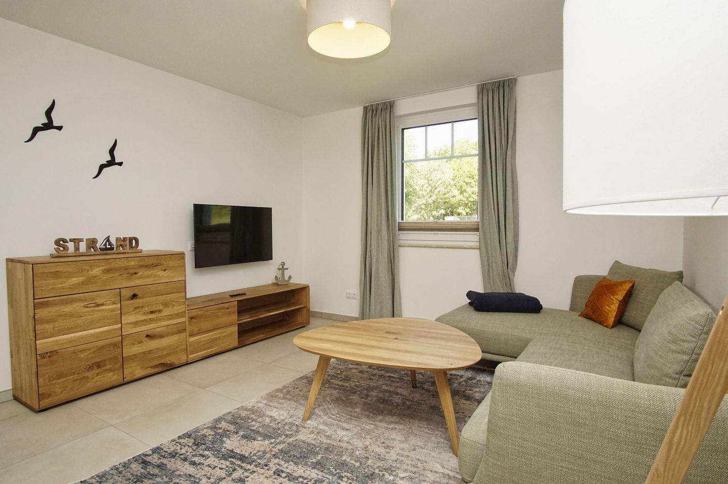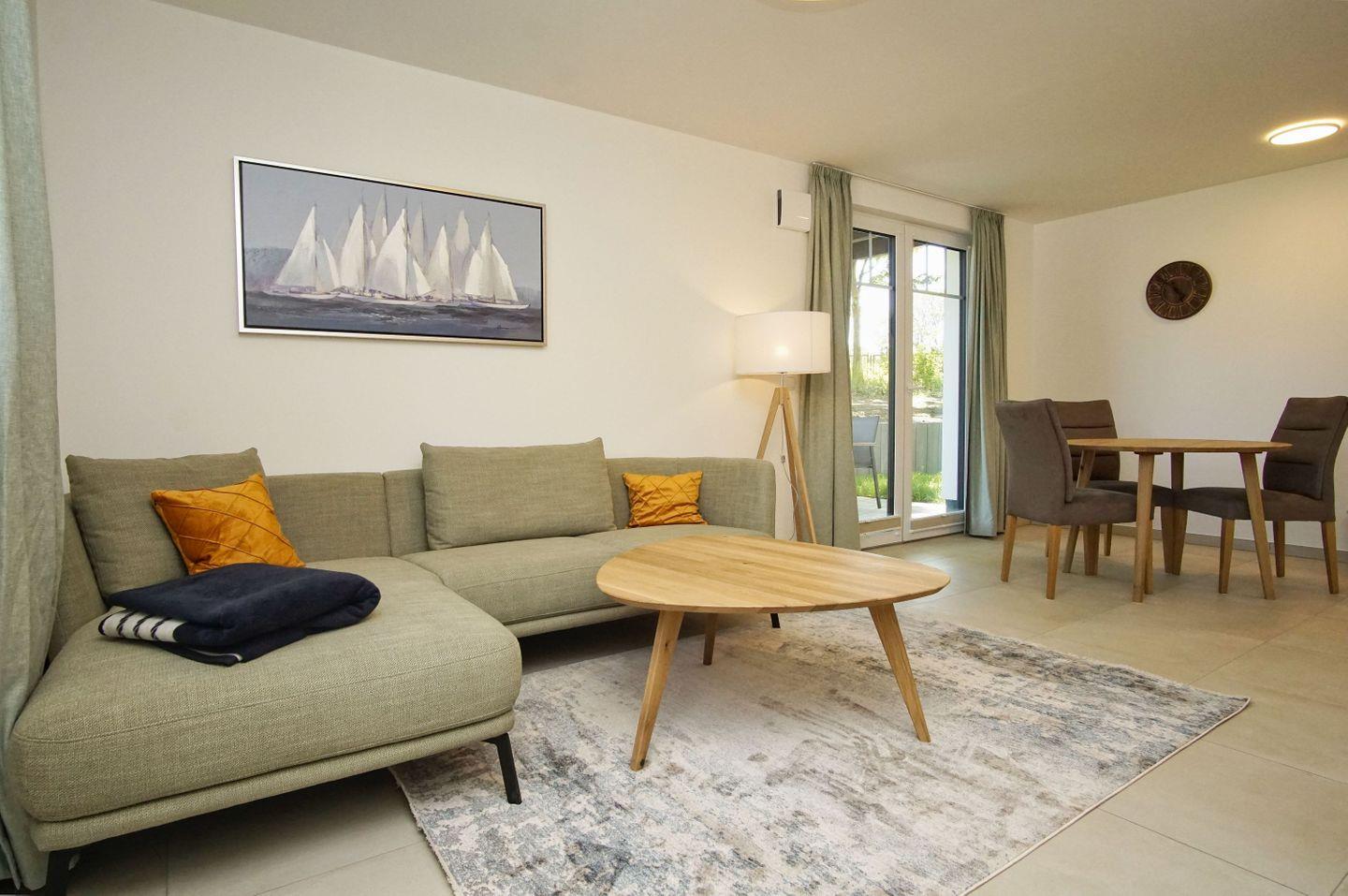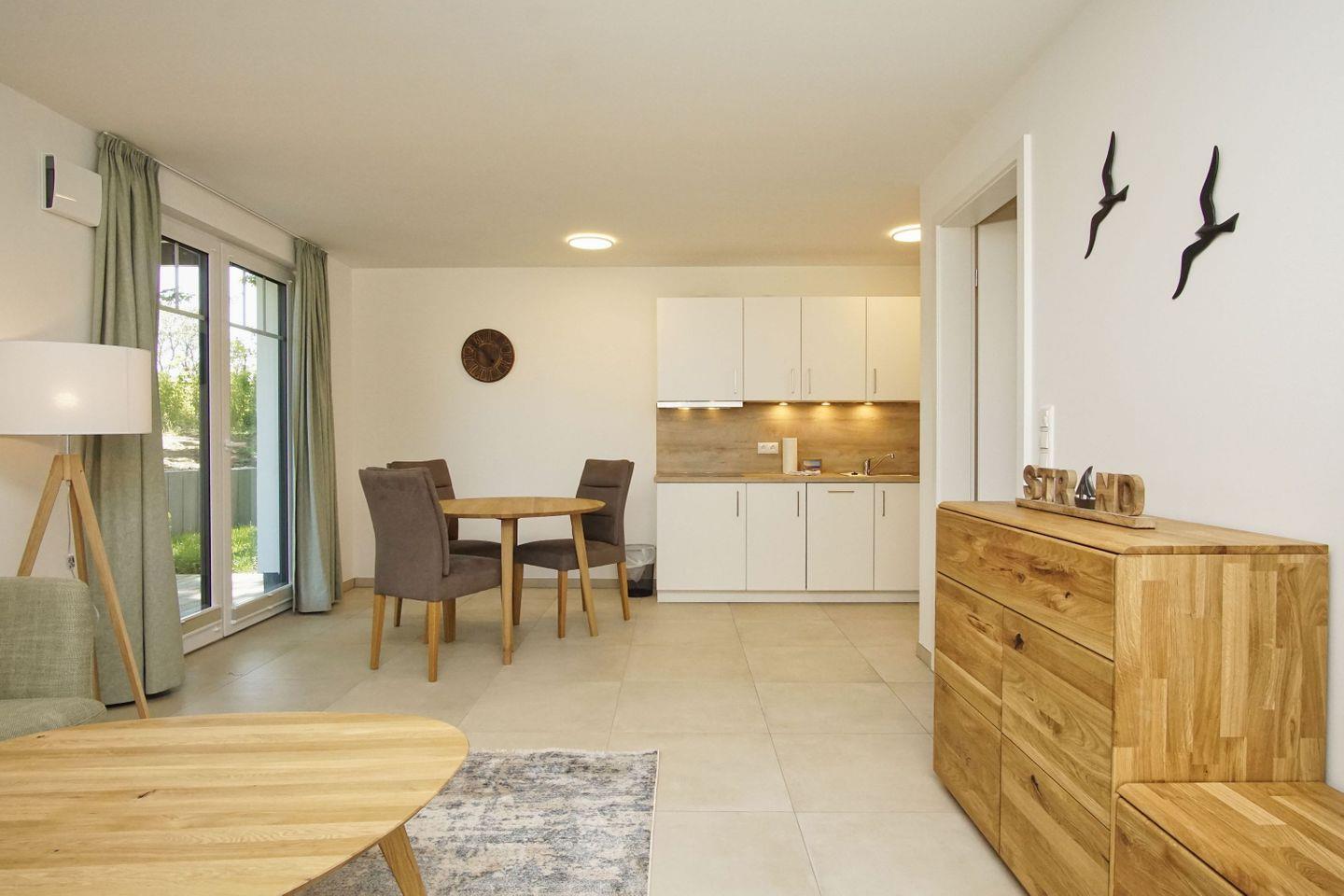 Strandnahe Ferienwohnung mit Terrasse im charmanten Strandresort Rex Rugia auf Rügen, ideal für erholsame Tage am Meer.