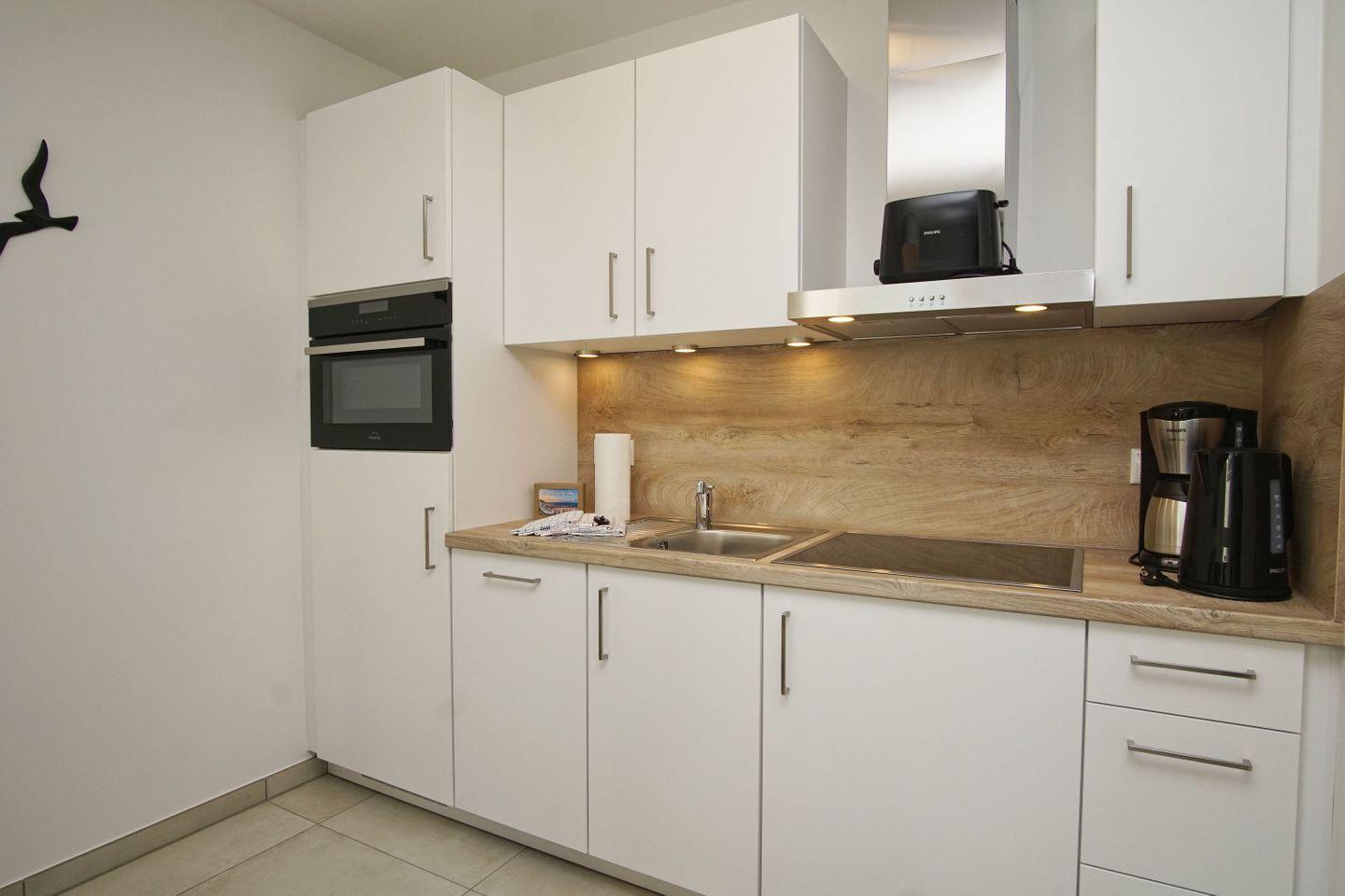 KÜCHE // Küchenzeile, 4-Platten Ceranfeld, Spülmaschine, Kühlschrank mit Gefrierfach, Backofen, Toaster, Wasserkocher, Kaffeemaschine, reichlich Besteck, Geschirr und Küchenutensilien ++