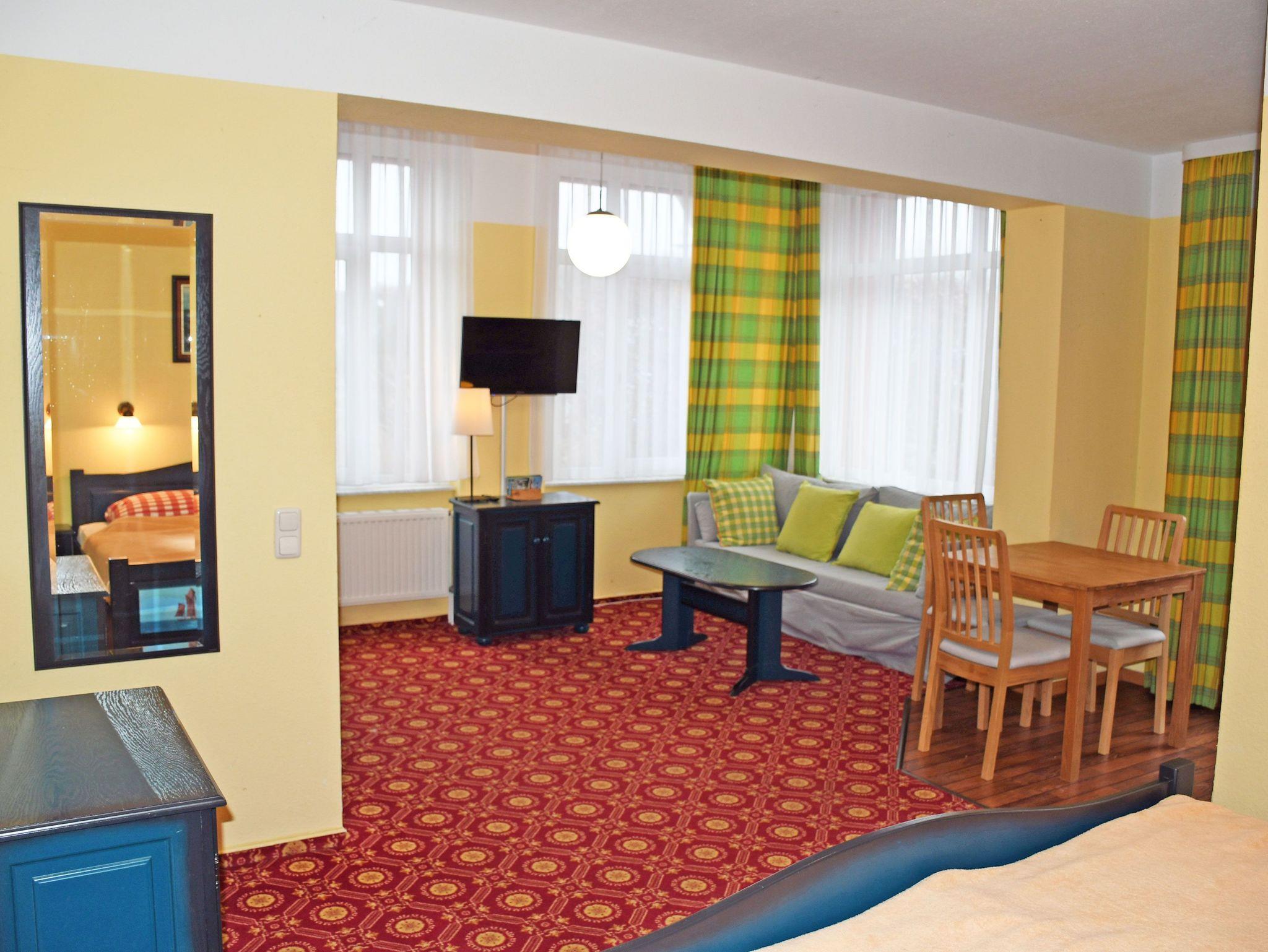Im kombinierten Wohn-/Schlafraum befinden sich ein bequemes Doppelbett mit Nachttischen und Leselampen sowie ein Kleiderschrank, eine Schlafcouch mit Tisch und ein TV-Gerät. Hier steht auch ein Esstisch mit Stühlen.