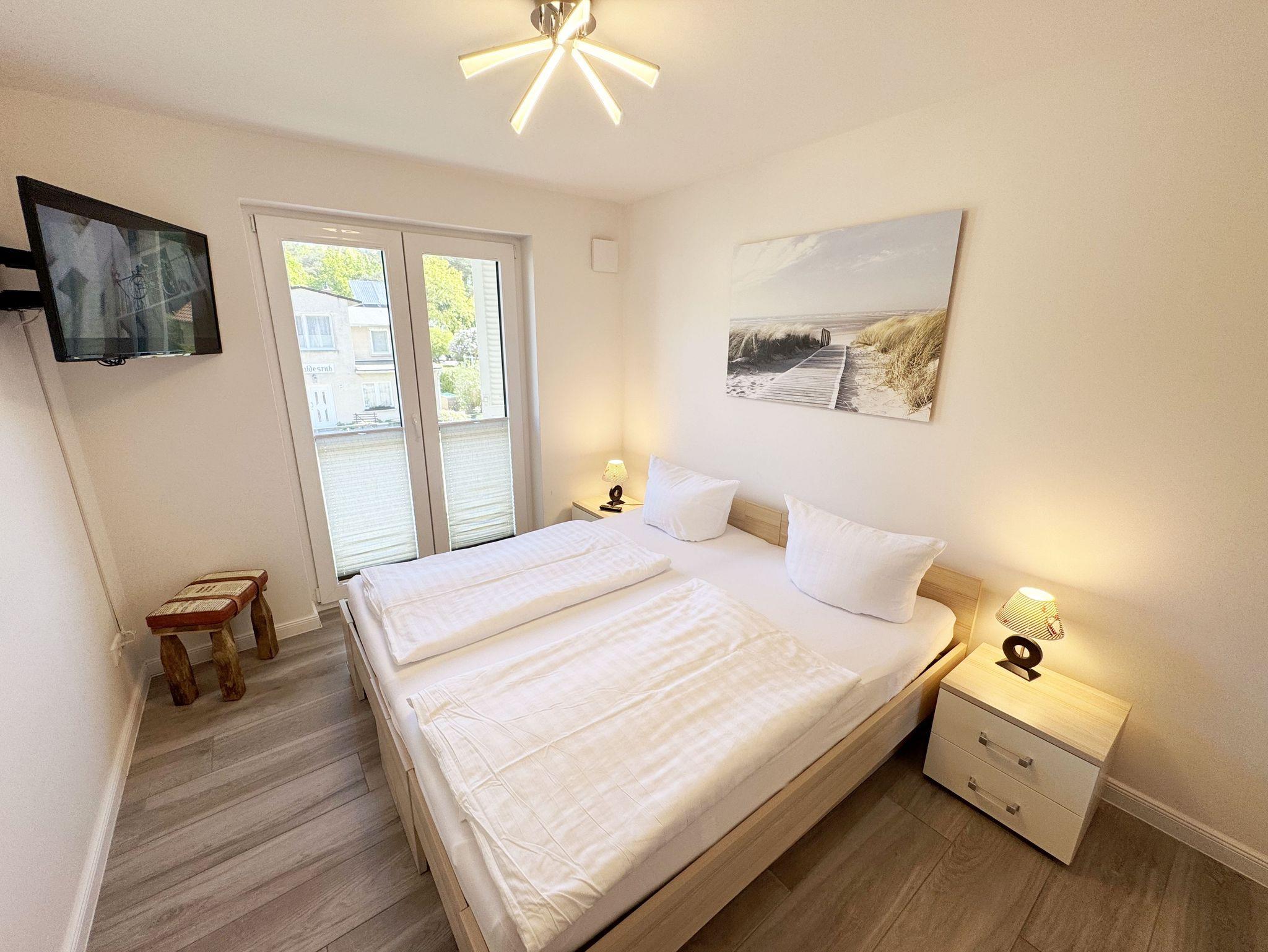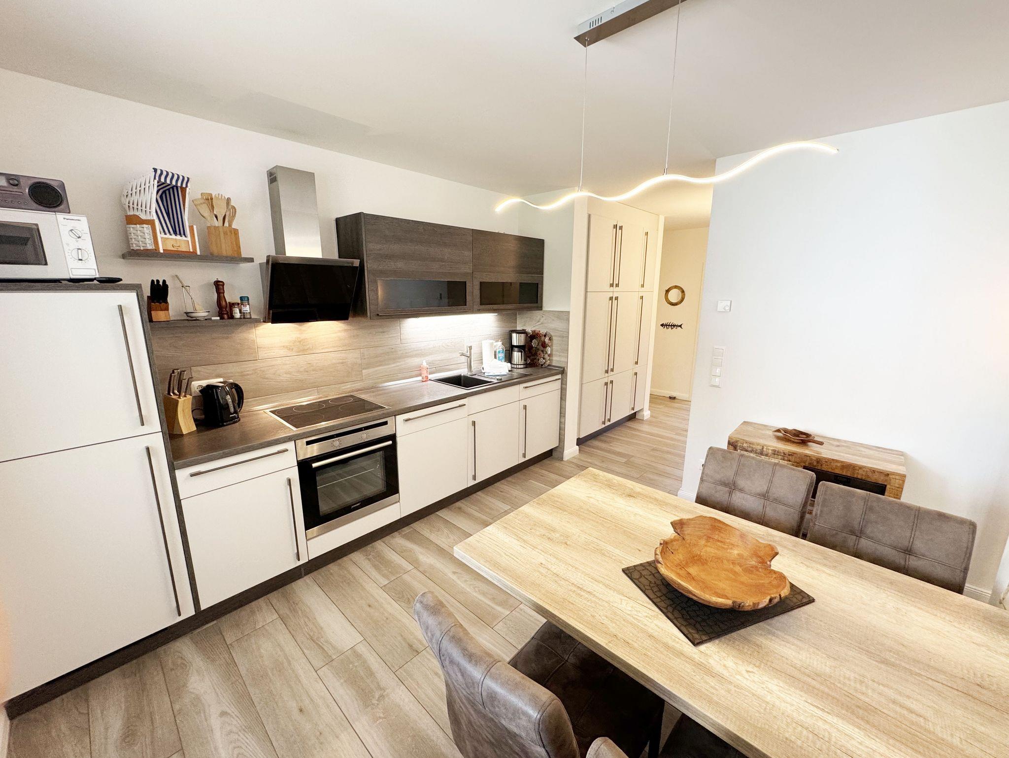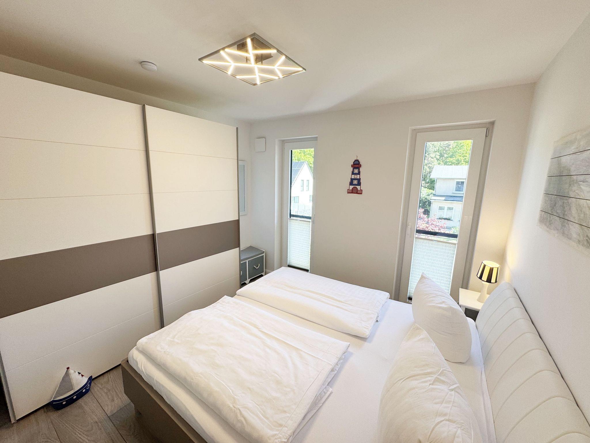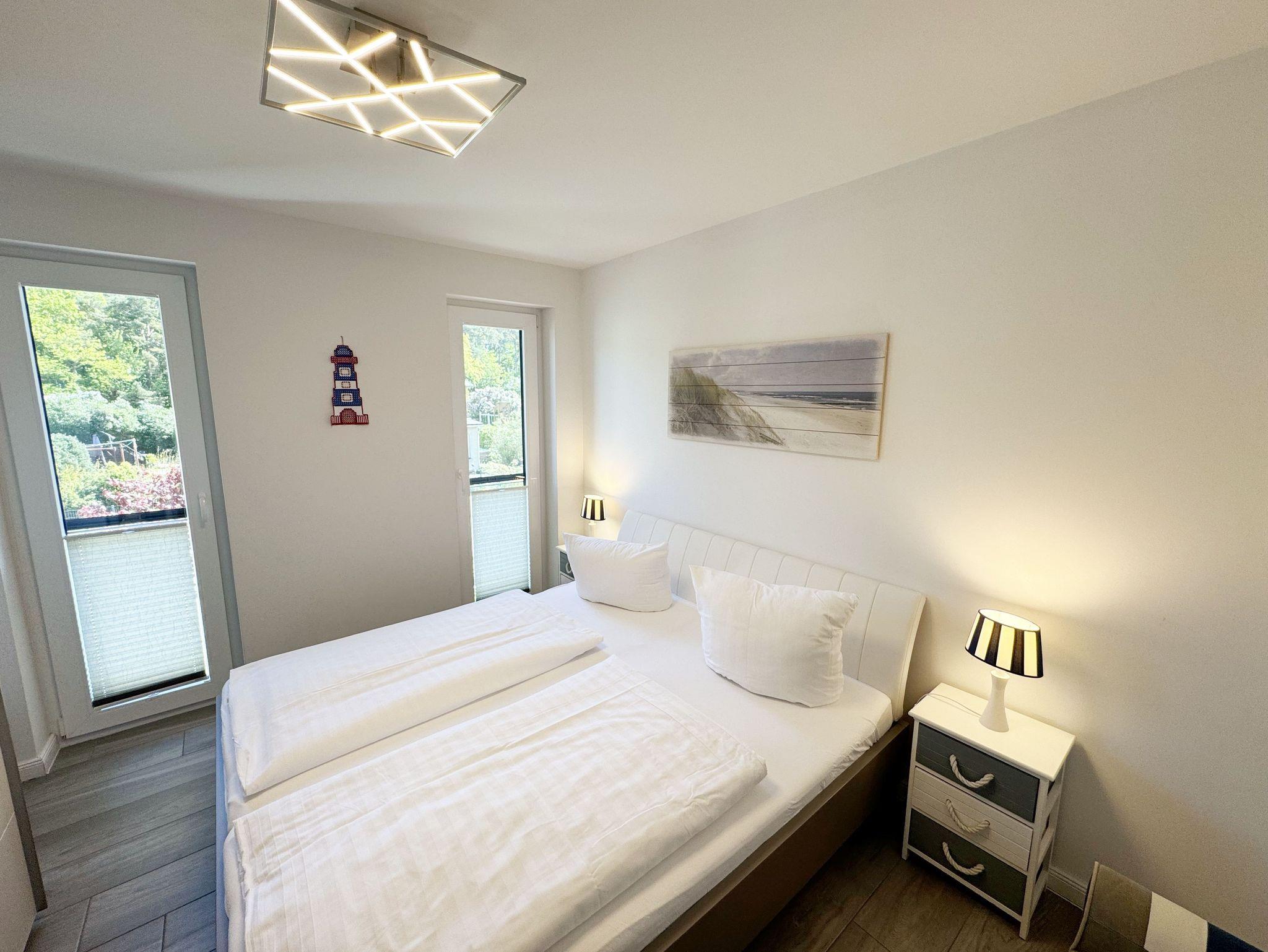 Das komfortable, stilvoll und modern eingerichtete 3-Zimmer-Appartment ?Sturmböe? in der 1. Etage besticht durch seine unvergleichliche Strandnähe und das nordische Flair. Auf ca. 70 m² ist diese Allergiker gerechte Nichtraucherwohnung mit viel Liebe zum Detail eingerichtet und für max. 2 bis 4 Erwachsene + 1 Kleinkind bis Jahre im Kinderreisebett optimal nutzbar. Die Räumlichkeiten sind mit einer Fußbodenheizung, Fensterläden und Insektenschutzgittern versehen. Die hochwertig eingerichtete Einbauküche befindet sich im kombinierten Koch-Ess-/Wohnbereich einschließlich Kühlschrank und Gefrierfach, Geschirrspüler, Induktionsherd mit Backofen, Kaffeemaschine, Tassimo Padmaschine, Mikrowelle, Wasserkocher, Eierkocher, Toaster, diverser Küchenutensilien sowie einem Esstisch. Der offene Wohnbereich verfügt über eine moderne Couch, Couchtisch, Leselampe, Smart-TV mit Satellitenanschluss, Blu-Ray Player und Micro-Hi-Fi System mit Bluetooth und CD/USB/DAB-Radio. Auch auf einen Internetanschluss (WLAN) müssen Sie im Urlaub nicht verzichten. Dieser ist für Sie inklusive! Eine kleine Auswahl an Urlaubslektüre und Gesellschaftsspielen sorgt für eine gelungene Abwechslung. Auf dem großen, überdachten und bestuhlten 12 m²-Balkon (Süd/West) mit Sonnenschirm, können Sie den Abend bei einem Glas Wein ausklingen lassen und den wunderbaren Blick ins Grüne genießen. Eine elektrische Markise rundet den Komfort ab. Für erholsamen Schlaf finden Sie in beiden Schlafzimmern ein bequemes Doppelbett (mit je 1,80 m x 2,00 m), Nachttischablagen sowie einen Kleiderschrank. Auch an eine Verdunklung und Insektenschutzgitter wurde gedacht. Ein Flachbild-TV für sorgt in einem Schlafzimmer zusätzlich an Komfort. Ein Kinderreisebett und ein Kinderhochstuhl sind vorhanden und unentgeltlich nutzbar. Das Appartement verfügt über ein modernes Badezimmer mit Waschplatz, ebenerdiger Glasdusche, WC, Fön, Kosmetikspiegel und Handtuchtrockner sowie zusätzlich über ein separates Gäste-WC mit Waschbecken. Ein zum Appartement gehörender PKW-Stellplatz (Nr. 8) befindet sich hinter dem Haus. Ihre mitgebrachten oder geliehenen Fahrräder können Sie in Ihrem persönlichen Abstellraum unterbringen und sogar E-Bikes aufladen. Haustiere sind nicht erlaubt. Die Erstausstattung eines Wäschepaketes (komplette Bettwäsche, 1 Duschhandtuch, 2 kleine Handtücher) können Sie bis 14 Tage vor Anreise gegen einen Aufpreis dazu buchen oder durch eigene ergänzen. Ab 2 gebuchten Paketen erhalten Sie einmalig 1 Geschirrhandtuch und 1 Duschvorleger hinzu. Wir wünschen Ihnen einen traumhaften Urlaub an der Ostsee, erholen Sie sich gut und genießen Sie die Zeit.