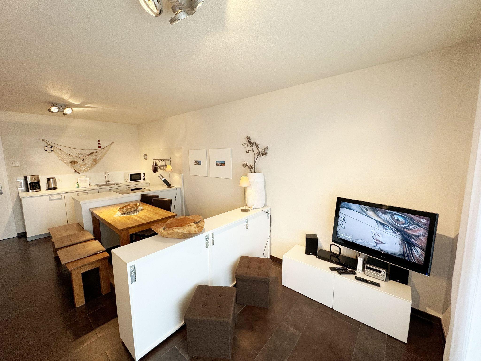 Die hochwertige 2-Zimmer Nichtraucherwohnung ?Düne 9 befindet sich im 1. OG und verfügt über eine Wohnfläche von ca. 50 qm. Ideal ist die Wohnung für 3 Erwachsene geeignet. Der zu der Wohnung gehörende überdachte und bestuhlte Balkon mit Sonnenschirm hat eine sonnige Süd/West Ausrichtung mit transparenter Balkonabtrennung und lädt zum Verweilen ein. Das großzügige Wohnzimmer ist mit einem Essbereich (Esstisch 1,40m x 75 cm, 2 Lederstühlen und Holzbank), einer Leselampe, einer geschmackvollen weißen Wohnzimmereinrichtung und einem Relaxsofa (kann zu einer Schlaffunktion für die 3. Person ausgeklappt werden, 1,40m x 2,00m) ausgestattet. Der angrenzende Küchenbereich umfasst ein 4-Zonen Ceranfeld, Backofen, Kühlschrank, Geschirrspüler, Mikrowelle, Wasserkocher, Mixer, Toaster, Kaffeemaschine, Eierkocher und diverse Küchenutensilien. Abgerundet wird der Wohnbereich von einem LCD-Flachbildschirm (32 Zoll / Full HD), kleine Hi-Fi Compactanlage mit CD und USB und einen DVD/Blu-Ray-Player. Auch im Urlaub brauchen Sie auf einen Internetanschluss (WLAN) nicht verzichten. Dieser ist für Sie inklusive. Das Schlafzimmer ist mit einem Doppelbett (1,80m x 2,00m) und Nachttischkonsolen ausgestattet. Das offene Schranksystem und der zusätzliche Spiegelschrank bieten genügend Stauraum für Ihre Kleidung. Der Wohn- und Schlafbereich sind mit elektrischen Außenjalousien und Insektenschutzgittern versehen und bieten daher einen ungestörten Schlaf. Das hochwertige Bad ist mit einer flachen Glasdusche, WC, Bidet, Waschmaschine (AEG Lavamat), Waschtisch, Spiegelbeleuchtung, Fön, Kosmetikspiegel und Handtuchheizung ausgestattet. In allen Räumen sorgt eine Fußbodenheizung für angenehme Wärme. Die Wohnung ist für Haustiere nicht erlaubt! Ein eigener PKW-Stellplatz Nr.09 befindet sich auf dem Grundstück, mitgebrachte oder gemietete Fahrräder können im wohnungseigenen Abstellraum untergestellt werden. Die Erstausstattung eines Wäschepaketes (komplette Bettwäsche, 1 Duschhandtuch, 2 kleine Handtücher) können Sie bis 14 Tage vor Anreise gegen einen Aufpreis dazu buchen oder durch eigene ergänzen. Ab 2 gebuchten Paketen erhalten Sie einmalig 1 Geschirrhandtuch und 1 Duschvorleger hinzu.