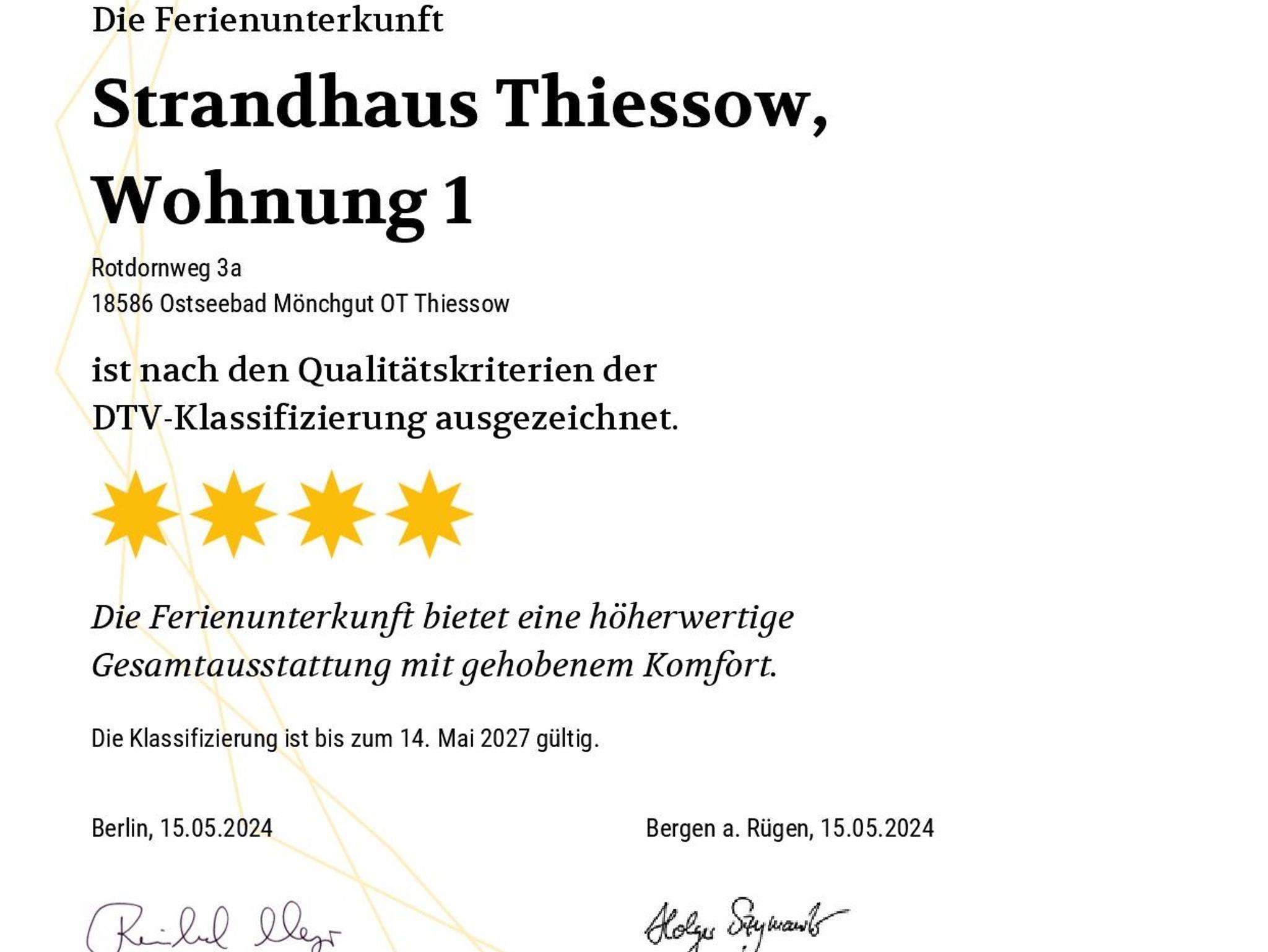 Die 86 m ² große und mit 4 DTV Sternen klassifizierte Ferienwohnung befindet sich im Erdgeschoss im Strandhaus Thiessow. Sie bietet mit ihren drei Zimmern ausreichend Platz für bis zu 4 Personen.