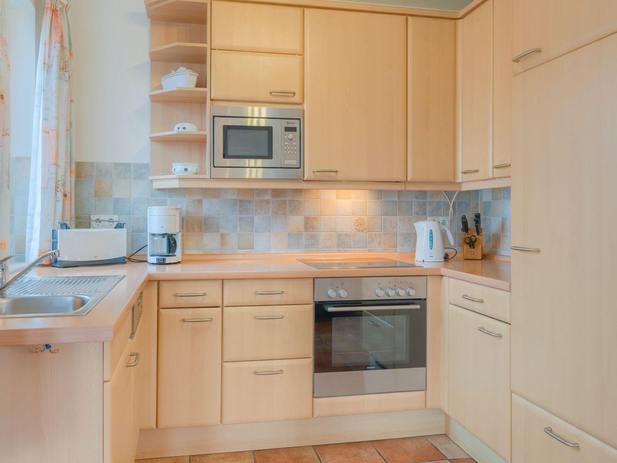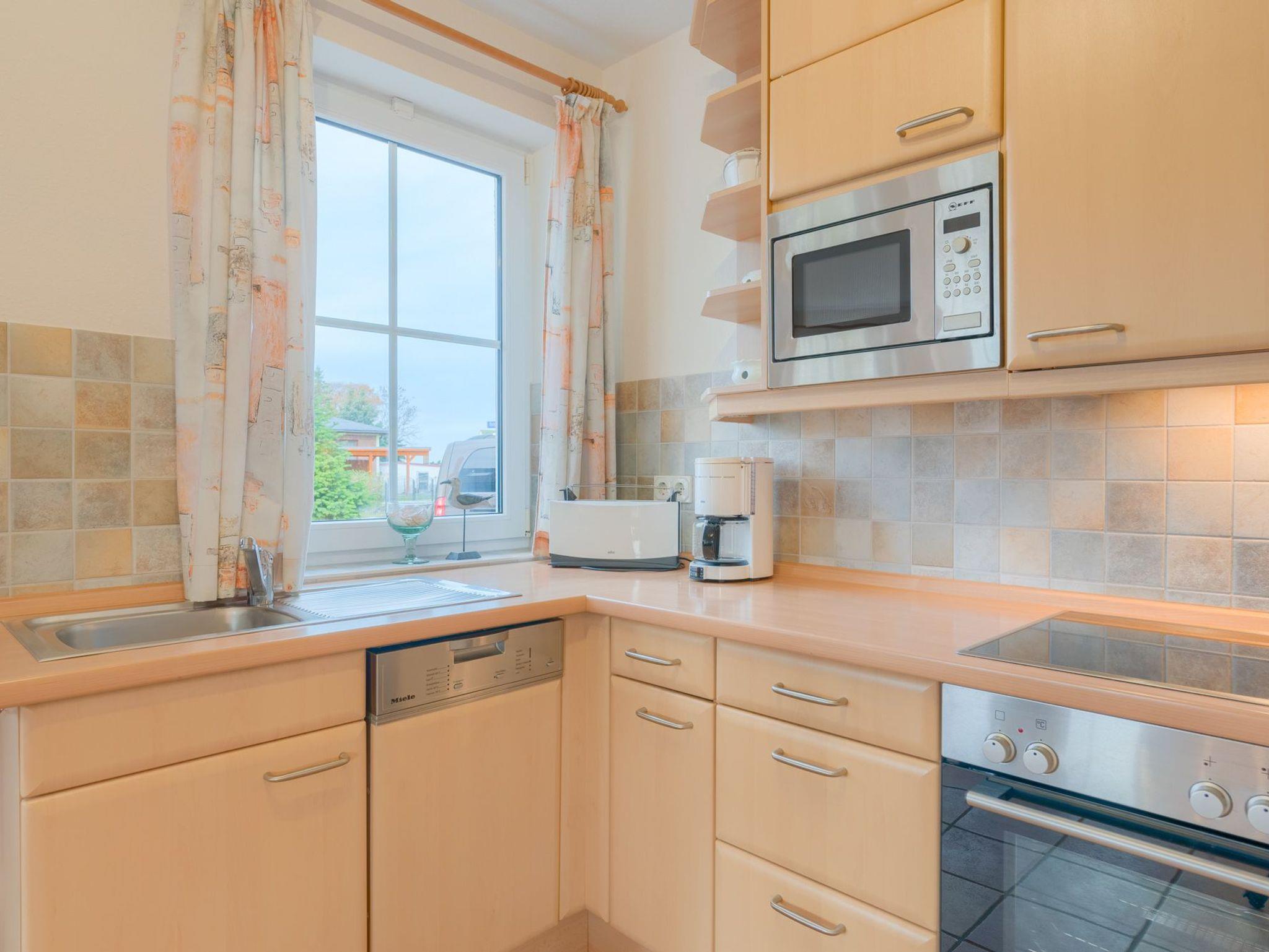 Die hier angrenzende Küchenzeile ist mit einem Kühlschrank mit Gefrierfach, einem Geschirrspüler, einem Backofen mit Cerankochfeld und einer Mikrowelle ausgestattet. Eine Kaffeemaschine, ein Toaster, ein Eierkocher und ein Wasserkocher stehen Ihnen hier selbstverständlich zur Verfügung.