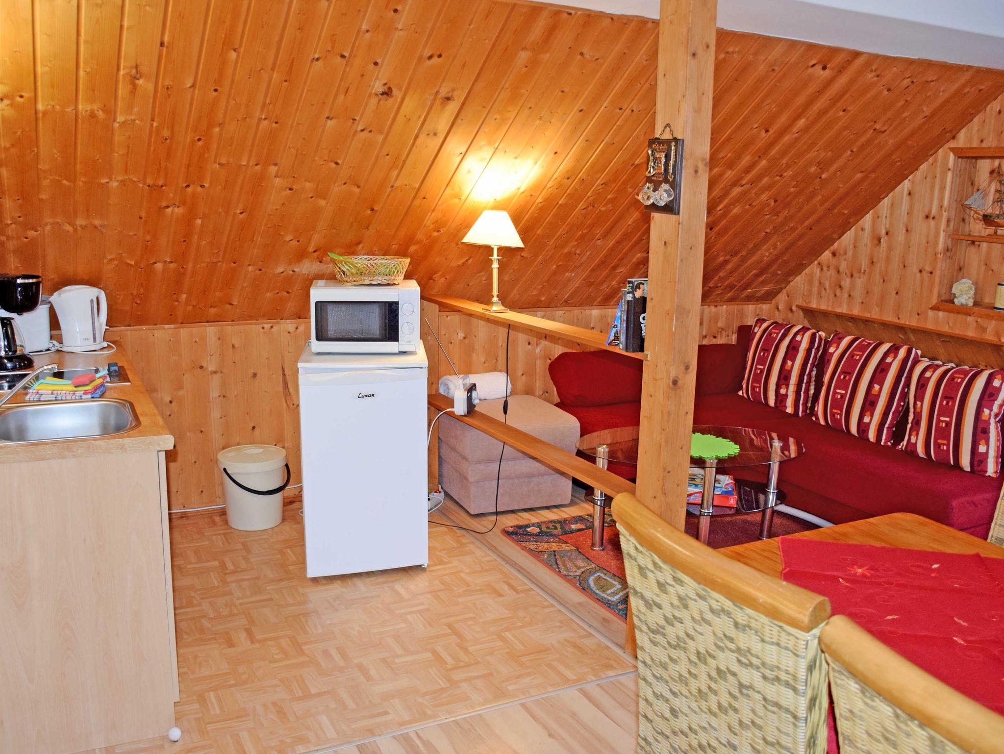 Im großen Wohnzimmer stehen eine Sitzgruppe mit Tisch und Sesseln, ein Esstisch mit Stühlen und ein Schrank mit TV - Gerät. Die Couch kann bei Bedarf für zwei Gäste aufgebettet werden. Ein kleines Kinderreisebett und ein Hochstuhl können auf Wunsch kostenlos bereit gestellt werden.