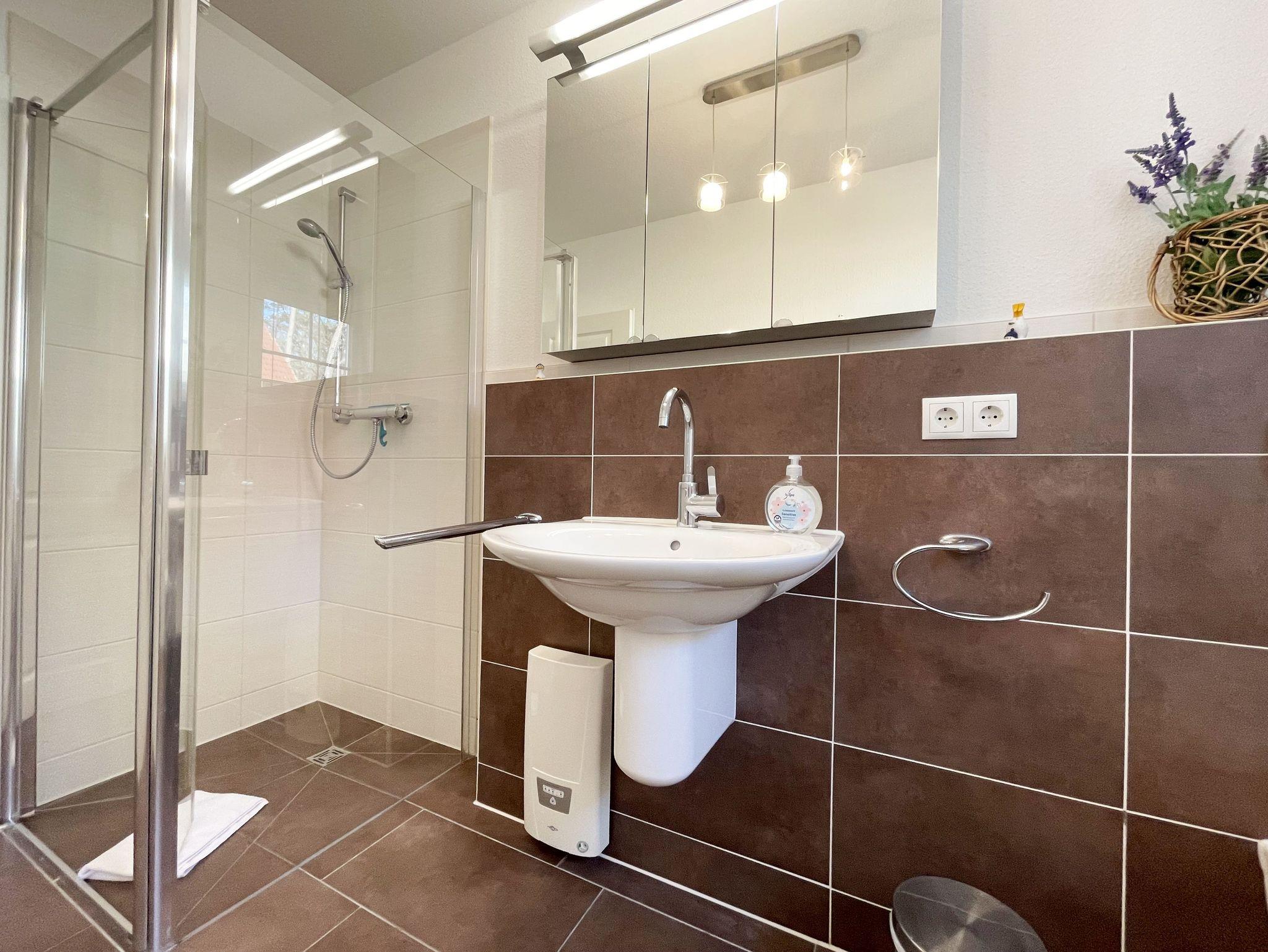 Die Nichtraucherferienwohnung Nr. 05 LEON befindet sich im Erdgeschoss des Hauses und verfügt über eine Wohnfläche von ca. 54 qm. Die Ferienwohnung ist für 2 bis max. 4 Personen ausgelegt. Im kombinierten Wohn- und Essbereich befindet sich eine integrierte Küchenzeile. Die komplett ausgestattete Küchenzeile verfügt über ein Cerankochfeld, Backofen, Dunstabzugshaube, Kühlschrank mit Gefrierfach, Spülmaschine, Kaffeemaschine, Mikrowelle, Wasserkocher, Toaster und weitere diverse Küchenutensilien. Der Esstisch mit Bestuhlung ist für 4 Personen geeignet. Das im Wohnbereich vorhandene Schlafcouch verfügt über eine Ausziehfunktion und kann von 2 Personen gut genutzt werden (1,48m x 1,95m). Ein kleiner Couchtisch, eine Mini-Stereoanlage mit DAB-Radio, USB-Anschluss, Bluetooth und ein Flachbildfernseher runden den Wohnbereich ab. Von hier aus gelangen Sie auf die nach Süd/West ausgerichtete Terrasse mit Tisch und 4 Stühlen. Die Terrassenfenster haben Außenjalousien. Auch im Urlaub brauchen Sie auf einen Internetanschluss (WLAN) nicht verzichten. Dieser ist für Sie inklusive. Das im Schlafbereich vorhandene Doppelbett hat eine Größe von 1,80 m x 2,00 m mit H2/H3 Matratzen sowie verstellbare Lattenroste. Außerdem verfügt das Zimmer über Nachttischkonsolen und einen Kleiderschrank, zur Unterbringung der Kleidung. Das komfortable Bad rundet mit einem WC, Waschtisch, Fön, Dusche und Handtuchwärmeheizkörper die Wohnung komplett ab. In allen Räumen sorgt eine Fußbodenheizung für angenehme Wärme. Die bestuhlte Terrasse erreichen Sie vom Wohnbereich, welche zusätzlich mit einem Sonnenschirm ausgestattet ist. Insektenschutzgitter sind vorhanden. Ein eigener PKW-Stellplatz (Nr.05) befindet sich auf dem Grundstück. Mitgebrachte oder gemietete Fahrräder können im wohnungseigenen Abstellraum untergestellt werden. Haustiere sind nicht erlaubt. Die Erstausstattung eines Wäschepaketes (komplette Bettwäsche, 1 Duschhandtuch, 2 kleine Handtücher) können Sie bis 14 Tage vor Anreise gegen einen Aufpreis dazu buchen oder durch eigene ergänzen. Ab 2 gebuchten Paketen erhalten Sie einmalig 1 Geschirrhandtuch und 1 Duschvorleger dazu.
