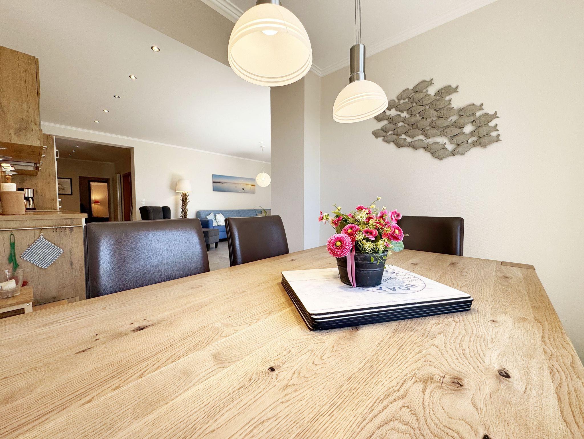 Die Ferienwohnung (Nichtraucher) Nr. 1, ca. 97 m², befindet sich im Erdgeschoss eines 6 Familienhauses auf 4.500 m² großem Grundstück in Einzellage ohne Publikums- und PKW-Verkehr. Die Wohnung ist nach Süden ausgerichtet und verfügt über zwei Badezimmer, zwei verdunkelbare Schlafzimmer, einen ca. 36 m² großen Wohn- und Essbereich sowie einer nicht einsehbaren ca. 25 m² Südterrasse. Es stehen 5 Betten (2 Doppelbetten - (Größe 1,80 m x 2,00 m) und 1 Einzelbett 0,90m x 2,00m) sowie eine Schlafcouch (1,30m 2,00m) zur Verfügung. Die Matratzen der Doppelbetten haben die Härtegrade 2 und 3. Das ausziehbare Schlafsofa verfügt über eine hochwertige Kaltschaummatratze. Die Wohnung kann mit bis zu 6 Personen belegt werden. Vom Wohnbereich und der Terrasse eröffnet sich ein weiter Blick über die unmittelbar vor dem Haus gelegene Ostsee. Die einzigen Geräusche sind der Wind und das Rauschen des Meeres. Die Wohnung erfüllt in ihrer Ausstattung höchste Ansprüche. Erlesene Baumaterialien und Einrichtungsgegenstände vermitteln ein Gefühl des Genießens von Luxus. Nur beispielhaft sei erwähnt, dass das Badezimmer mit Granitwaschtisch, Fön, Fußbodenheizung und Handtuchheizkörper eingerichtet ist. In dem Flur-, Wohn- und Schlafraum sind hochwertige italienische Lake-Stone-Fliesen verlegt worden. Die Ausstattung besteht aus handgearbeiteten Massivholzmöbeln und komfortablen Betten. Die moderne, helle Küche beinhaltet einen Backofen und Ceran-Kochfeld, geräumigen Kühlschrank mit Gefrierfach und Geschirrspülmaschine. Die Küchenausstattung enthält an Kleinelektrogeräten Toaster, Kaffeemaschine, Wasser- und Eierkocher sowie Handmixer. Der Essbereich ist möbliert mit einem massiven Tisch aus geölter Wildeiche und Lederschwingstühlen in der Farbe mocca. Flachbildfernseher, Internetanschluss WLAN, sowie Mini-Stereo Anlage mit USB sind vorhanden. Eine original finnische Sauna mit moderner Dusche und Ruheliegen steht allen Gästen gegen Gebühr zur Verfügung. Die Terrasse ist mit komfortablen Möbeln für ein Genießen von Sonne, der nahen See und einem gemütlichen Beisammensein ausgerichtet. Die Parkplätze und ein überdachter Fahrradunterstand stehen kostenlos zur Verfügung. Ein ca. 3.000 m² großes Rasengrundstück, am Haus und an der Ostseeküste gelegen, steht zur Freizeitgestaltung mit Grillplatz zur Verfügung. Für unsere kleinen Gäste steht 1x Kinderreisebett (ohne Zusatzmatratze, ohne Bettinlett) und 1 Hochstuhl inklusive bereit. 1 Haustier ist gegen eine Gebühr ein gern gesehener Gast. Die Erstausstattung eines Wäschepaketes (komplette Bettwäsche, 1 Duschhandtuch, 2 kleine Handtücher, 2 Geschirrhandtücher) können Sie bis 14 Tage vor Anreise gegen einen Aufpreis dazu buchen oder durch eigene ergänzen.