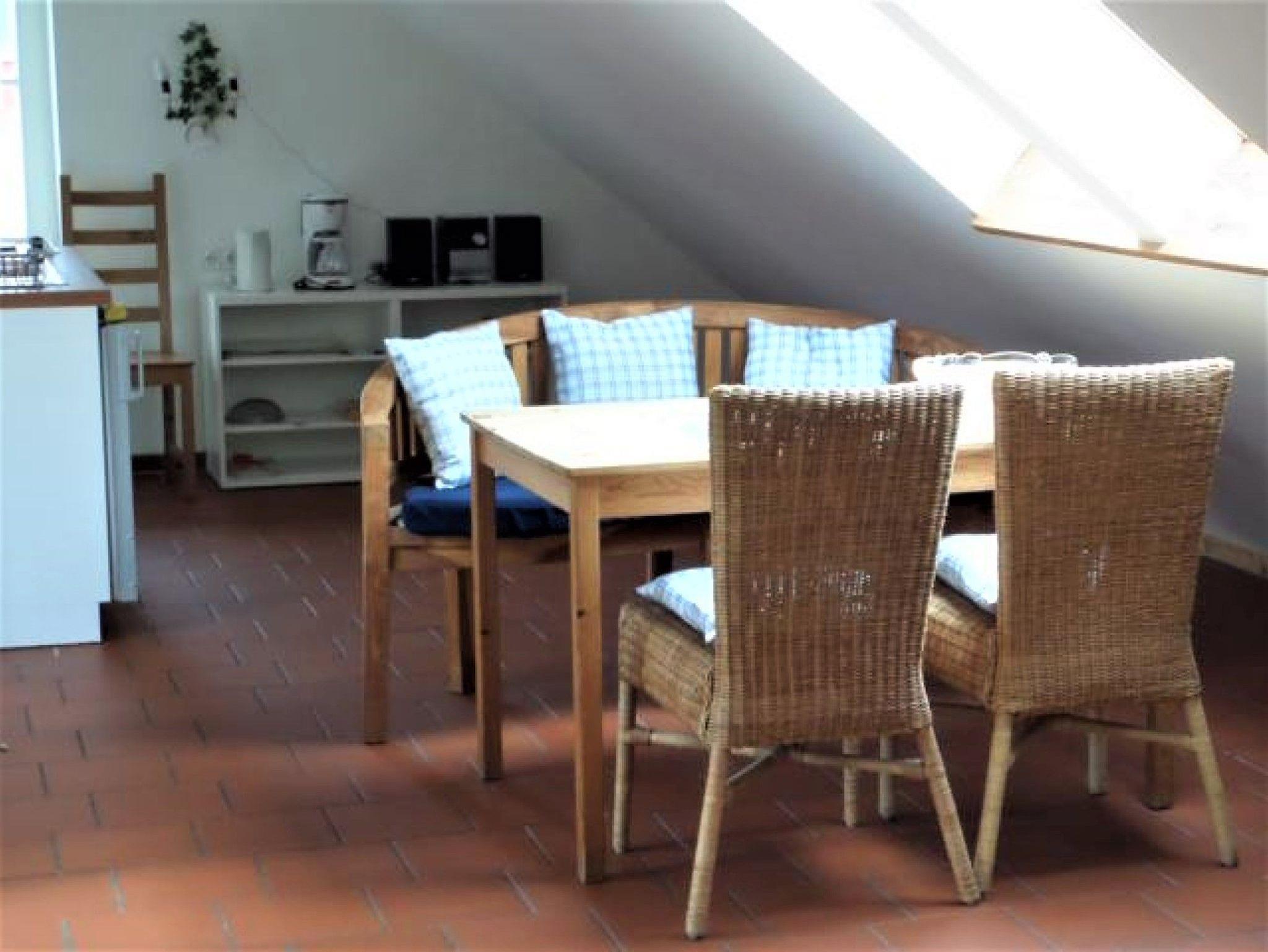 Das Ferienappartement Ruden bietet Platz für max. 3 Gäste. Über eine Außentreppe gelangt man in das Obergeschoss des Hauses, in dem das Appartement liegt. Das Appartement ist von drei Seiten von Küstenwald umgeben und hat daher eine besonders ruhige Lage. In dem großzügigen Wohn-/Schlafraum befindet sich eine Sitzcouch mit Tisch und ein TV-Gerät. Kleine Küchenzeile mit Herd, Kühlschrank, Kaffeemaschine, Toaster und Wasserkocher. Großer Esstisch. Möblierter Südbalkon mit Blick zur Ostsee.