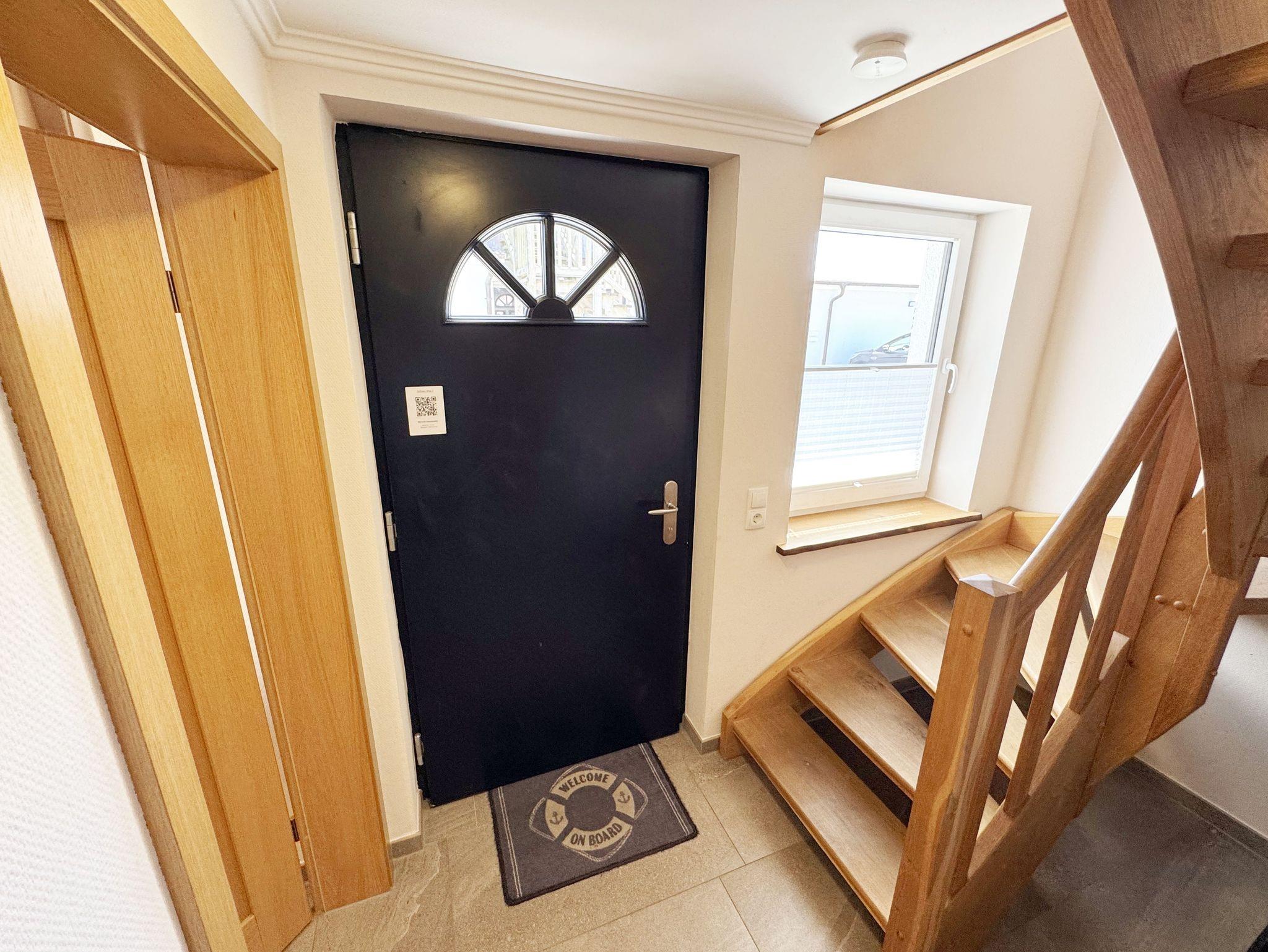 Die hier angebotene Nichtraucherwohnung mit 55 m² für 2 bis 3 Personen + 1 Kleinkind (3 Jahre), befindet sich in einem Doppelhaus. Die Wohnung verfügt im Erdgeschoss über einen Eingangsbereich, ein luxuriöses Bad mit Granitwaschtisch, Echtglasdusche, Handtuchheizkörper, Fön und Fußbodenheizung sowie ein Schlafzimmer mit Doppelbett in der Größe 180 x 200 cm. Die Matratzen haben einen Härtegrad von 2 und 3. Die Möbel sind cremefarbig. Verdunklungsvorhänge in Sand- und Blautönen runden das Bild ab. Ein Einzelbett (0,90m x 2,00m) befindet sich zusätzlich im Schlafzimmer. Das Erdgeschoss ist mit hochwertigen italienischen Lake-Stone-Fliesen ausgestattet. Über eine massive Eichenholztreppe gelangt man in die obere Etage. Hier erwartet Sie der gemütliche Wohnbereich (ca. 25m²) mit Eichen-Parkettfußboden, einer offenen, modernen Küche mit Cerankochfeld, Backofen, Geschirrspülmaschine und einem Kühlschrank mit Gefrierfach. Die Küchenausstattung enthält an Kleinelektrogeräten einen Toaster, eine Kaffeemaschine, einen Handmixer sowie einen Wasser- und Eierkocher. Komfortable blau/beige Polstermöbel mit einem ausziehbaren Schlafsofa, einem Esstisch aus massiver, geölter Wildeiche, Edelstahl-Schwingstühlen mit Lederbezügen in der Farbe mocca, Flachbildfernseher und Mini-Stereoanlage sowie WLAN (inklusive) runden das Bild ab. Große Giebelfenster ausgestattet mit Insektenschutz und Plissees. Als Besonderheit zeichnet diese Wohneinheit aus, das Sie einen Blick sowohl über den Bodden in Richtung Tiessow und ebenfalls auf die Ostsee über das Kitesurfer-Gebiet erlaubt. Eine original finnische Sauna mit moderner Dusche und Ruheliegen steht allen Gästen gegen Gebühr zur Verfügung. Die Parkplätze und ein überdachter Fahrradunterstand stehen kostenlos zur Verfügung. Ein ca. 3.000 qm großes Rasengrundstück, nahe am Haus und unmittelbar vor der Ostseeküste gelegen, steht zur Urlaubsgestaltung mit Strandkorb und bequemer Sonnenliege zur Verfügung. Ebenfalls kann ein Kinderspielplatz und ein mit bequemen Sitzgelegenheiten ausgestatteter Grillplatz genutzt werden. Für unsere kleinen Gäste steht 1x Kinderreisebett (ohne Zusatzmatratze, ohne Bettinlett) und 1x Hochstuhl inklusive bereit. Haustiere sind nicht erlaubt. Die Erstausstattung eines Wäschepaketes (komplette Bettwäsche, 1 Duschhandtuch, 2 kleine Handtücher, 2 Geschirrhandtücher) können Sie bis 14 Tage vor Anreise gegen einen Aufpreis dazu buchen oder durch eigene ergänzen.