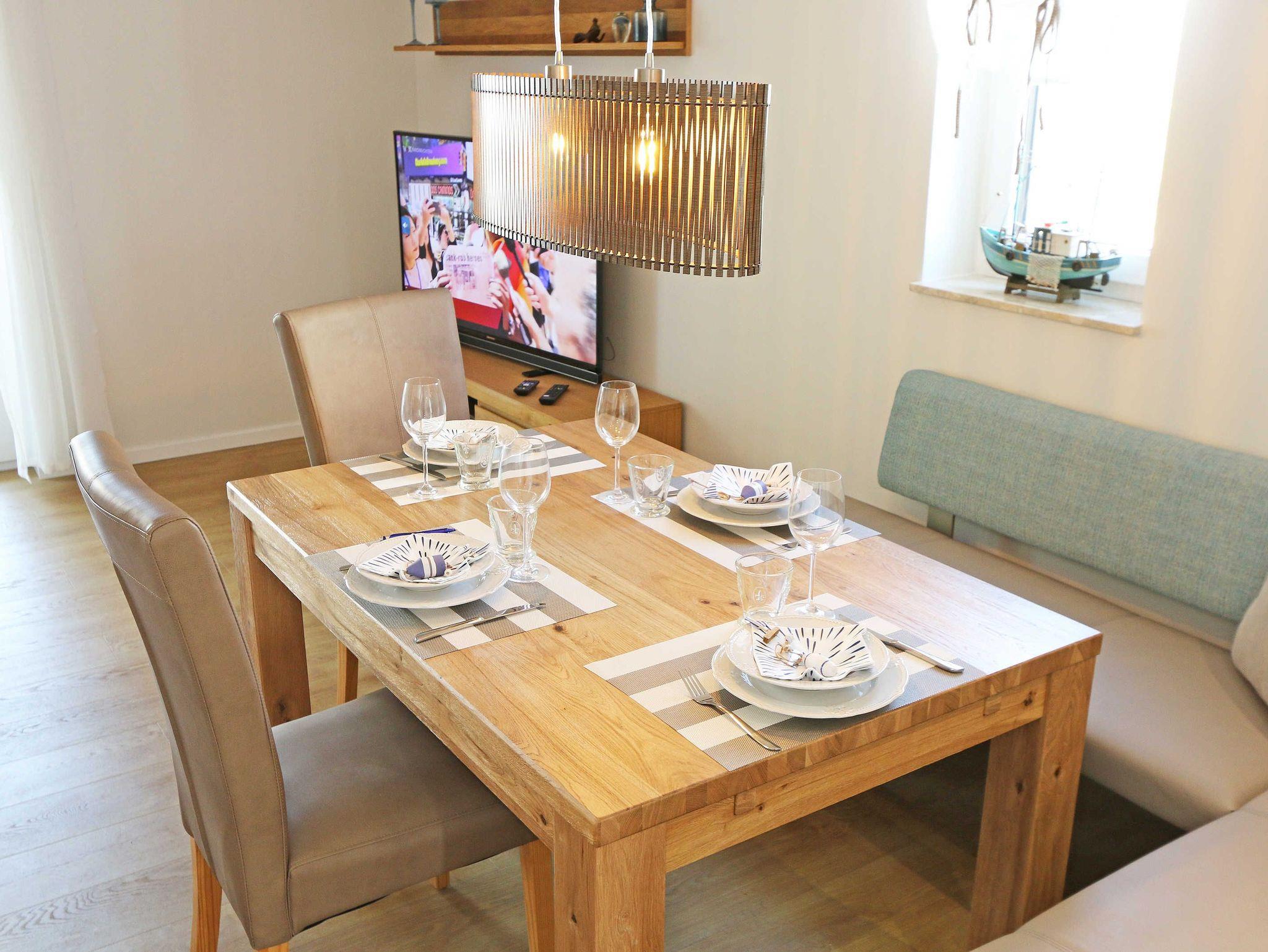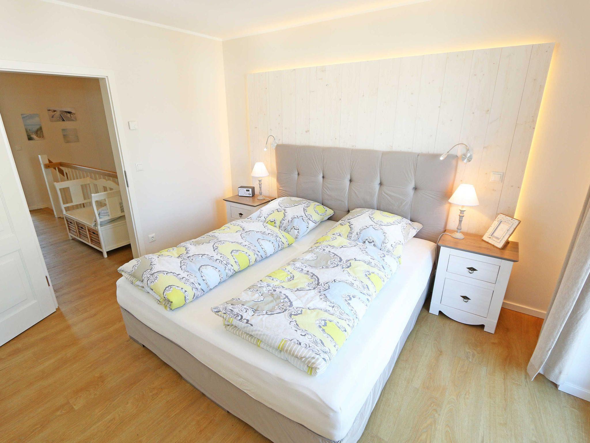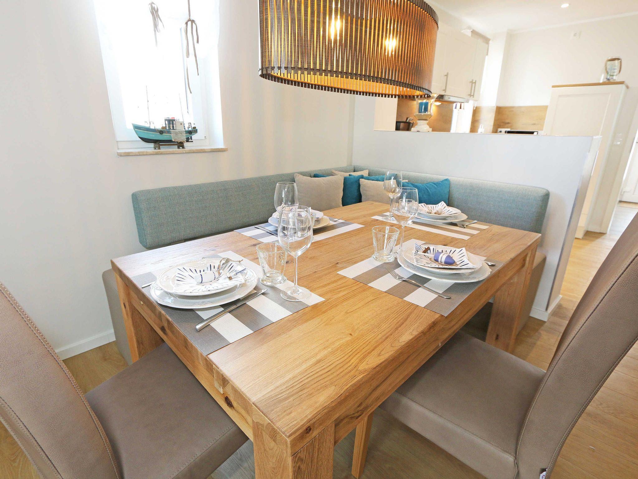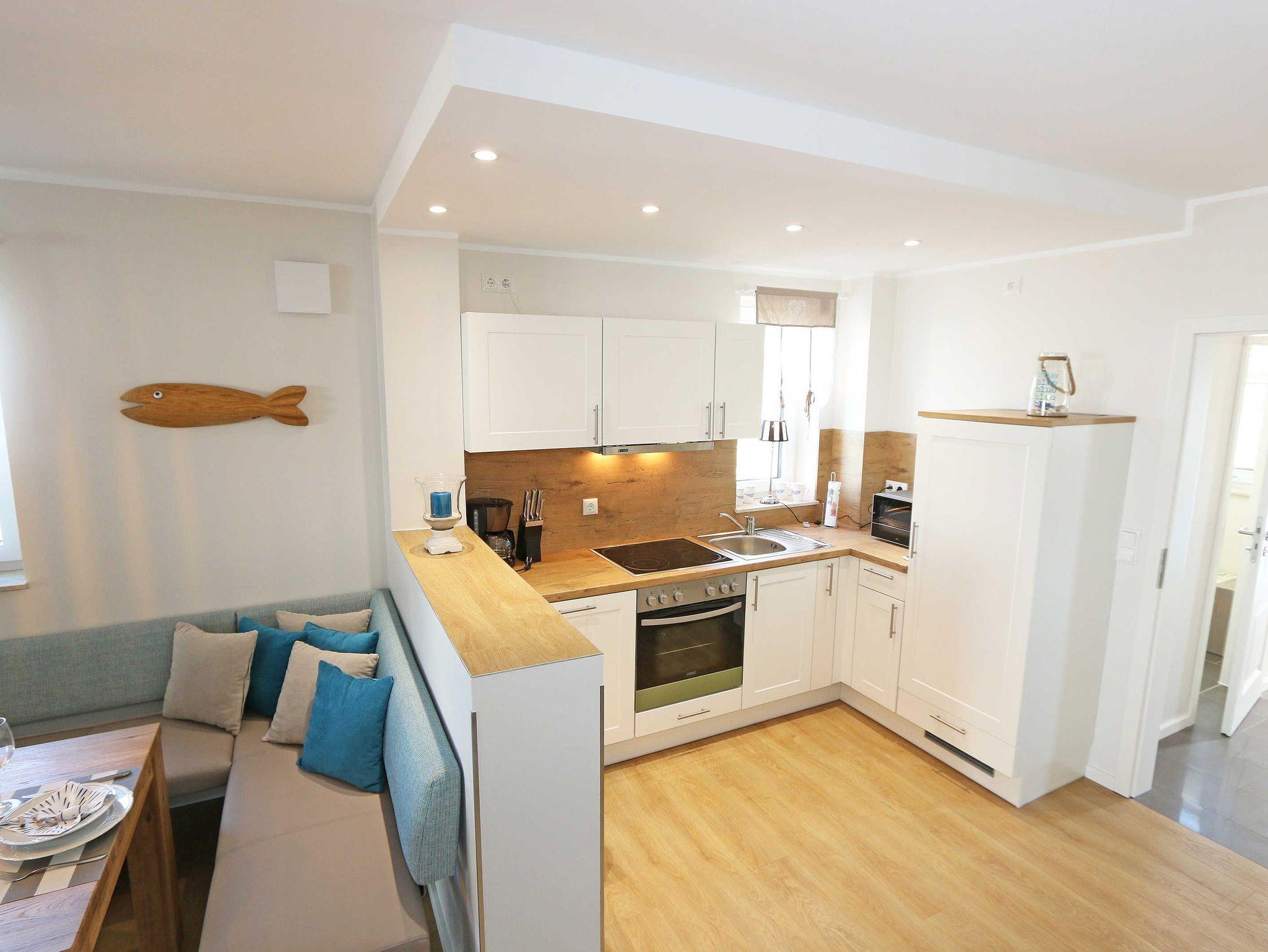 Die 81 qm große Nichtraucherferienwohnung Seehase erstreckt sich über 2 Etagen und bietet Ihnen Platz für 2 bis 4 Personen. Im Erdgeschoss befindet sich ein freundlicher Eingangsbereich mit einer Garderobe und einer Sitzgelegenheit. Daran schließt sich ein Gäste-WC mit Waschplatz. Der offene Wohn-Essbereich ist ausgestattet mit einer gemütlichen Couch, ein Couchtisch, eine Leselampe, ein Lowboard mit großer Smart-TV, mit Blu-Ray-Player, ein DAB-Radio-CD-Player mit USB sowie eine kleine Sammlung an Büchern und Gesellschaftsspielen laden zum Entspannen und Relaxen ein. Auch auf einen Internetzugang (WLAN) müssen Sie im Urlaub nicht verzichten. Dieser ist für Sie inklusive. Im angrenzenden Essbereich steht ein großer Esstisch mit Stühlen und Sitzbank für ein gemütliches Beisammen zur Verfügung. Die offene und integrierte Eck-Küchenzeile mit einem Kühlschrank mit Gefrierfach, einen Geschirrspüler, 4 Zonen Ceranfeld mit Backofen, eine Mikrowelle, eine Kaffeemaschine, Nespresso Maschine, einen Toaster, einen Wasserkocher sowie diverse Küchenutensilien bietet Ihnen somit alles, was man zum Kochen benötigt. Vom Wohnbereich gelangen Sie direkt auf die bestuhlte Terrasse (Süd/West) mit Sonnenschirm. Über eine Treppe vom Wohnbereich gelangen Sie in die obere Etage wo sich die Schlafräume sowie das vollwertige Badezimmer befinden. Das große Schlafzimmer verfügt über ein Boxspringbett (1,80m x 2,00m), mit Nachttischablagen und einem großen Kleiderschrank. Von hier haben Sie den direkten Zugang zum Balkon (Süd/West) wo Sie nicht nur am Tag, sondern auch in den Abendstunden in der Relax Muschel Zeit verbringen können. Das kleine Schlafzimmer ist mit einem Doppelbett (1,60m x 2,00m) und zwei kleinen Schränken sowie ein Flachbild-TV ausgestattet. Das moderne Tageslichtbad mit Waschplatz, WC, Fön, Kosmetikspiegel, einer ebenerdigen Glasdusche und einem Handtuchtrockner runden den Sanitärbereich ab. Alle Räumlichkeiten sind mit einer Fußbodenheizung ausgestattet und können durch Fensterläden verdunkelt werden. Der PKW kann auf dem kostenfreien Stellplatz (Nr.01) direkt vor dem Haus geparkt werden. Gerne dürfen Sie 1 Hund gegen eine Gebühr mitbringen. Da kein Schlafplatz (Körbchen, Decke, etc.) vorhanden ist, bringen Sie bitte Ihr eigenes ?Bettchen? für den Hund mit. Direkt am Haus befindet sich ein Grillplatz mit Sitzgelegenheiten. Ihre mitgebrachten oder geliehenen Fahrräder können Sie in den zur Wohnung gehörenden Abstellraum unterbringen. Die Erstausstattung eines Wäschepaketes (komplette Bettwäsche, 1 Duschhandtuch, 2 kleine Handtücher) können Sie bis 14 Tage vor Anreise gegen einen Aufpreis dazu buchen oder durch eigene ergänzen. Ab 2 gebuchten Paketen erhalten Sie einmalig 1 Geschirrhandtuch und 1 Duschvorleger hinzu. Wir wünschen Ihnen einen traumhaften Urlaub an der Ostsee, erholen Sie sich gut und genießen Sie die Zeit.