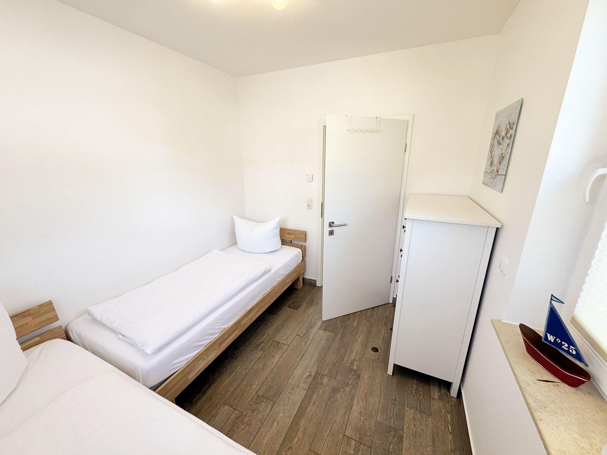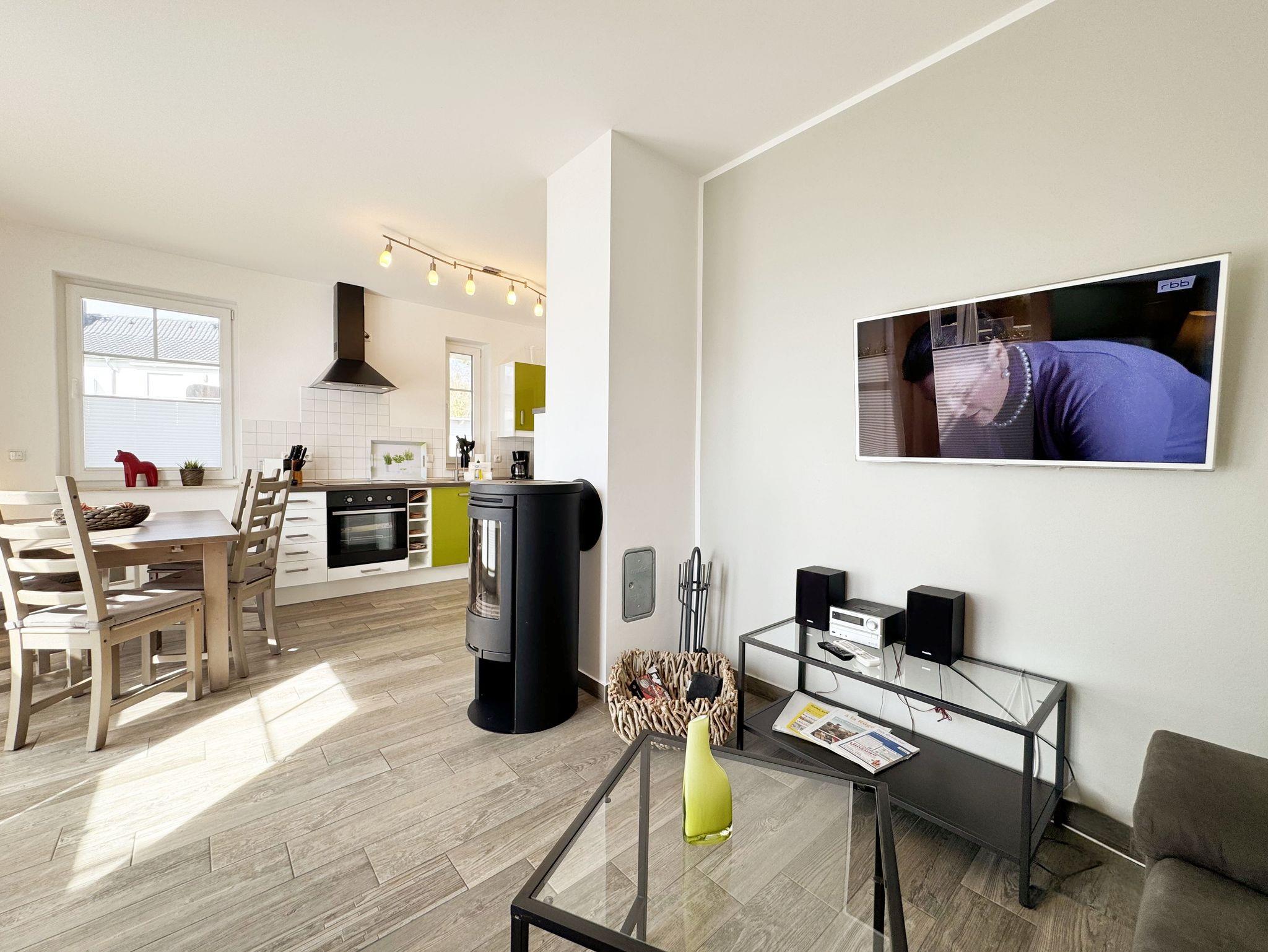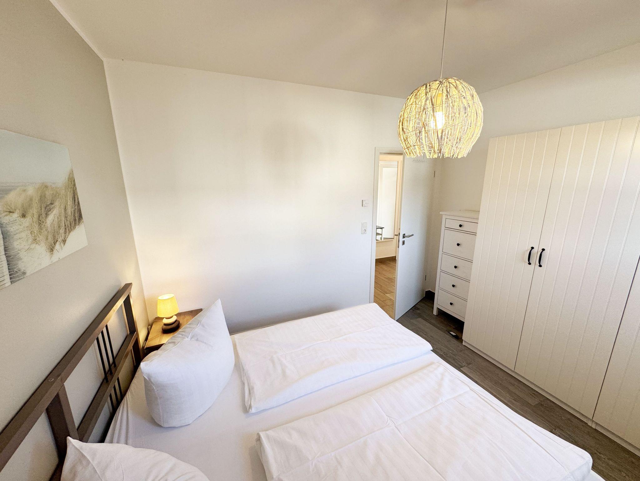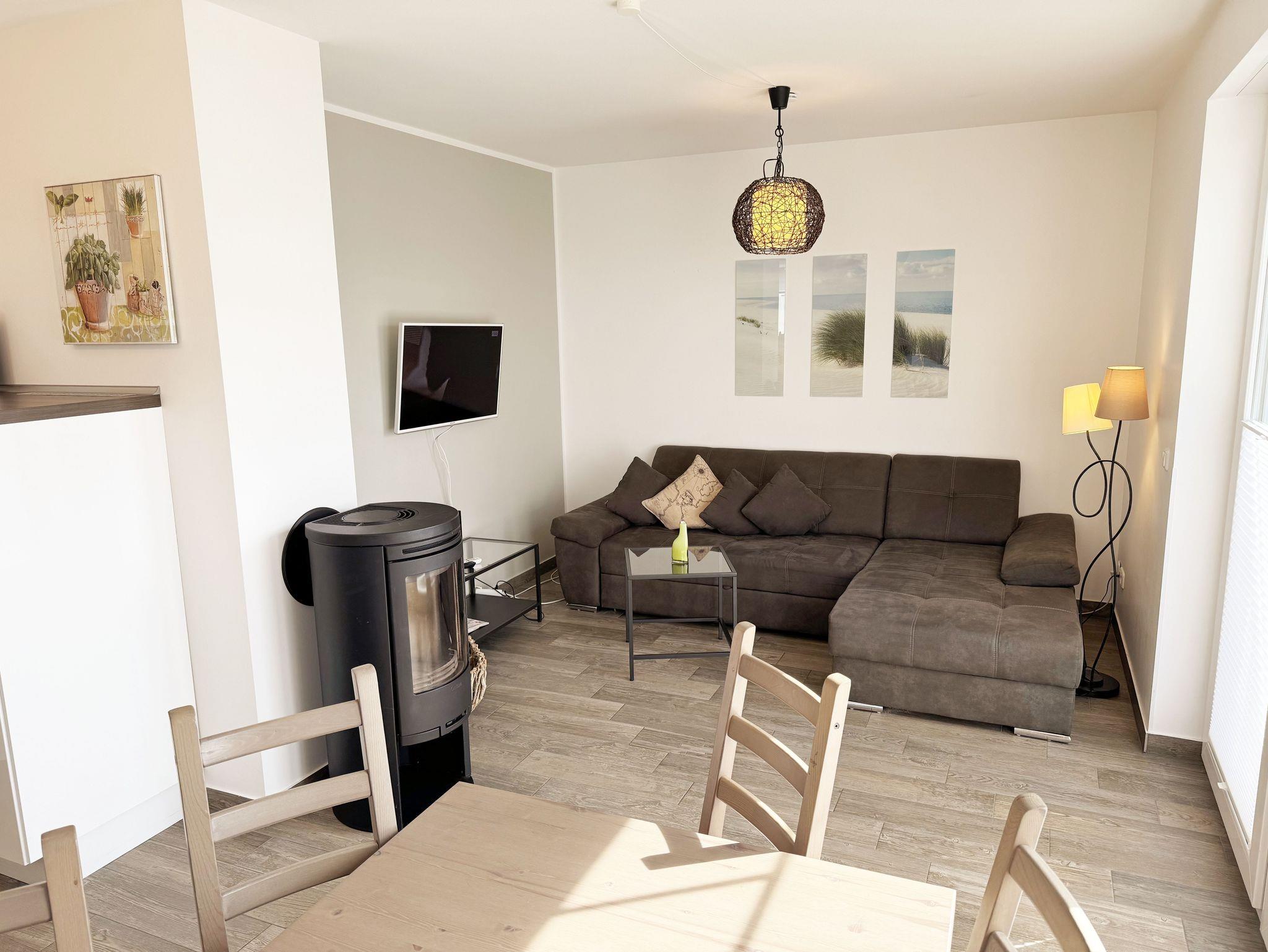 Die komfortable ca. 65 m² große, lichtdurchflutete 3-Zimmer-Wohnung (Nichtraucher) befindet sich im Erdgeschoss des Hauses Möwe. Sie ist über einen überdachten und separaten Eingang an der Giebelseite des Hauses zu erreichen und perfekt für 2 bis 4 Erwachsene +1 Kleinkind bis 3 Jahre im Kinderreisebett. Im Flur finden Sie eine Garderobe nebst Sitzbank, von wo Sie auch alle Räumlichkeiten erreichen. Der kombinierte Wohn-/Essbereich ist mit einer gemütlichen Couchecke samt Couchtisch und einer Stehlampe, einem Smart-TV und einer Mini-Stereo-Anlage incl. USB-Anschluss ausgestattet. Abgerundet wird es durch einen WLAN-Zugang. Für gemütliche Stunden in der kalten Jahreszeit steht Ihnen zusätzlich ein Kaminofen zur Verfügung. Angrenzend zum Wohnbereich befindet sich die moderne Küchenzeile mit einem Cerankochfeld, einem Backofen, einer Mikrowelle, einem Geschirrspüler, einem Kühlschrank mit Gefrierfach, einer Kaffeemaschine, einem Wasserkocher, einer Nespresso Maschine, einem Toaster und anderen praktischen Küchenutensilien. Ergänzend passt sich der Esstisch an. Von hier gelangen Sie auf Ihre ca. 16m² große und bestuhlte Südwest-Terrasse mit einem Sonnenschirm sowie einen zugehörigen kleinem Gartenanteil und Holzkohlegrill. Das große Schlafzimmer verfügt über ein Doppelbett (1,80m x 2,00m), verstellbare Lattenroste, Nachttischablagen und einen geräumigen Kleiderschrank mit Safe. Im kleinen Schlafzimmer befinden sich zwei Einzelbetten (0,90m x 2,00m) mit verstellbaren Lattenrosten und zwei Kommoden. Für einen ruhigen Schlaf sorgen zusätzlich Plissees, elektrische Außenrollos sowie Insektenschutzgitter. Zum innenliegenden Badezimmer gehören eine Dusche mit flachem Einstieg, ein Waschplatz, ein WC, ein beheizter Handtuchhalter, eine Waschmaschine, einen Fön sowie einen Kosmetikspiegel. In der kleinen vom Flur aus erreichbarer Abstellkammer stehen für Sie ein Staubsauger, ein Wäscheständer und Reinigungsutensilien bereit. Alle Räumlichkeiten sind mit durchgehend holzlimitierten Steinfußböden, einer Fußbodenheizung und einer automatischen Be- und Entlüftung ausgestattet. Haustiere sind nicht erlaubt. Der zur Wohnung gehörende PKW-Stellplatz (Nr.03) liegt vis-a-vis Ihrer Eingangstür. Auch der exklusiv durch Sie nutzbare großzügige Abstellraum (Nr. 03) für Ihre oder geliehene Fahrräder, Surf- und Strandutensilien befindet sich in unmittelbarer Nähe auf dem Grundstück. Die Erstausstattung eines Wäschepaketes (komplette Bettwäsche, 1 Duschhandtuch, 2 kleine Handtücher) können Sie bis 14 Tage vor der Anreise gegen einen Aufpreis dazu buchen oder durch eigene ergänzen. Ab 2 gebuchten Paketen erhalten Sie einmalig 1 Geschirrtuch und einen Duschvorleger dazu.